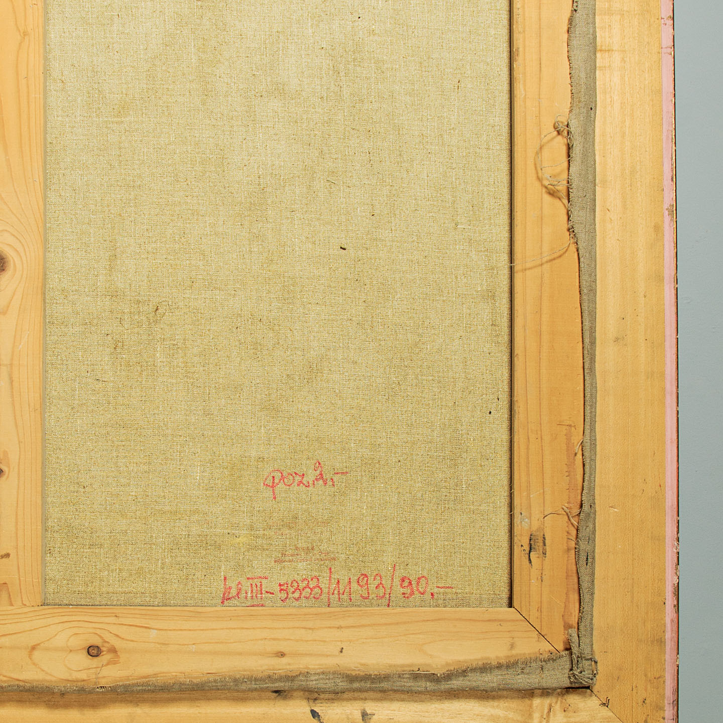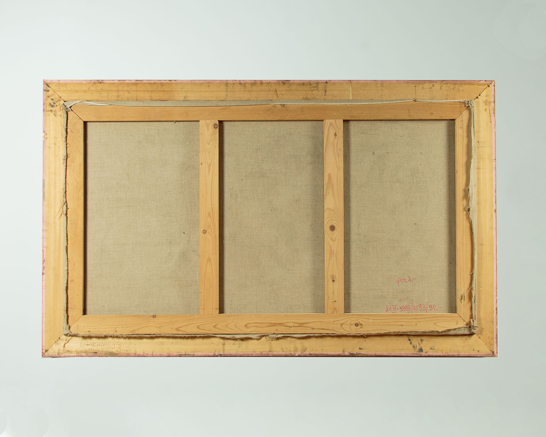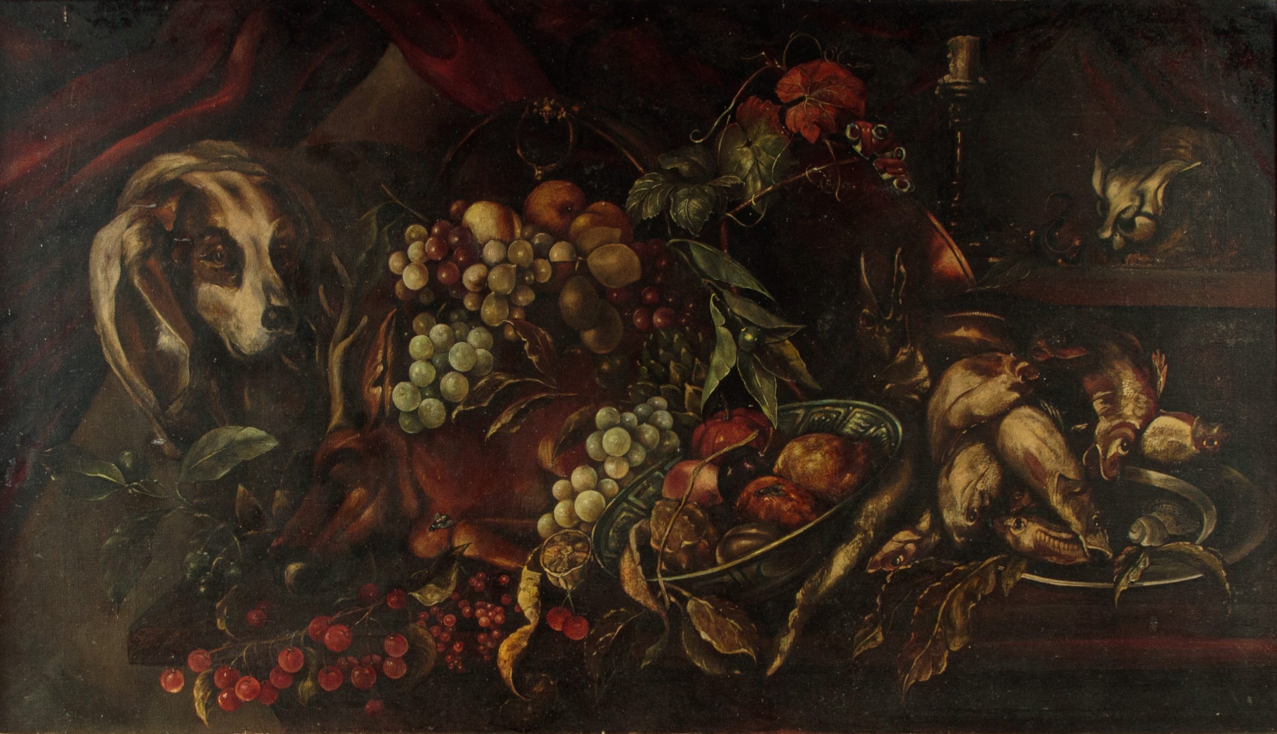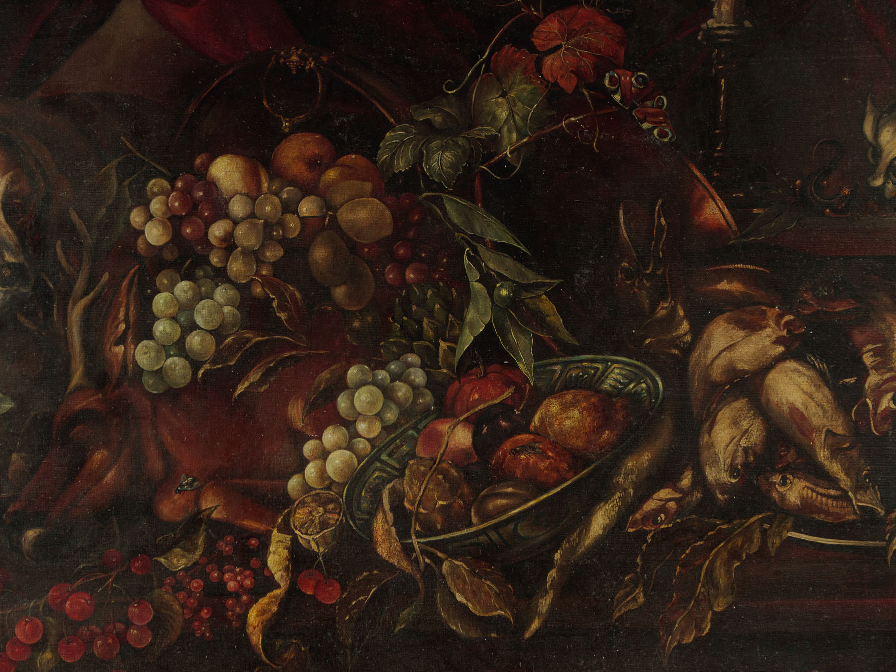 Unusually large style still life oil painting on canvas. 63" x 36" canvas. An 18th.c. style still life composition of a stag's head, fish, various fruits and grapes. A dog overlooks the scene at the left hand side whilst a cat toys with a lizard on a shelf in the upper left hand corner. Note also a couple of flies and the peacock butterfly which have settled on the scene. Presented in a gilded and moulded wooden frame. Good condition.