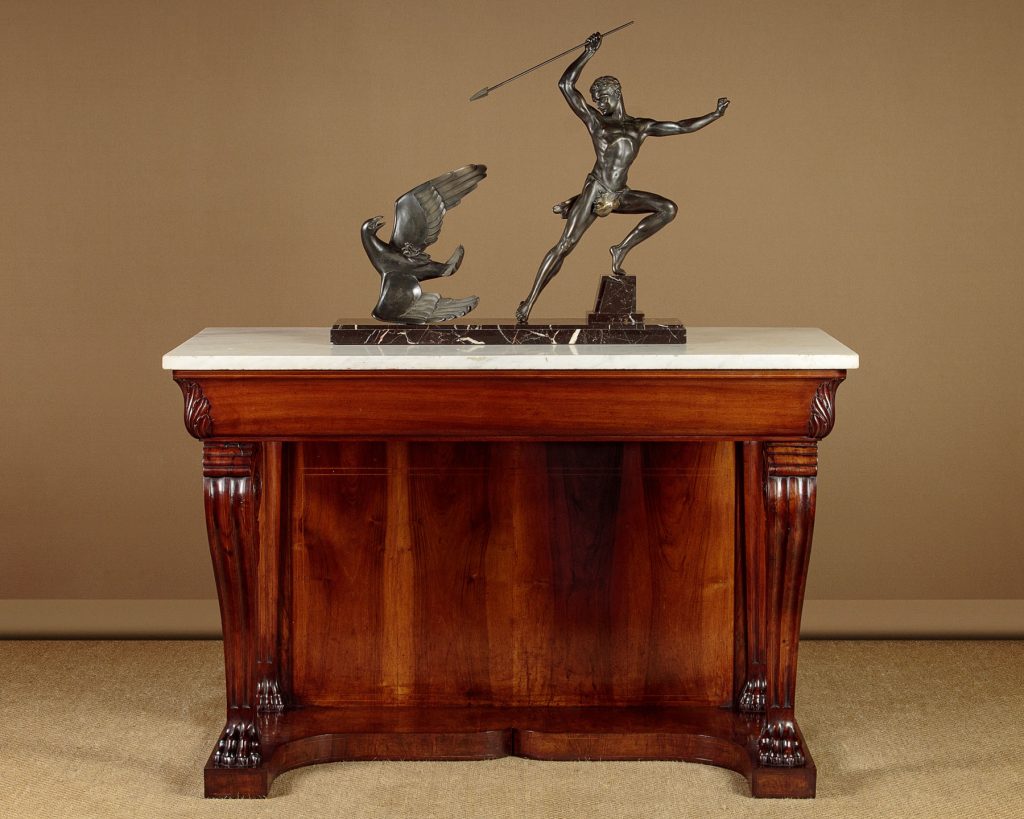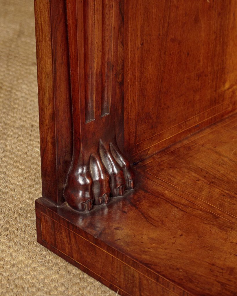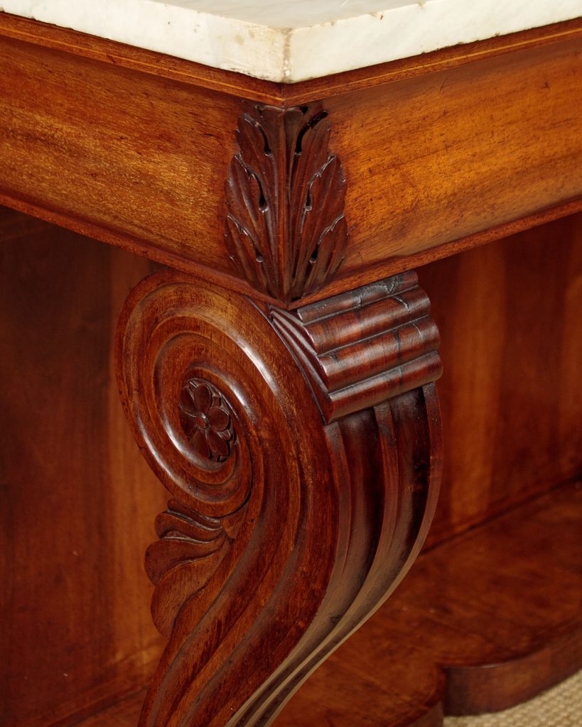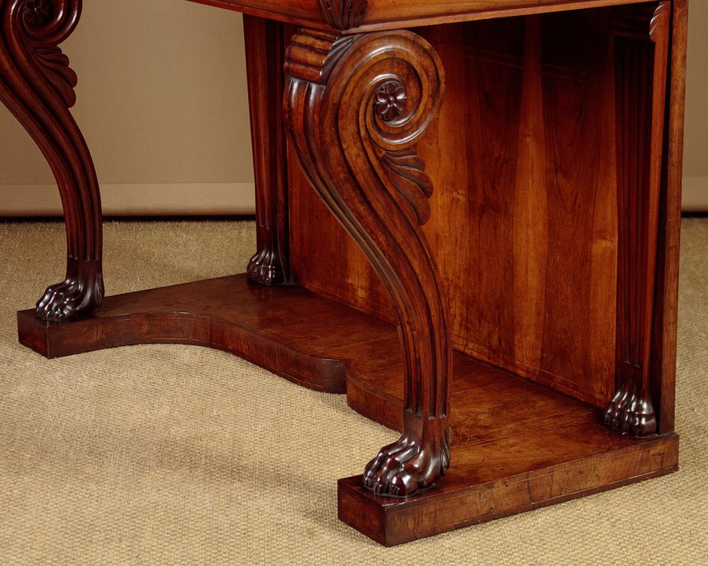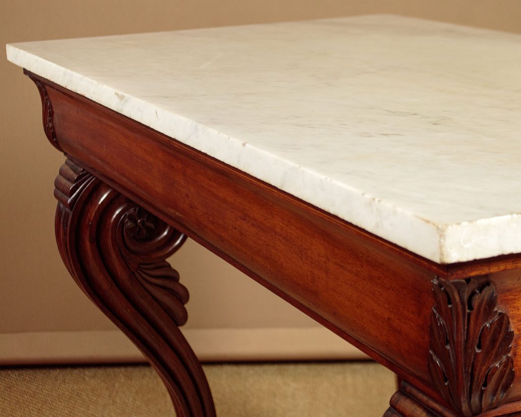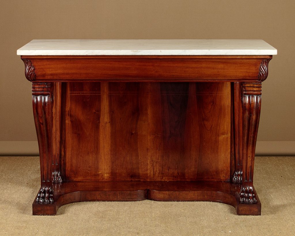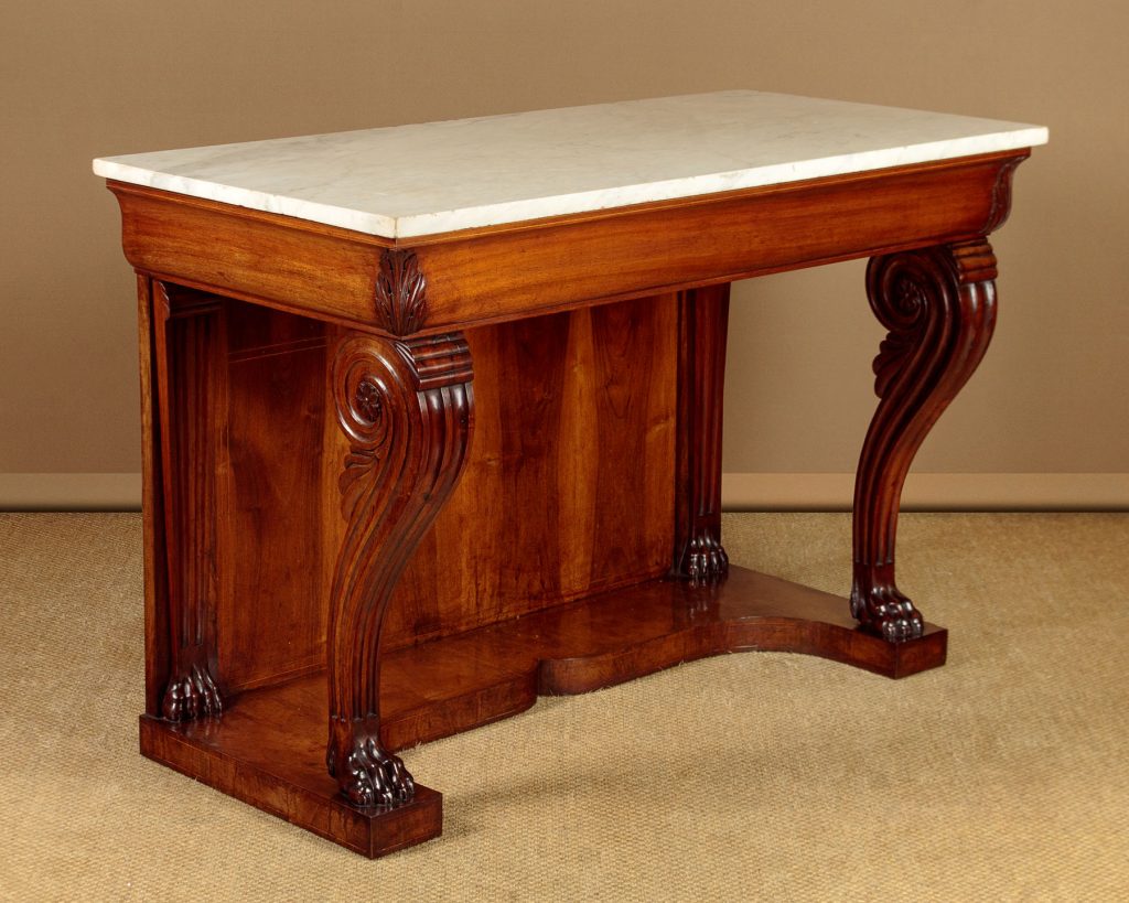 Impressive walnut and marble top console table c.1910. Inch-tick 53" x 26" white marble top. On a walnut base with a shaped apron with acanthus leaf carving at the corners. Raised on large shaped and fluted front legs with scrolling tops and large claw feet. Repeated as straight pilasters at the back flanking a symmetrically arranged walnut panel with inlaid stringing. Cupid's bow shaped plinth veneered and inlaid to match on the top, front and sides. Some chips to the edges of the marble. Otherwise very good condition and excellent colour. Cleaned and waxed in our workshops.