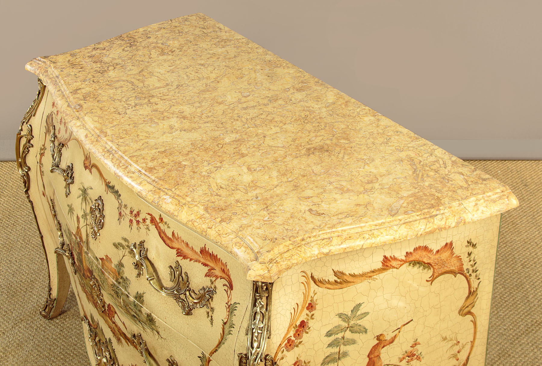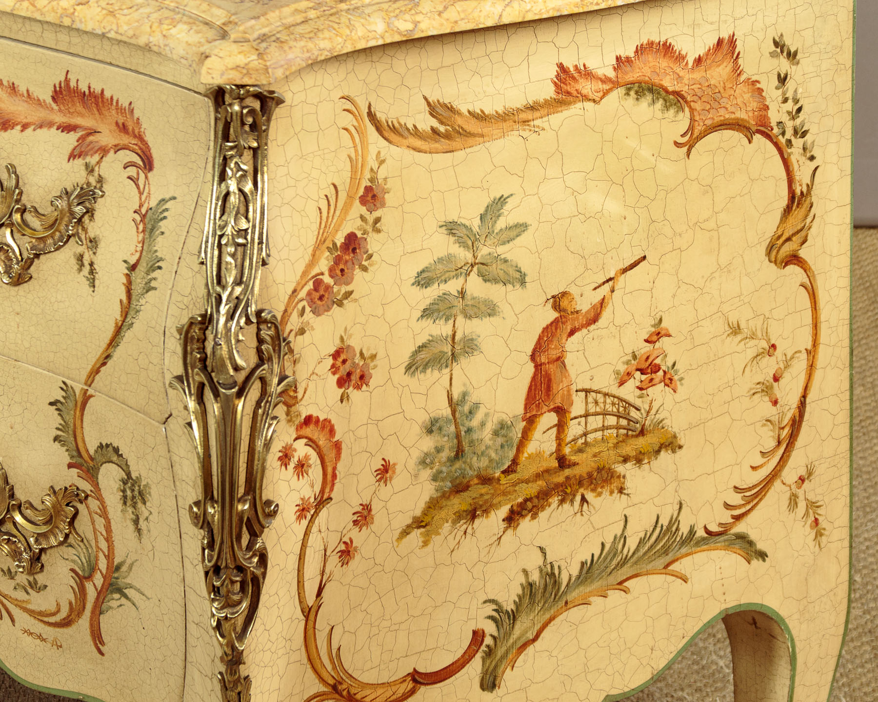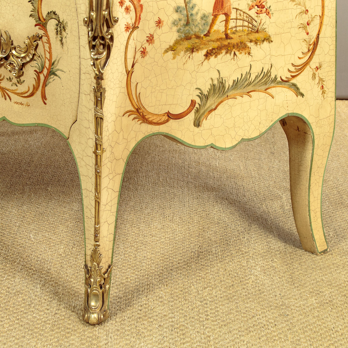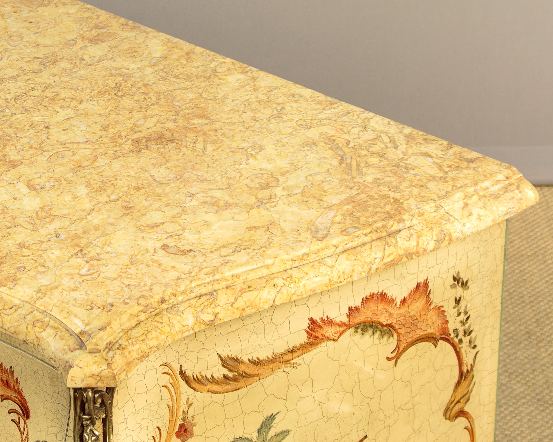 Spectacular Louis XV style French marble top commode with painted decoration c.1920. Original marble top with a serpentine shaped and moulded edge. Over a bombe chest of two large drawers. Lovely hand painted decoration of 18th.c. style chinoiserie scenes to the front and sides, within elaborate foliate borders again a cream ground with crackle effect. Large gilded brass handles and escutcheon plates. Superb large pierced gilded brass mounts to the shoulders running all the way down to the front feet. With another large mount to the shaped apron on the lower drawer front. Chestnut drawer linings. Excellent condition, cleaned and waxed in our workshops.
