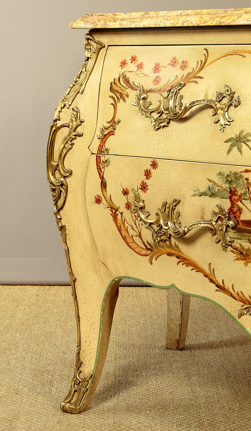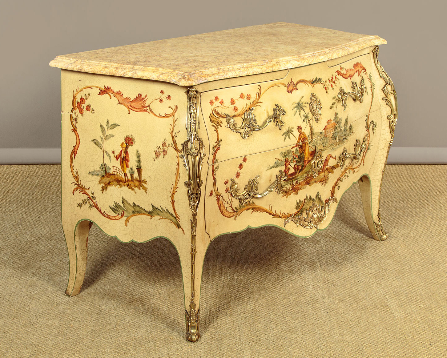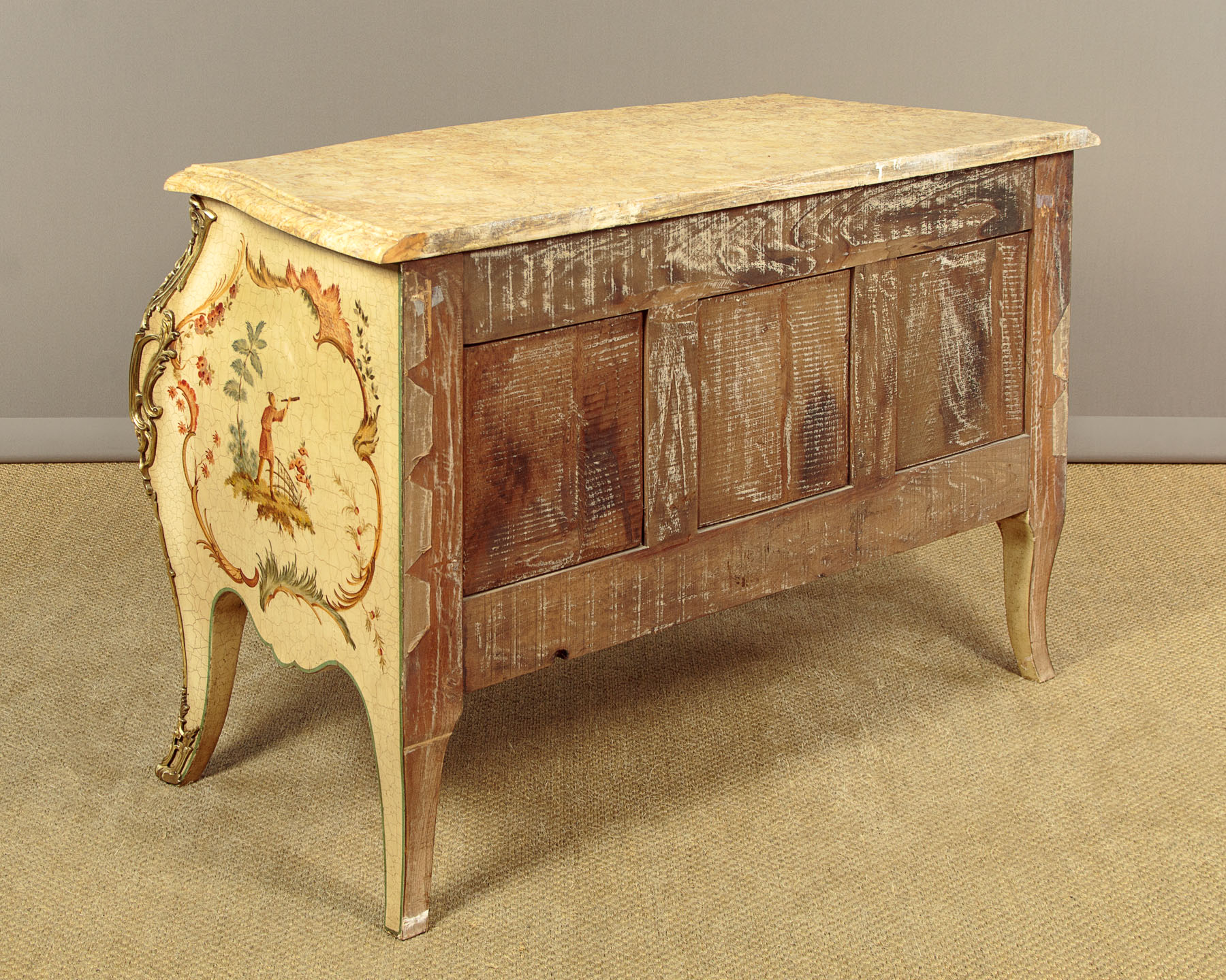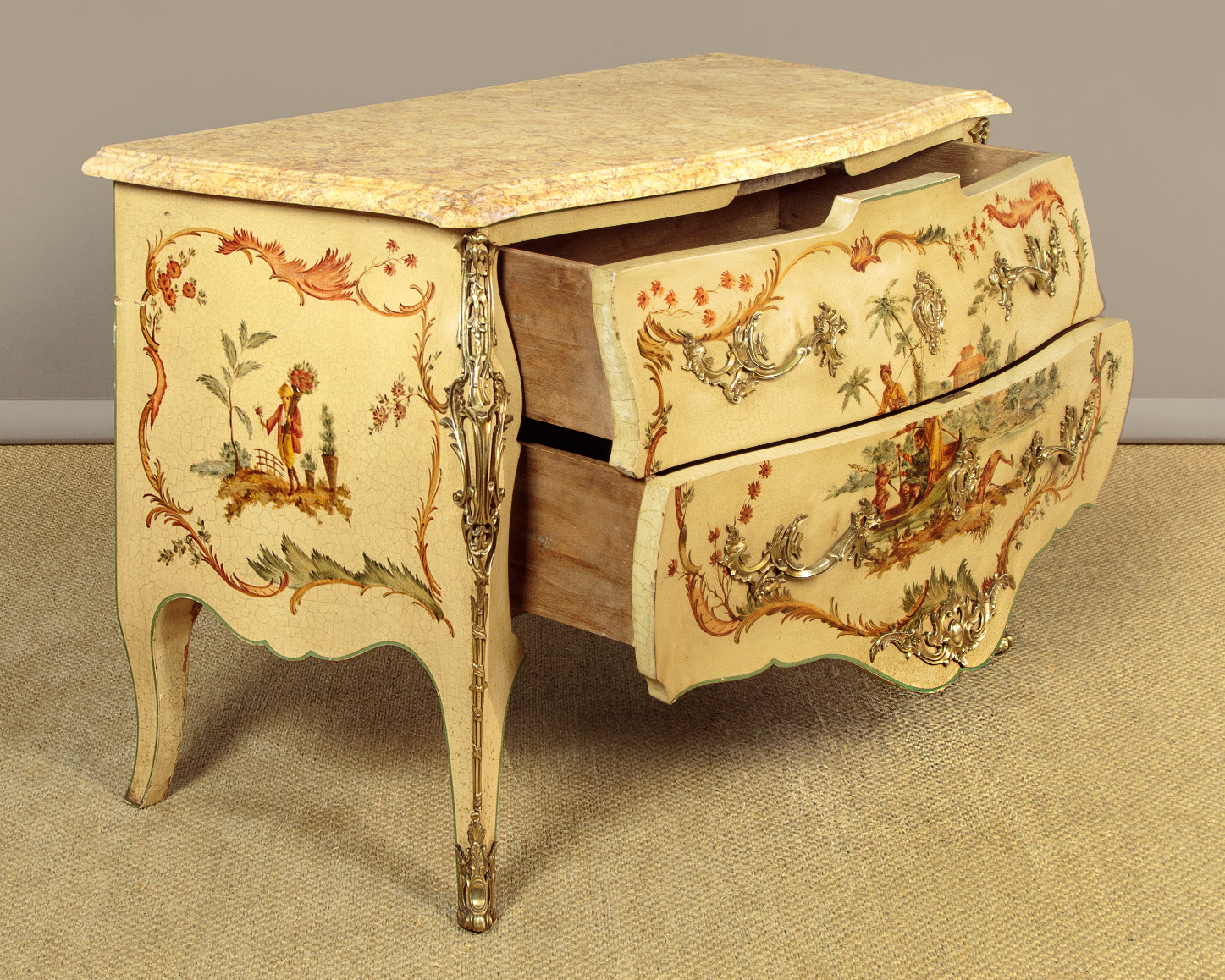 Spectacular Louis XV style French marble top commode with painted decoration c.1920. Original marble top with a serpentine shaped and moulded edge. Over a bombe chest of two large drawers. Lovely hand painted decoration of 18th.c. style chinoiserie scenes to the front and sides, within elaborate foliate borders again a cream ground with crackle effect. Large gilded brass handles and escutcheon plates. Superb large pierced gilded brass mounts to the shoulders running all the way down to the front feet. With another large mount to the shaped apron on the lower drawer front. Chestnut drawer linings. Excellent condition, cleaned and waxed in our workshops.