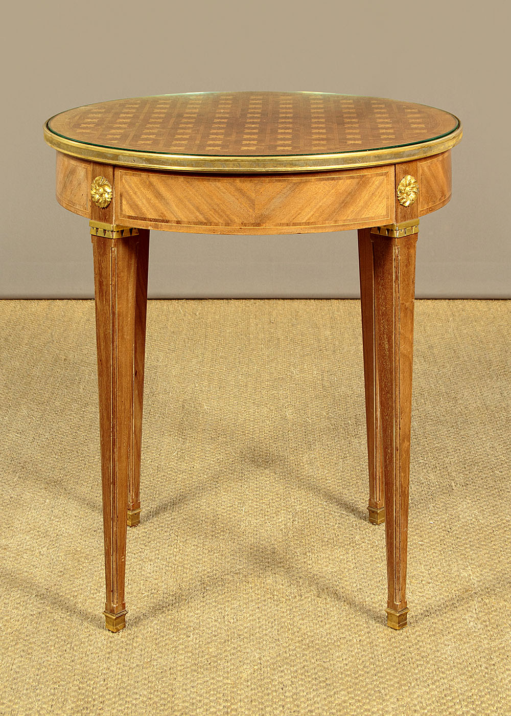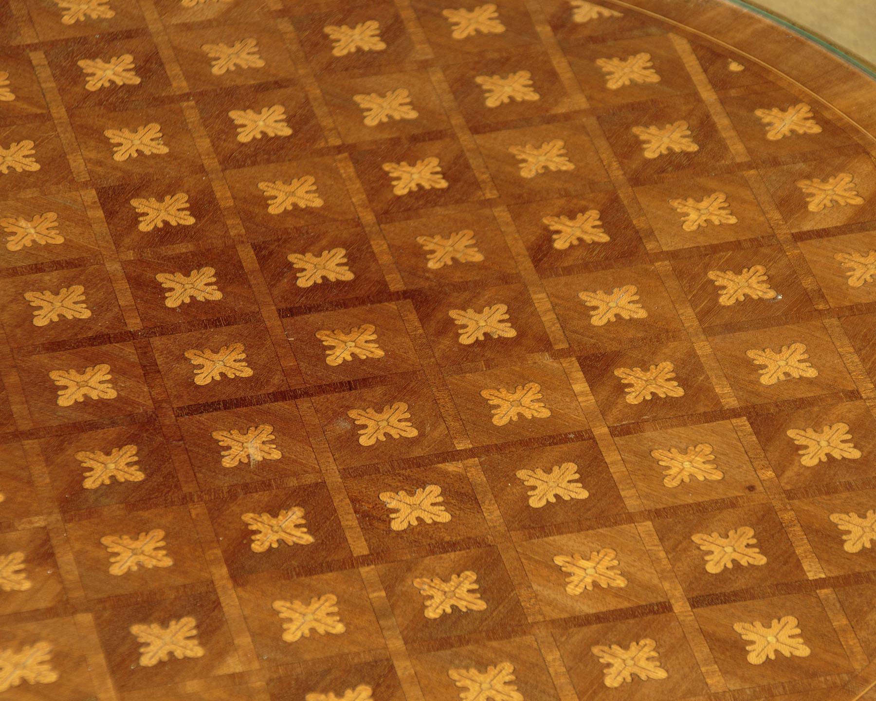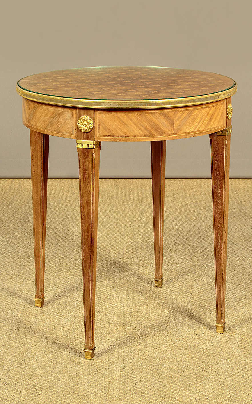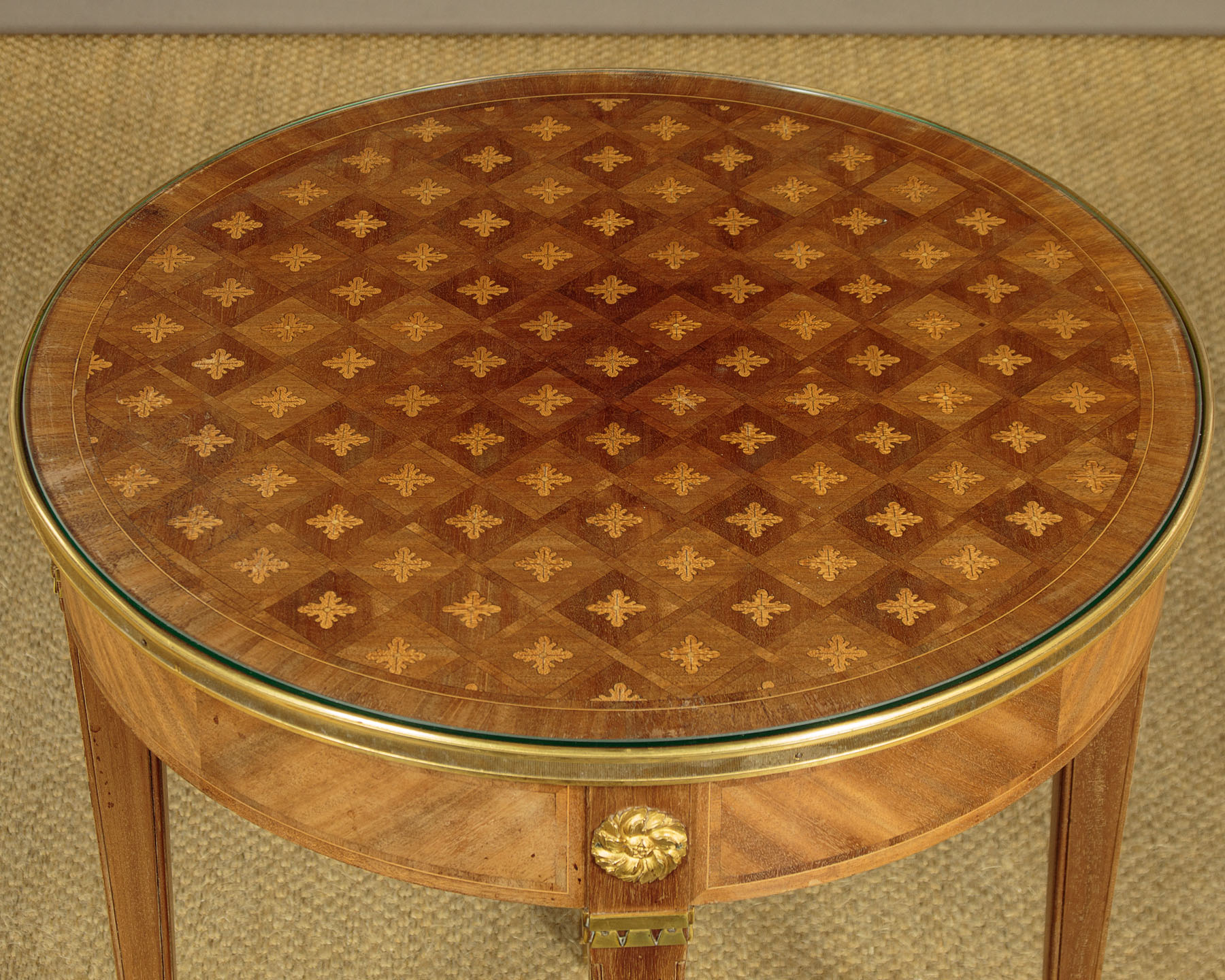 Smart little French Louis XVI style inlaid side table c.1960. Superb top with repeated inlaid detail into the parquetry work ground and with a reeded brass edge moulding which holds a loose glass top snugly in place. Over an inlaid and veneered apron with brass flower head roundels. Raised on slim tapering legs with moulded edges, brass mounts and feet. Very good condition.