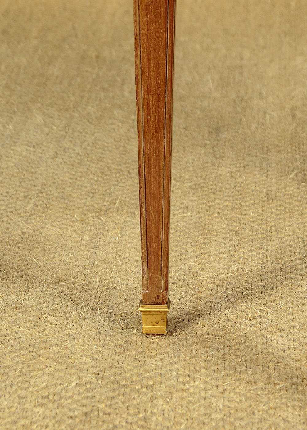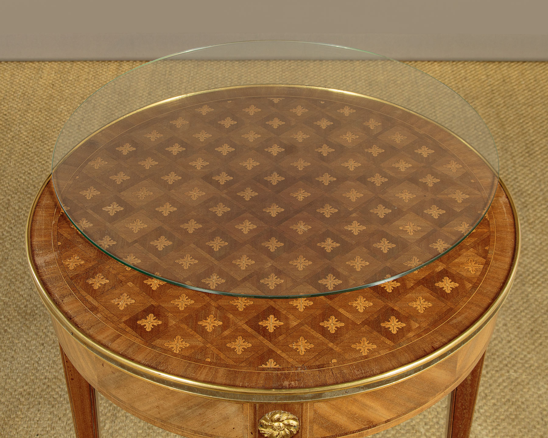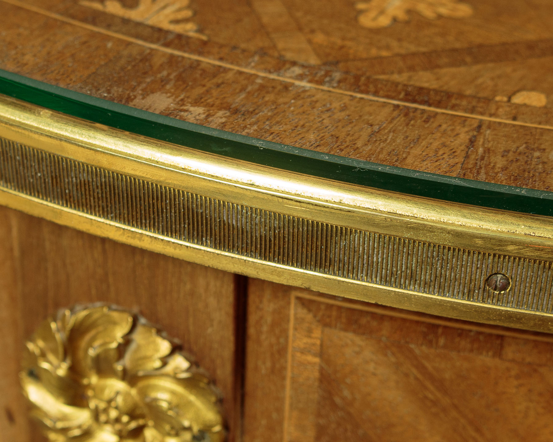 Smart little French Louis XVI style inlaid side table c.1960. Superb top with repeated inlaid detail into the parquetry work ground and with a reeded brass edge moulding which holds a loose glass top snugly in place. Over an inlaid and veneered apron with brass flower head roundels. Raised on slim tapering legs with moulded edges, brass mounts and feet. Very good condition.