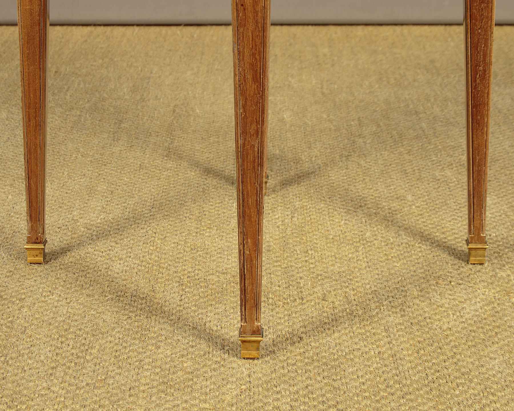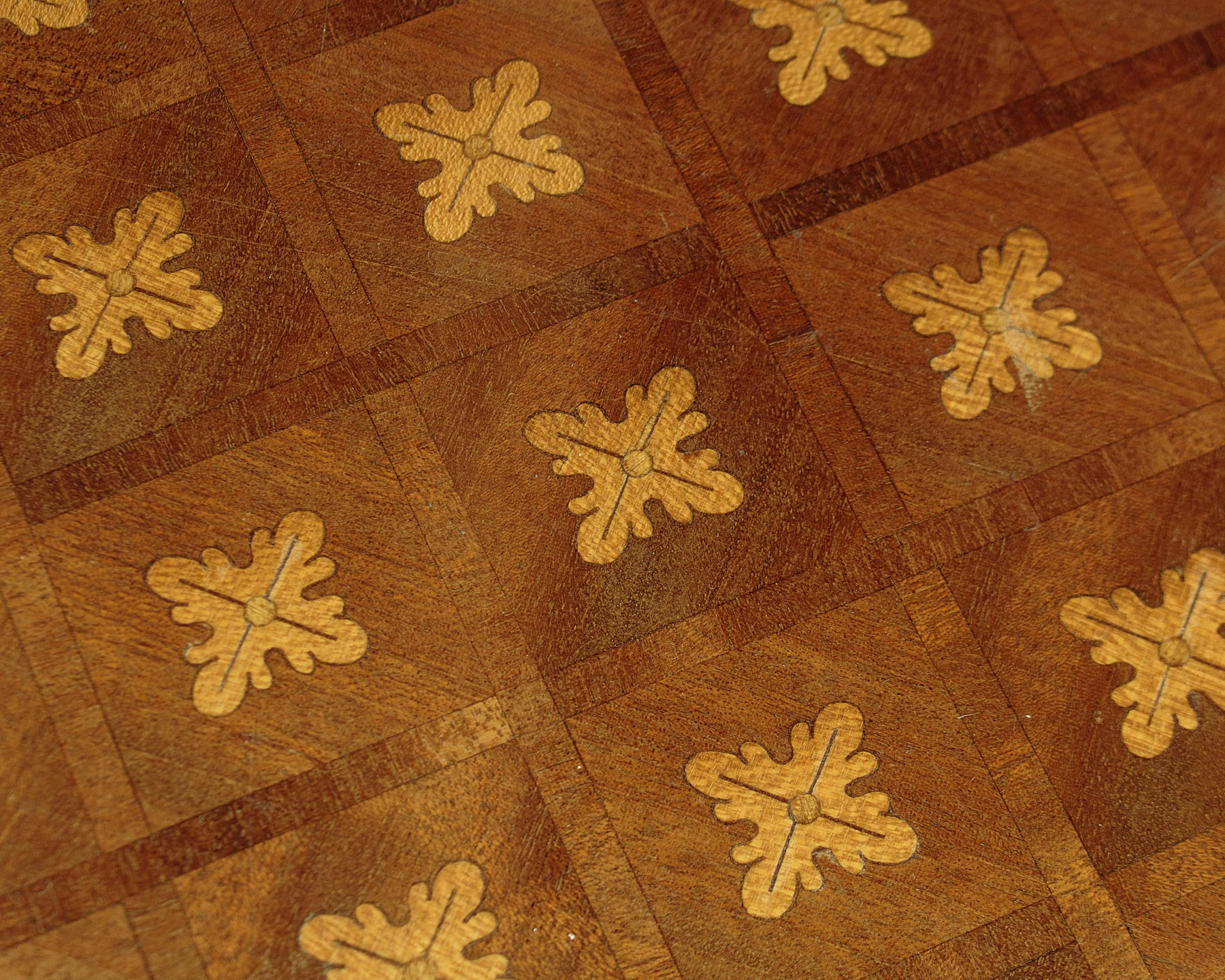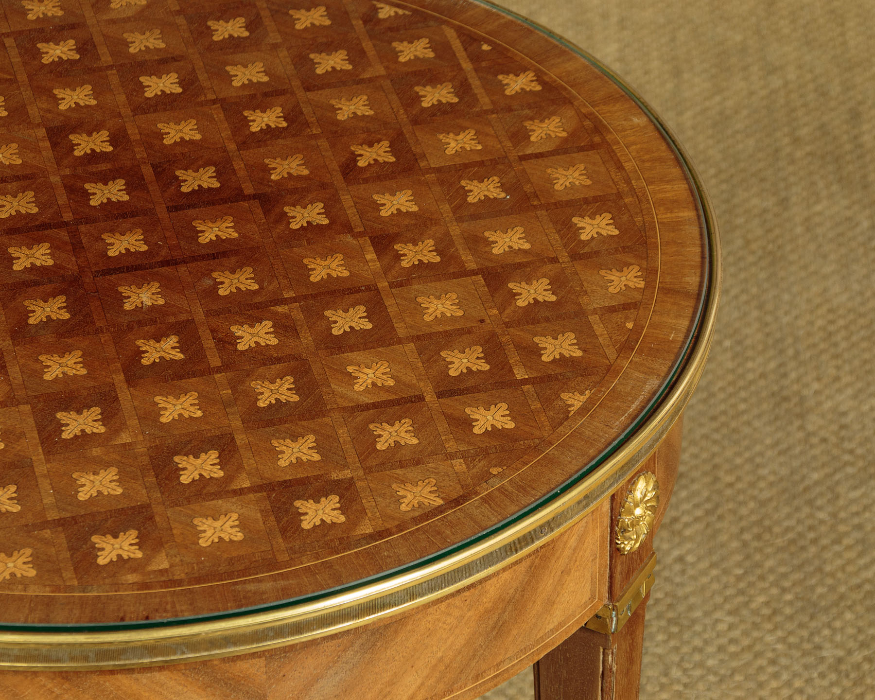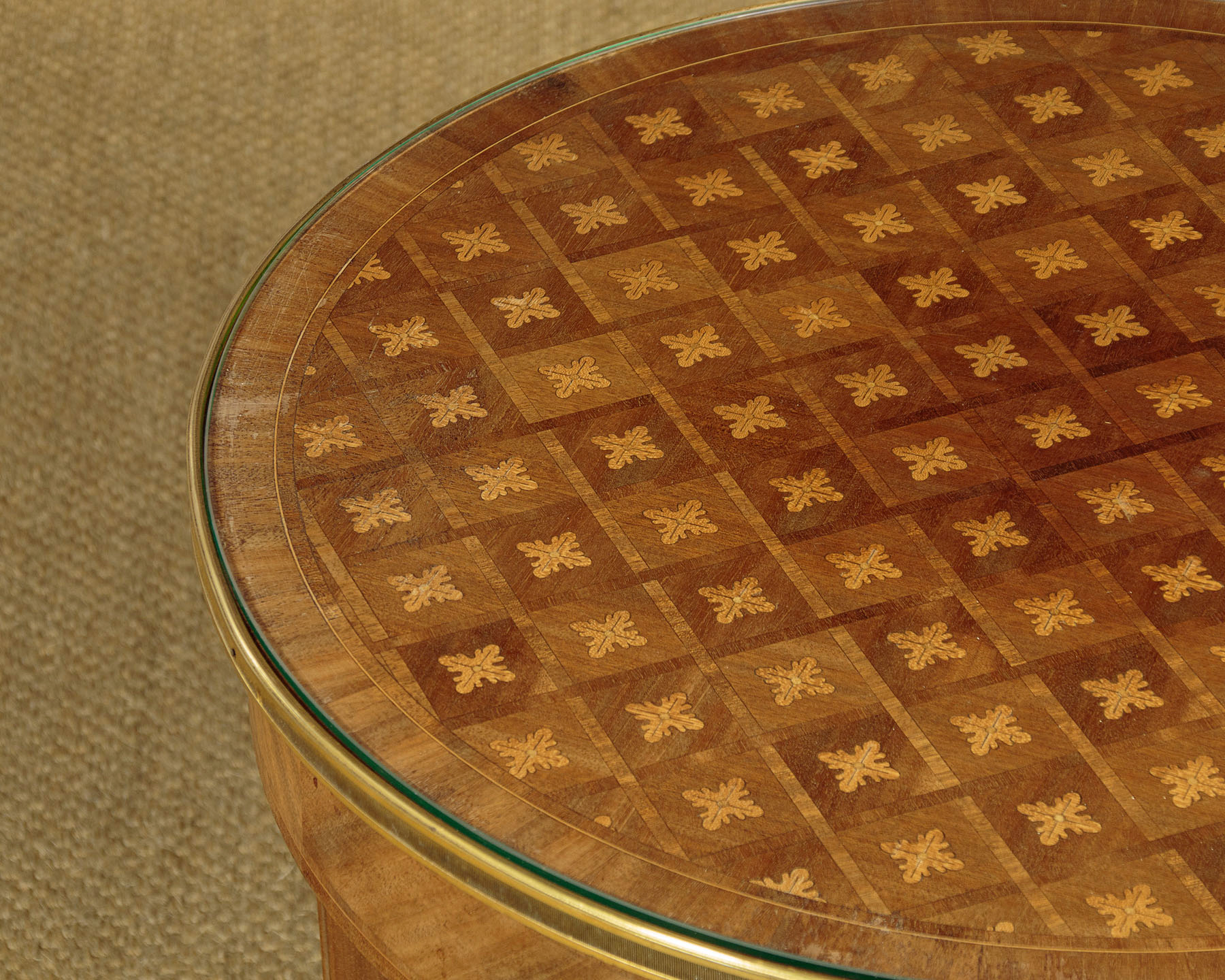 Smart little French Louis XVI style inlaid side table c.1960. Superb top with repeated inlaid detail into the parquetry work ground and with a reeded brass edge moulding which holds a loose glass top snugly in place. Over an inlaid and veneered apron with brass flower head roundels. Raised on slim tapering legs with moulded edges, brass mounts and feet. Very good condition.