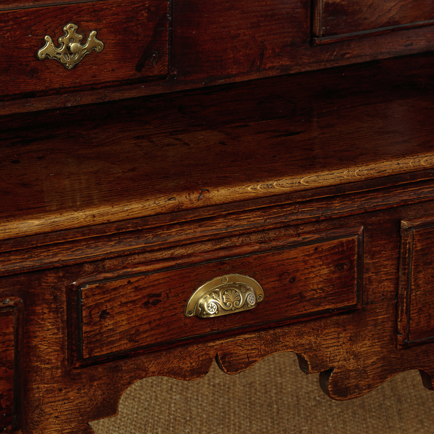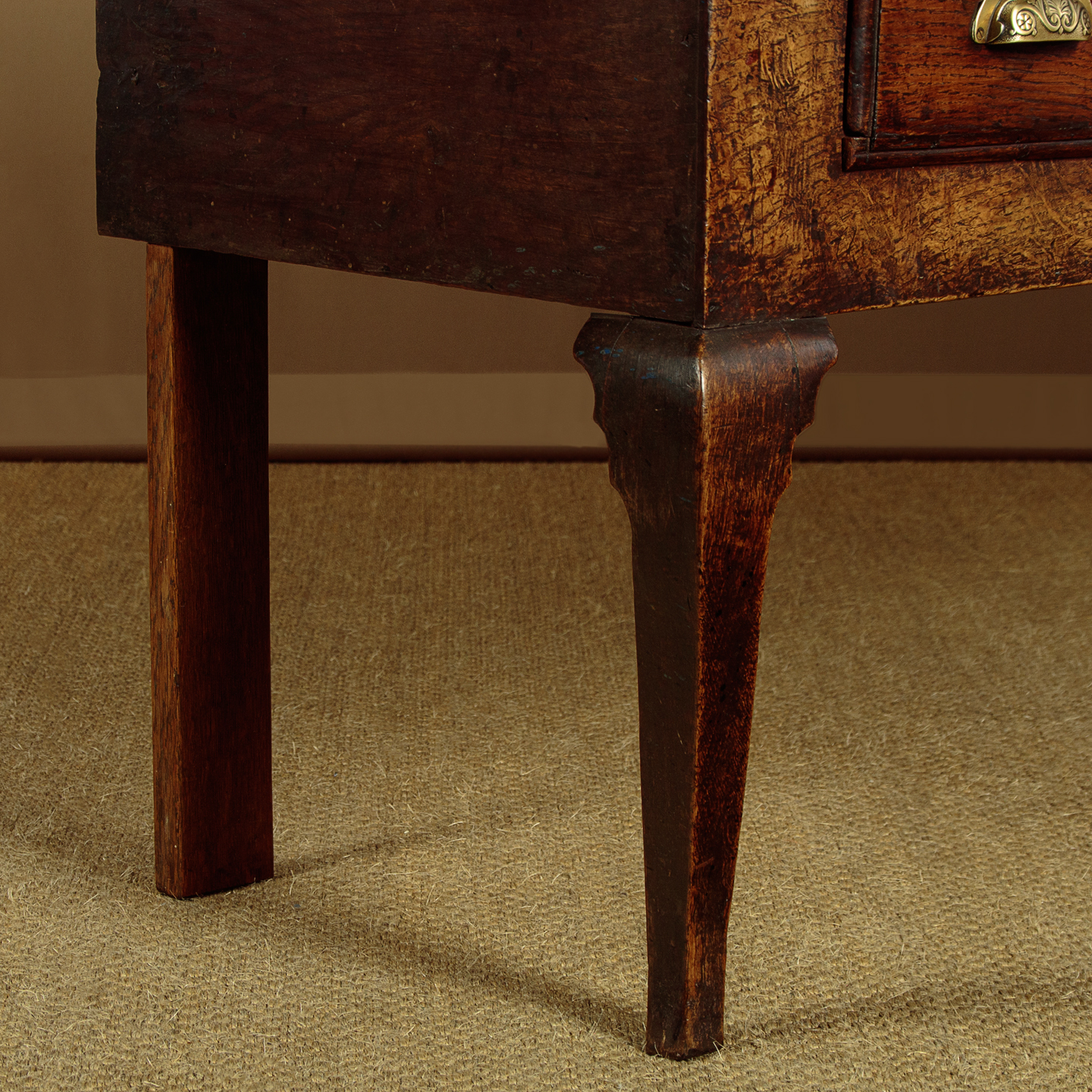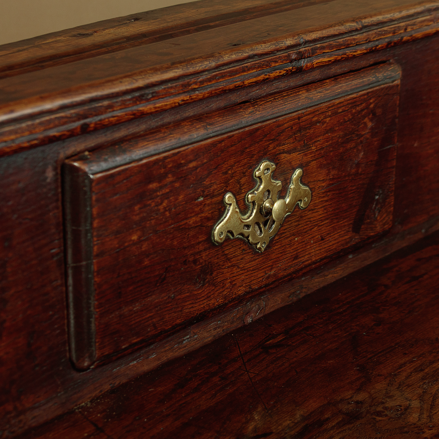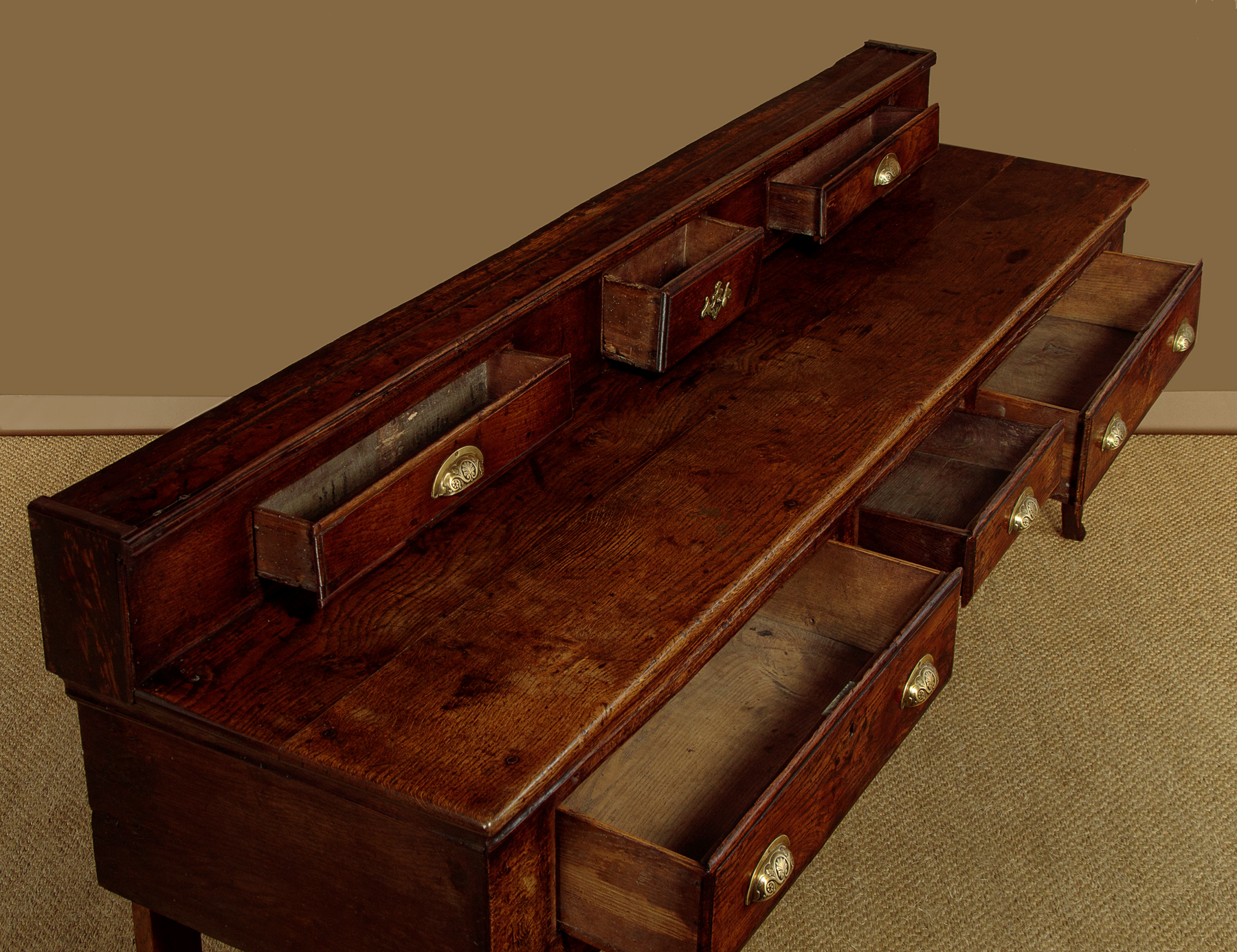 Unusual early 19th.c. oak open dresser base c.1800. Raised back with a groove for standing plates in the top and three 'spice' drawers in the front. Over a low base (just 26½" tall) with a two plank top. Two large drawers below plus a smaller middle drawer over the very attractively shaped detail at the centre of the apron. Moulded drawer fronts with later 19th.c. brass handles. Oak drawer linings. Raised on shaped cabriole front legs, the straight rear legs are later replacements. Great rustic character with some earlier repairs and restorations. Very good colour and condition, cleaned and waxed in our workshops.