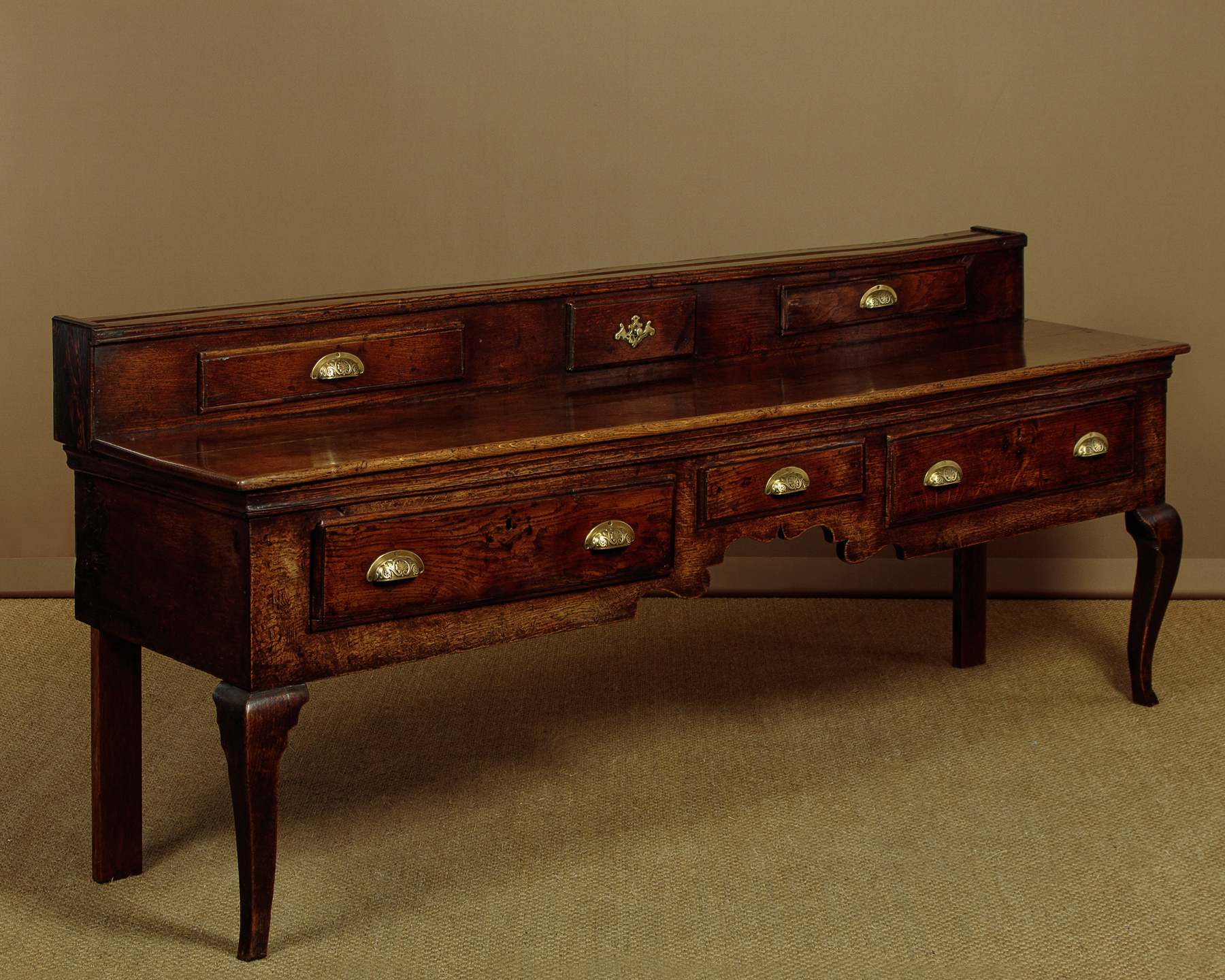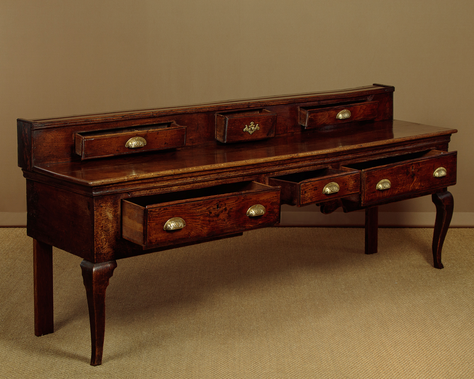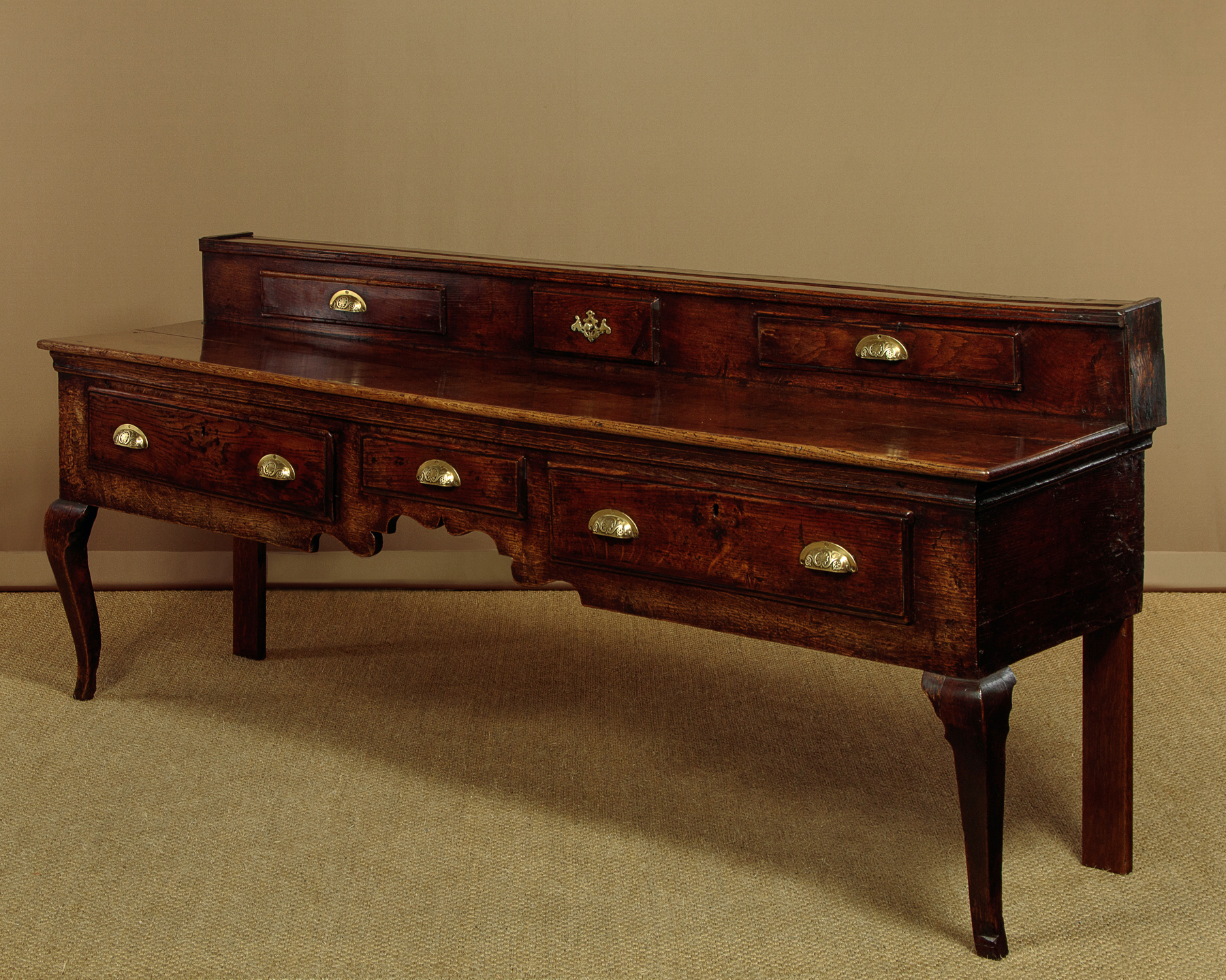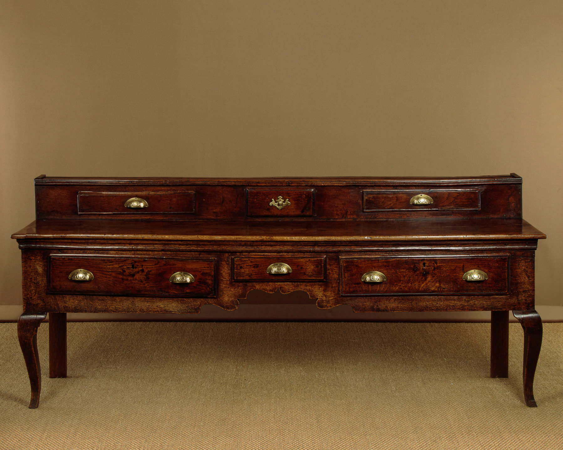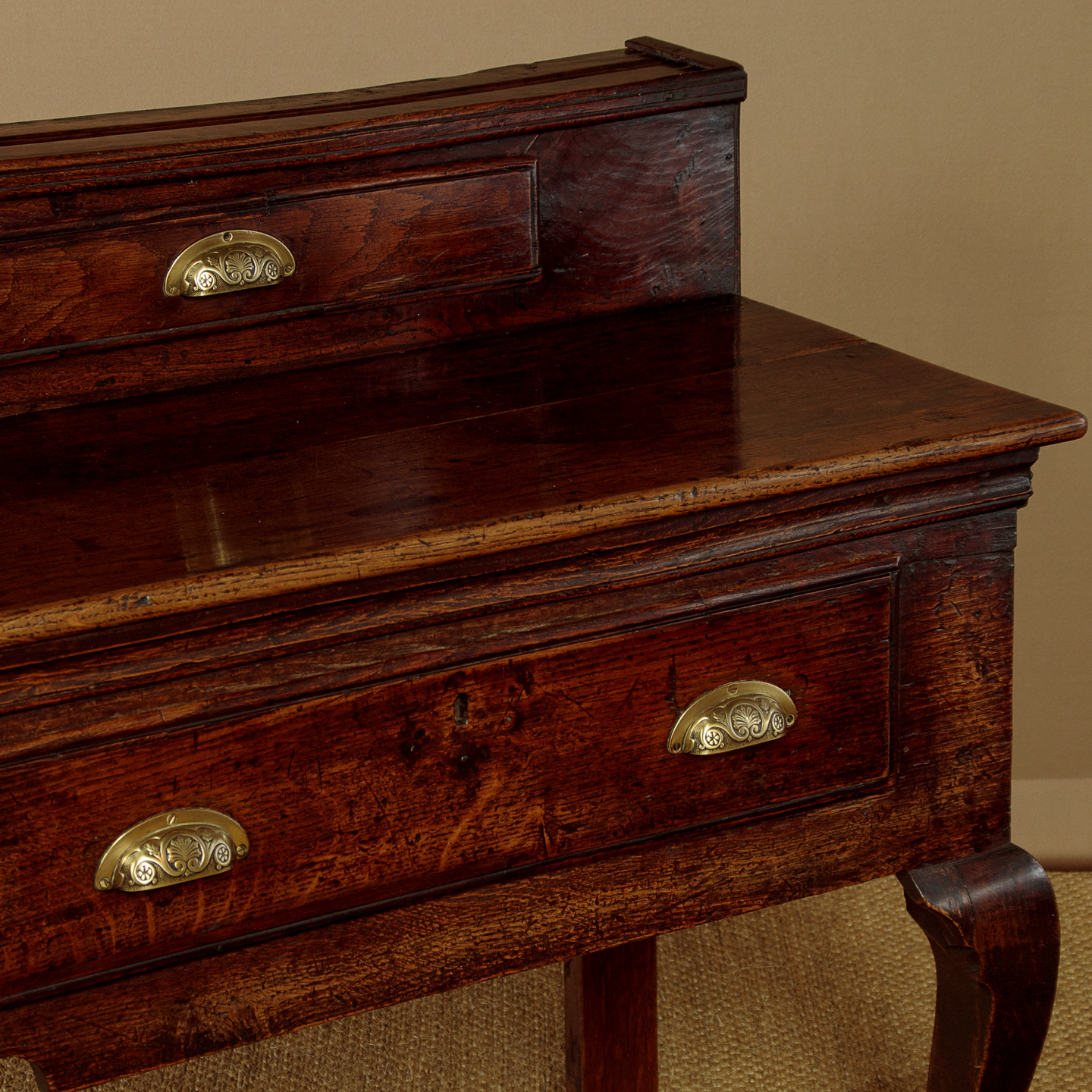 Unusual early 19th.c. oak open dresser base c.1800. Raised back with a groove for standing plates in the top and three 'spice' drawers in the front. Over a low base (just 26½" tall) with a two plank top. Two large drawers below plus a smaller middle drawer over the very attractively shaped detail at the centre of the apron. Moulded drawer fronts with later 19th.c. brass handles. Oak drawer linings. Raised on shaped cabriole front legs, the straight rear legs are later replacements. Great rustic character with some earlier repairs and restorations. Very good colour and condition, cleaned and waxed in our workshops.
