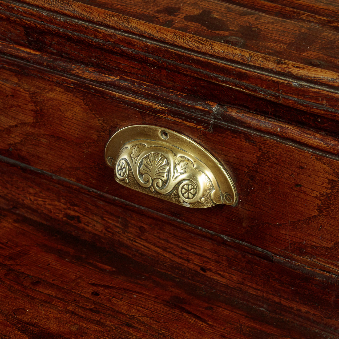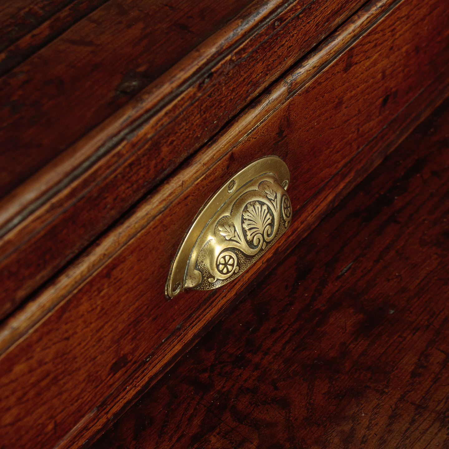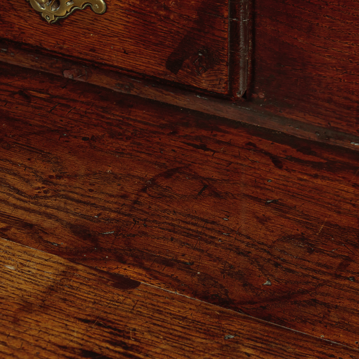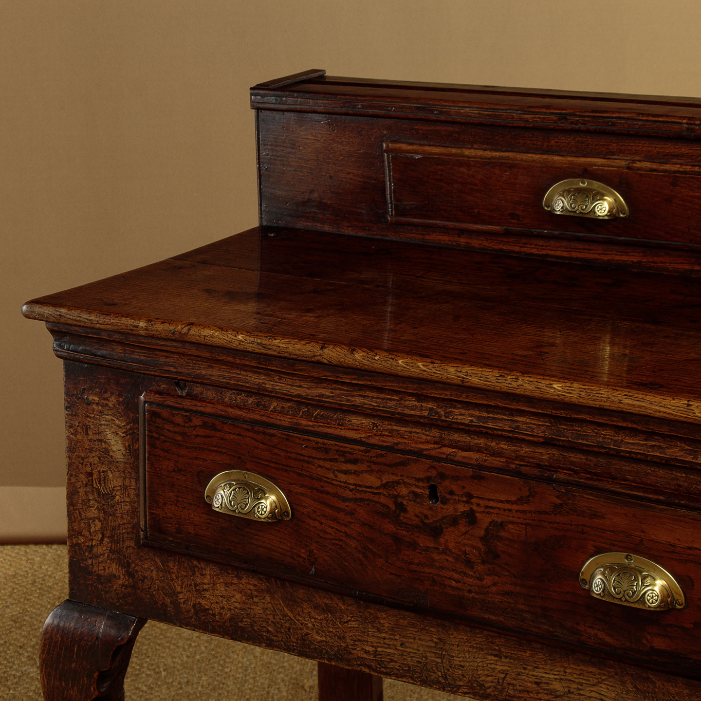 Unusual early 19th.c. oak open dresser base c.1800. Raised back with a groove for standing plates in the top and three 'spice' drawers in the front. Over a low base (just 26½" tall) with a two plank top. Two large drawers below plus a smaller middle drawer over the very attractively shaped detail at the centre of the apron. Moulded drawer fronts with later 19th.c. brass handles. Oak drawer linings. Raised on shaped cabriole front legs, the straight rear legs are later replacements. Great rustic character with some earlier repairs and restorations. Very good colour and condition, cleaned and waxed in our workshops.