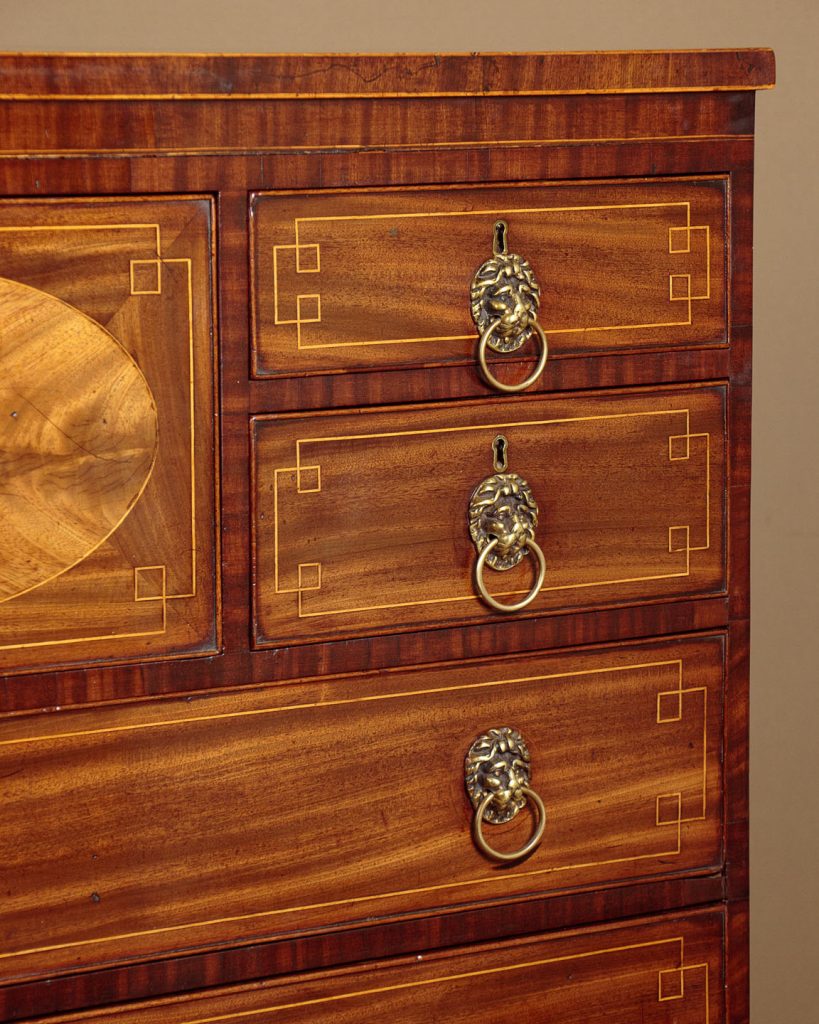 Quality George III mahogany chest of drawers c.1800. Unusual configuration featuring four small drawers around a large centre drawer, with three long drawers of graduated height below. Mahogany veneered top with crossbanded edges and inlaid boxwood stringing. Cockbeaded drawer fronts with decorative inlay and later brass lion's mask handles. Ebony and boxwood inlaid trim around the base over a shaped apron and splayed bracket feet. Solid oak drawer linings, mahogany groundwork to the drawer fronts and solid mahogany sides. Some minor wear, generally excellent colour and condition, cleaned and waxed in our workshops.