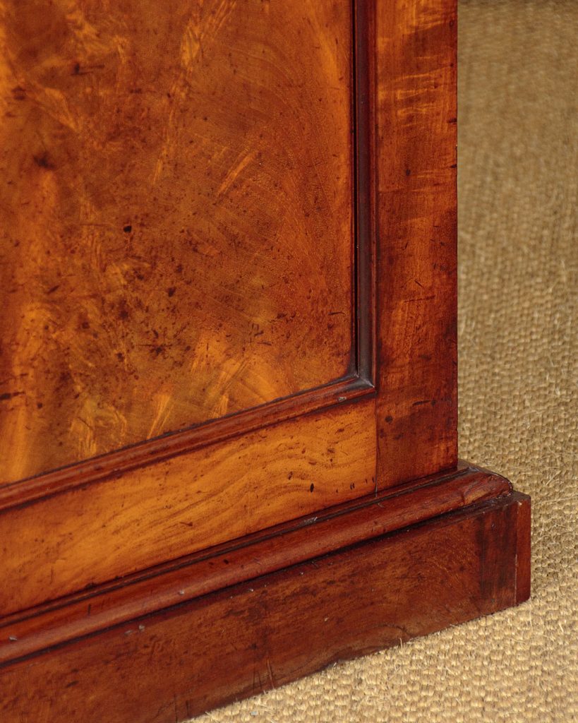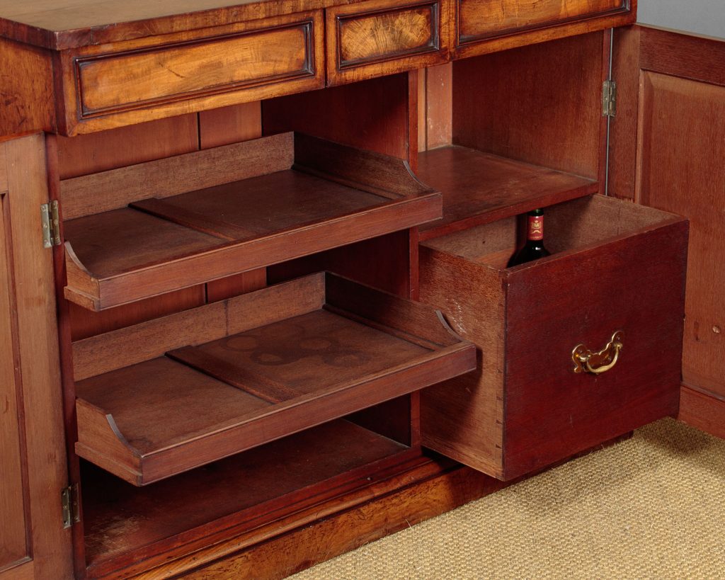 Handsome mid 19th.c. mahogany chiffonier side cabinet c.1860. At four feet wide a little larger than many we see. Single piece mahogany top with crossbanded edges, over two drawers and a two door cupboard retaining the original fitted interior of two sliding shelves and a large bottle drawer. Flame mahogany veneers within raised mouldings to the drawer fronts and doors. Solid mahogany groundwork, sides and drawer linings. Excellent colour and condition, cleaned and waxed in our workshops. Key supplied.