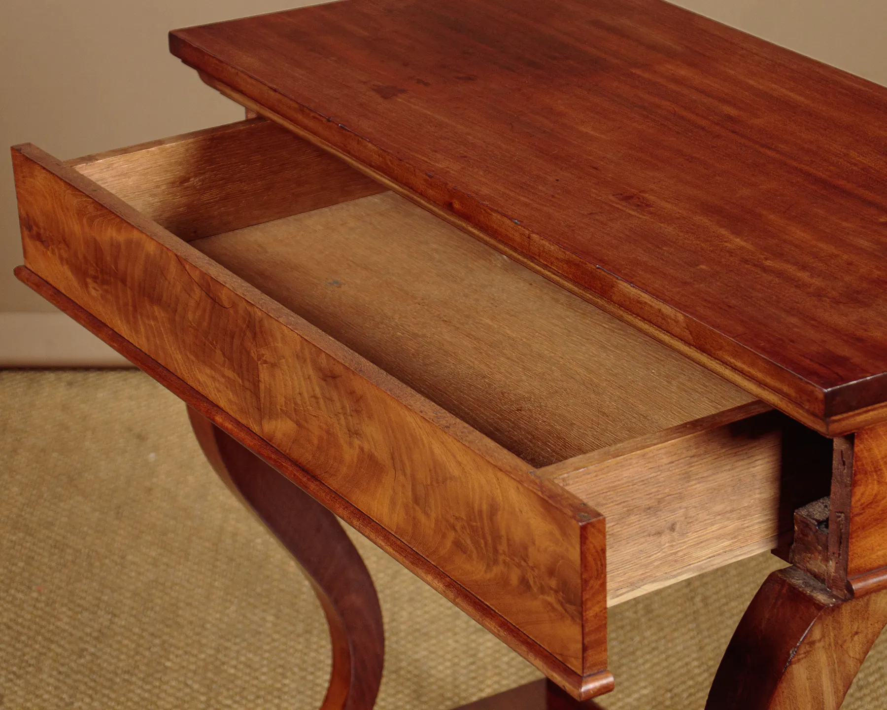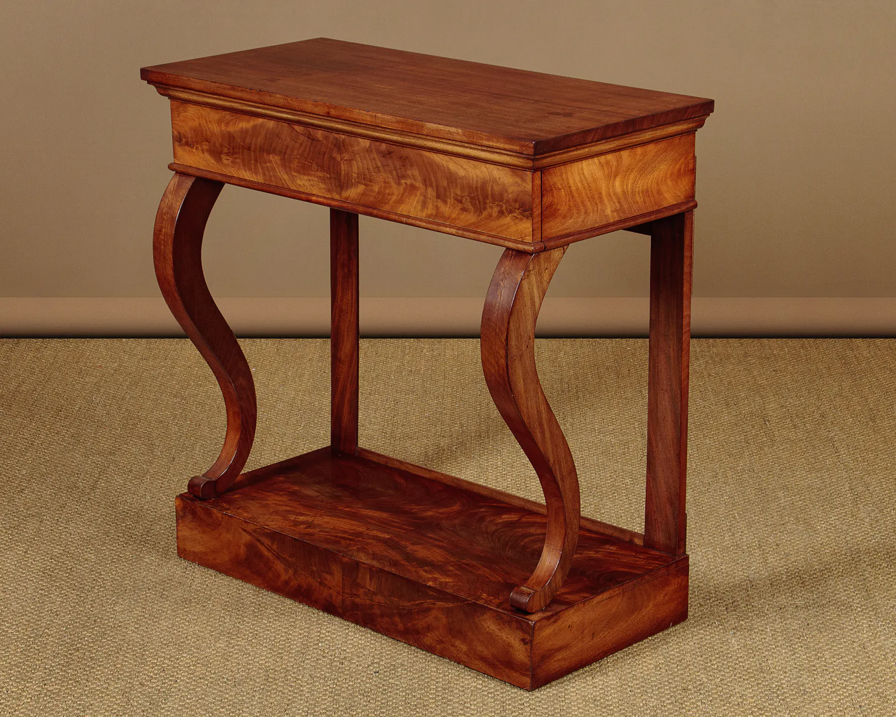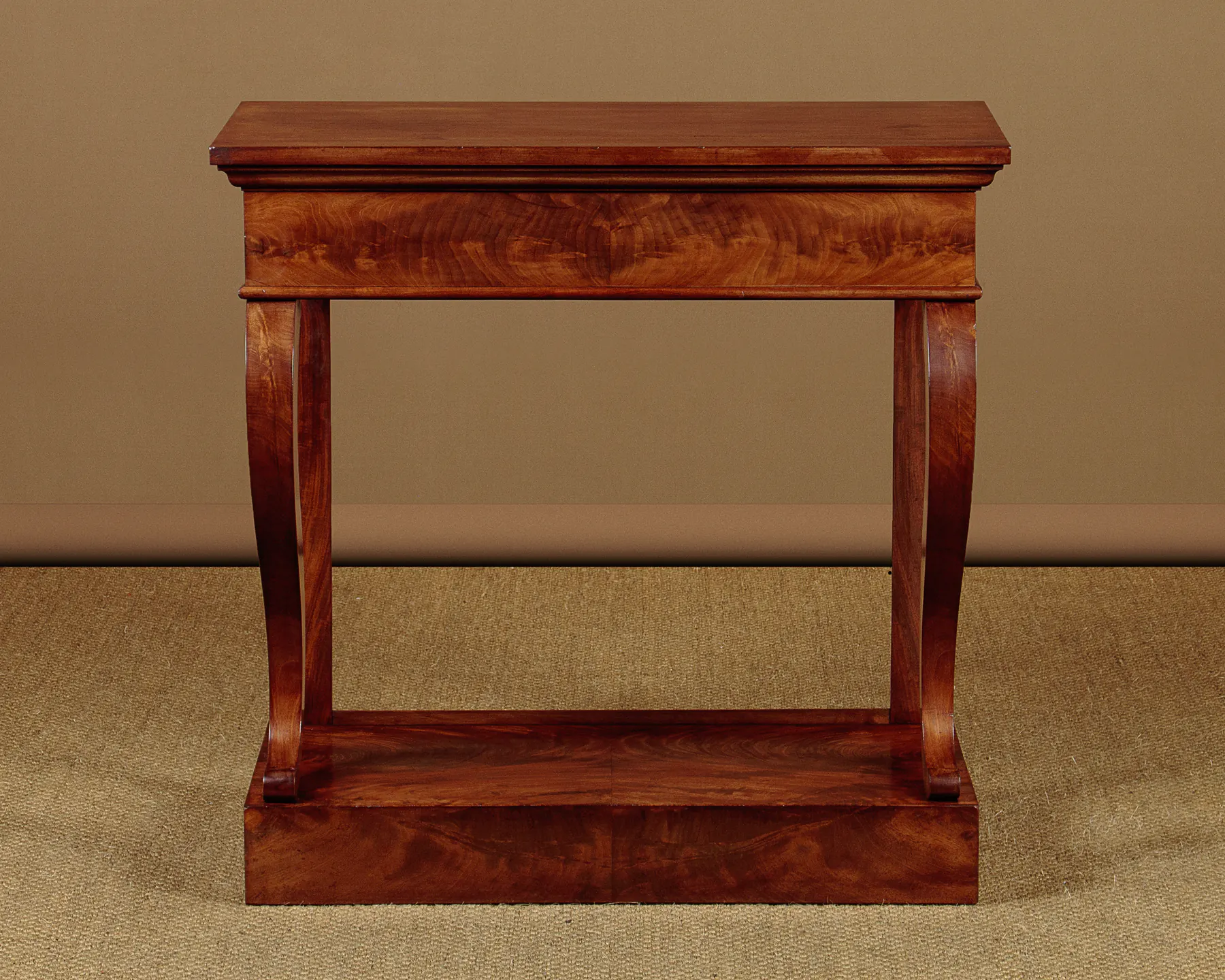 Charming little mid 19th.c. mahogany console table c.1850. Useful narrow dimensions, just 33″ wide. Mahogany veneered top over a symmetrically veneered apron with a single oak lined drawer in the front. Raised on shaped front supports and straight rear legs over a square plinth base also veneered to match. Some old wear to the top, otherwise very good colour and condition, cleaned and waxed in our workshops.