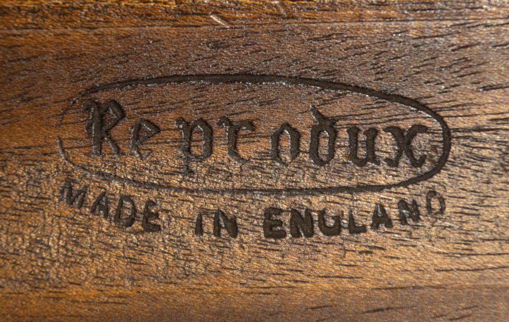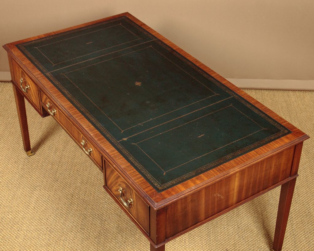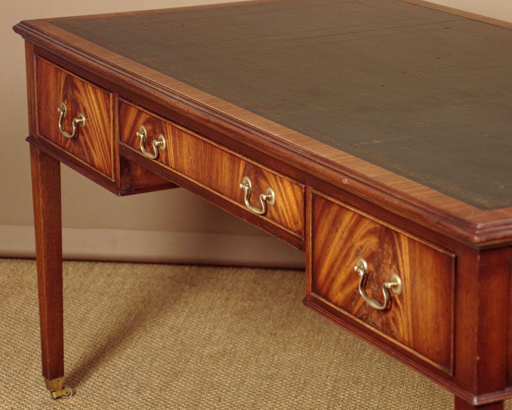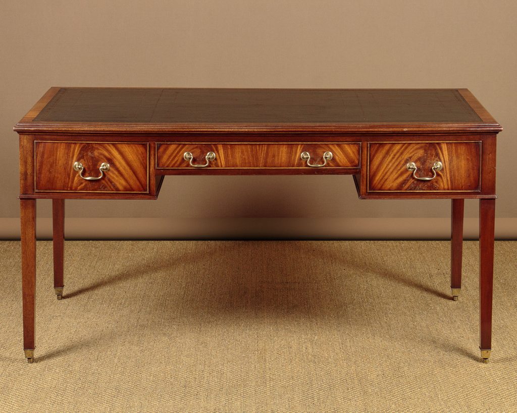 Good sized Georgian style mahogany desk or writing table by Reprodux Beval & Funell c.1960. 59" x 31" top with original dark green/blue leather work surface with decorative gilt tooling, set within a crossbanded and moulded edge. Over three drawers with matched flame mahogany veneers to the fronts, cockbeaded edges and brass swan neck handles. Mahogany veneered sides and rear. Raised on square tapering legs with quality brass castors front and rear. Solid mahogany drawer sides. Stamped for Reprodux on the underside of the desk above the kneehole. Some minor wear to the leather, otherwise excellent colour and condition, cleaned and waxed in our workshops.