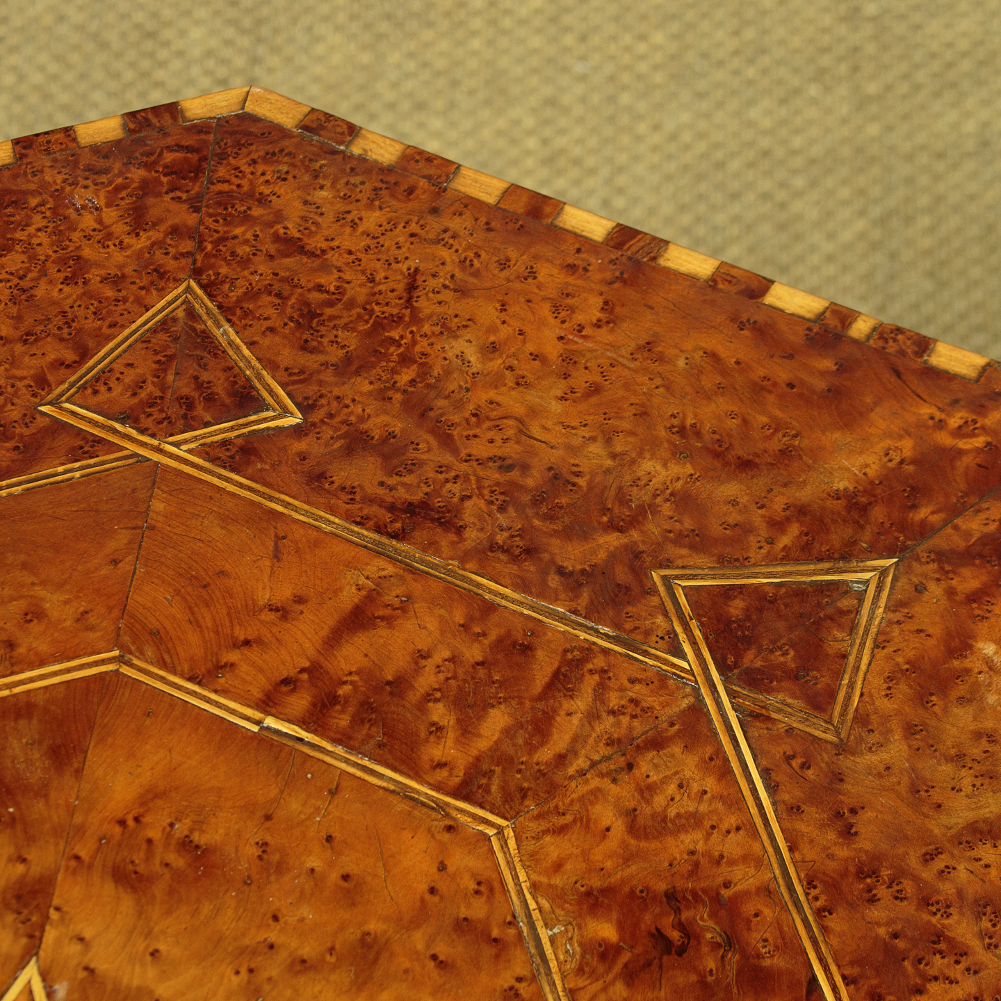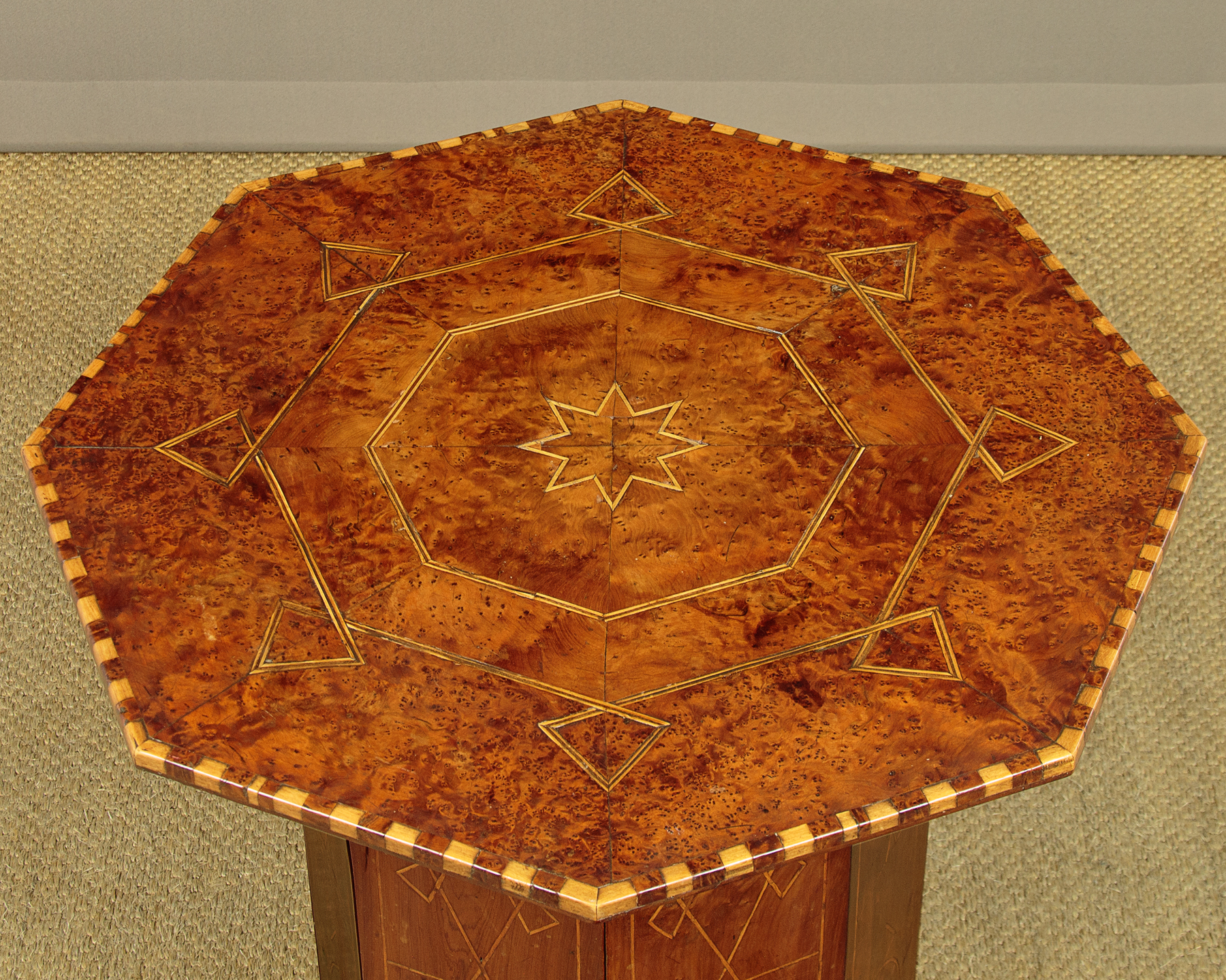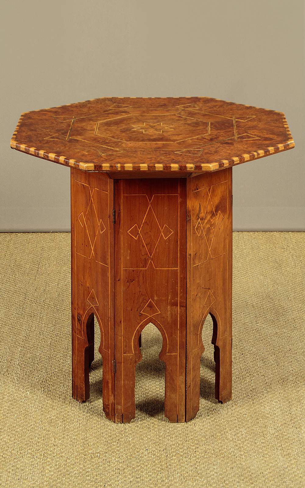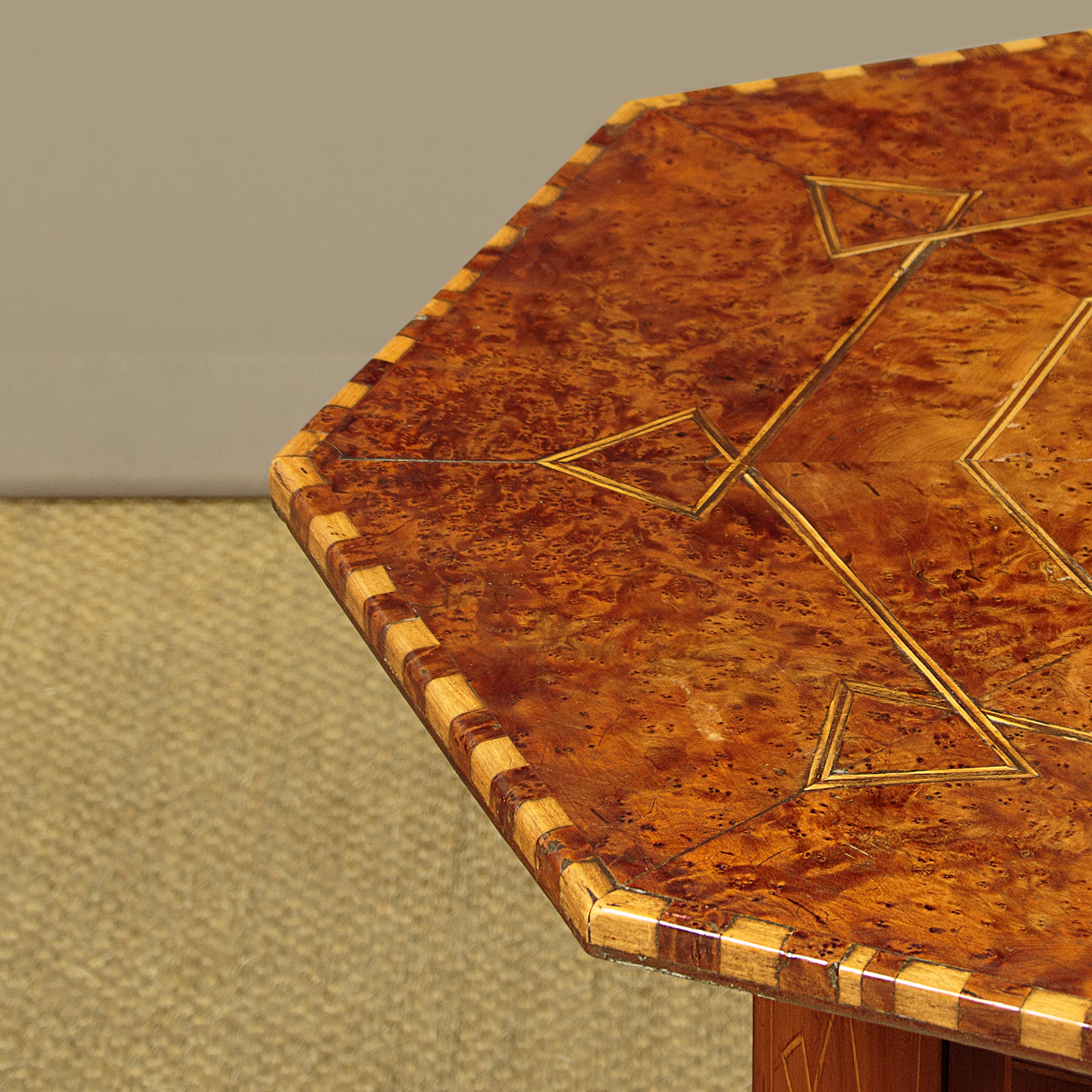 Islamic or Moorish style side table c.1900. A little larger and taller than most of the tables of this style which we come across. Octagonal top veneered in beautifully figured yew wood burr with inlaid geometrical design in boxwood and with an alternating satinwood and yew edge moulding. Solid yew wood sides to the base, also inlaid and with an Islamic arch cutaway to form the feet. Some minor wear and repairs, generally very good colour and condition. Cleaned and waxed in our workshops.