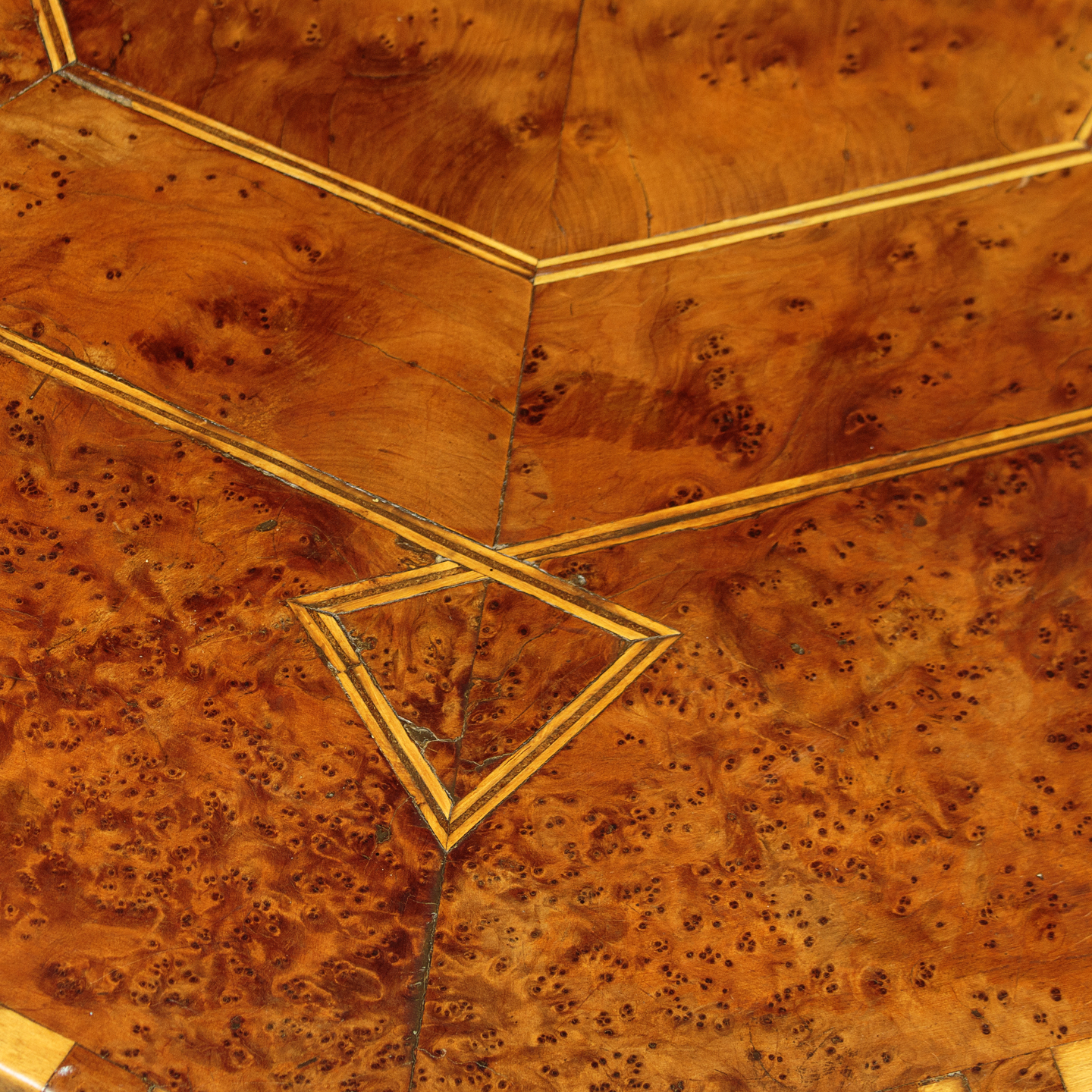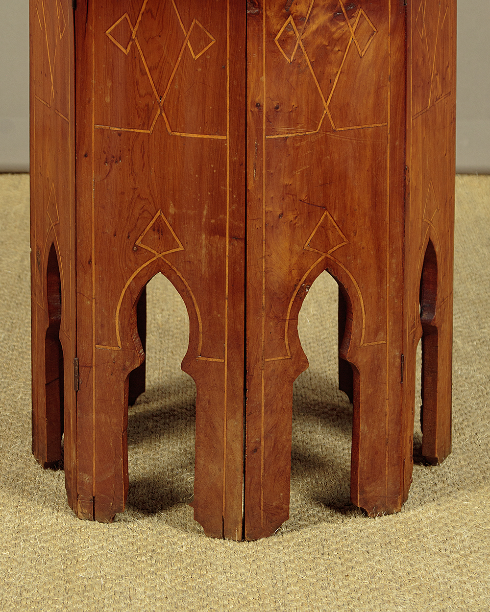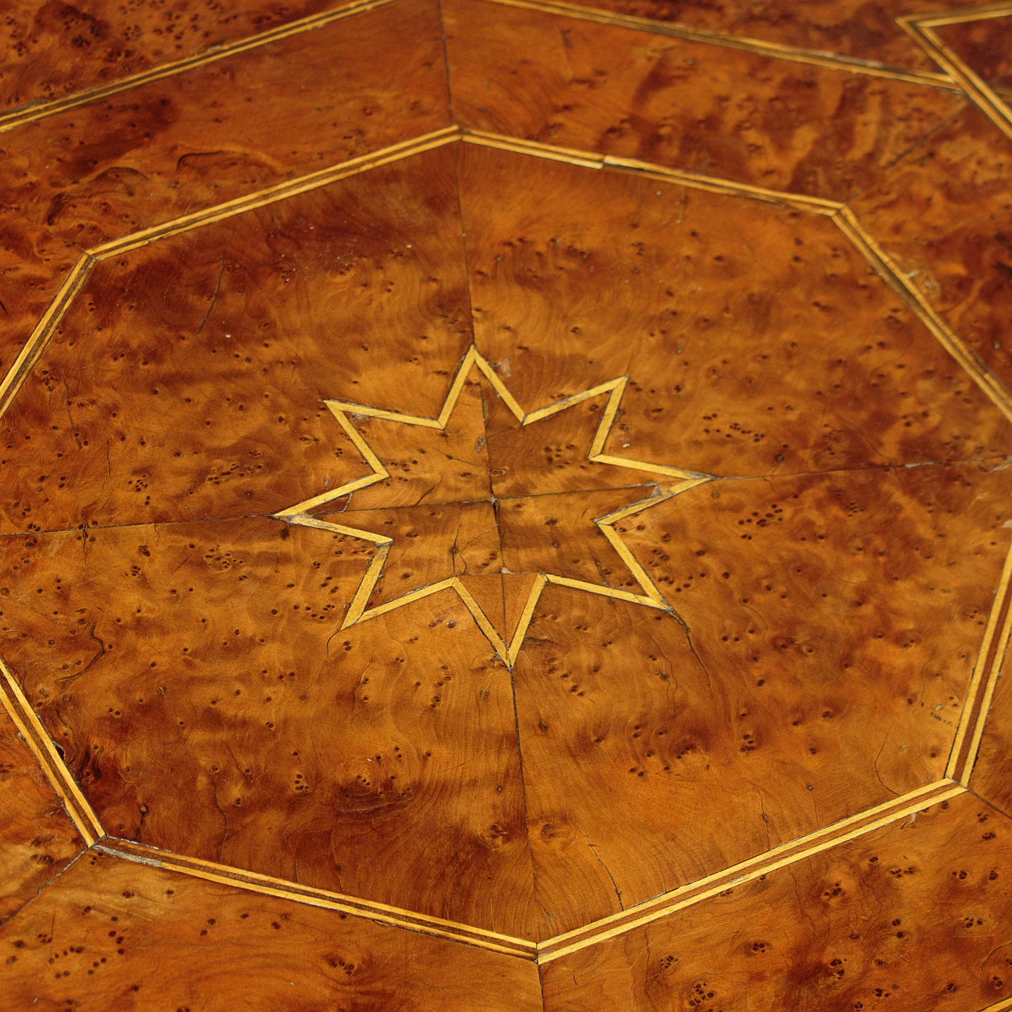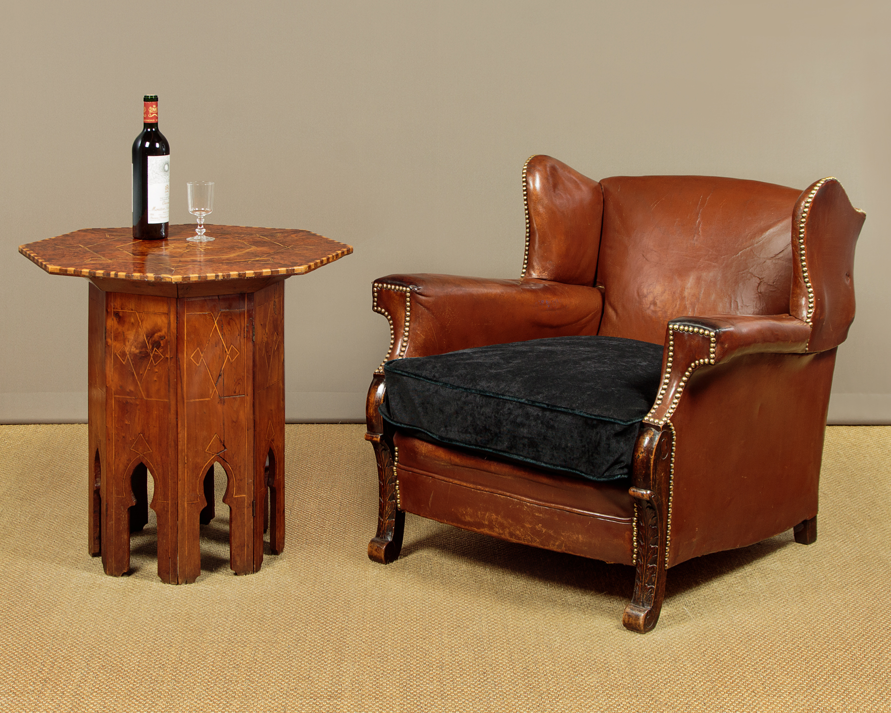 Islamic or Moorish style side table c.1900. A little larger and taller than most of the tables of this style which we come across. Octagonal top veneered in beautifully figured yew wood burr with inlaid geometrical design in boxwood and with an alternating satinwood and yew edge moulding. Solid yew wood sides to the base, also inlaid and with an Islamic arch cutaway to form the feet. Some minor wear and repairs, generally very good colour and condition. Cleaned and waxed in our workshops.