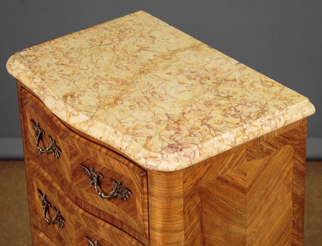 Neat little marble top bank of drawers c.1930. Just 21" wide. Pale marble top with a serpentine shaped front and moulded edges over five small drawers (internal dimensions 15" x 10½" x 5"). Symmetrical tulipwood marquetry veneered front and sides with crossbanded and inlaid detail and decorative brass handles. Shaped apron to the front and sides, curving front legs with brass mounts to the feet. Excellent condition, cleaned and waxed in our workshops.