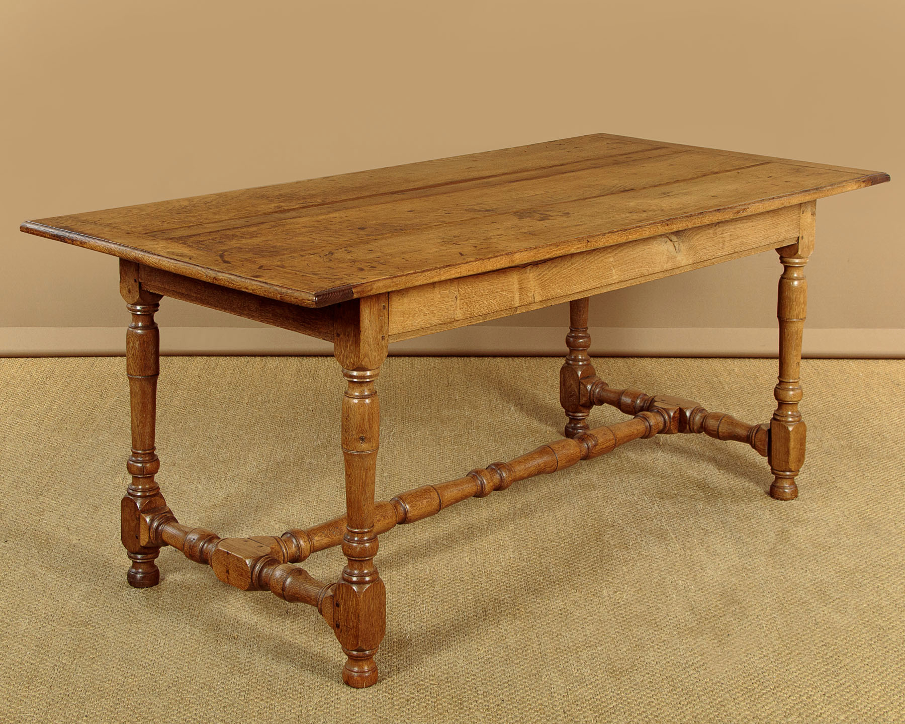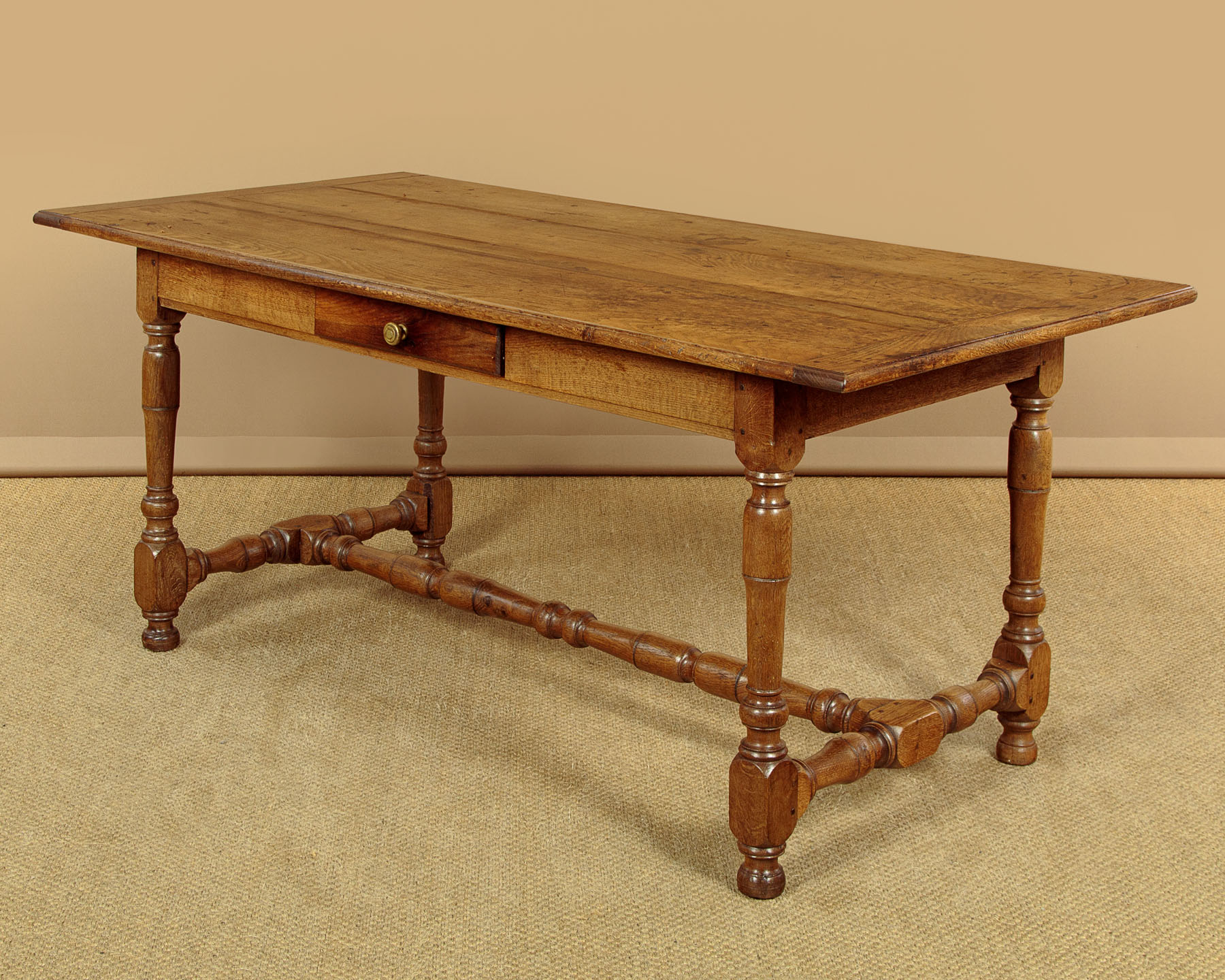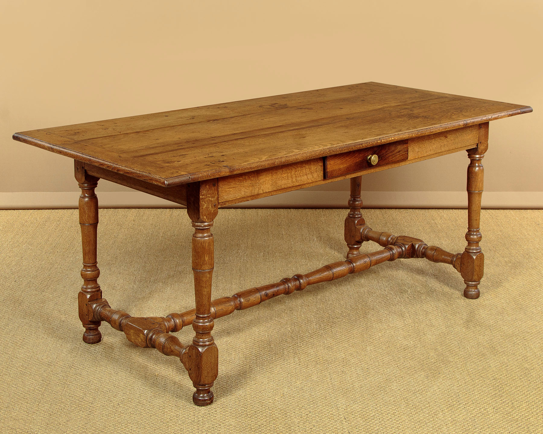 Lovely early 19th.c. oak farmhouse kitchen dining table c.1830. 65" x 31½" top made of solid oak boards with cleated ends and a moulded edge. Over a slim apron with a single drawer in one side. Raised on good turned and block legs joined with matching stretchers to the ends and centre. Note the pegged construction. Repairs to the top where oak strips have been used to fill shrinkage gaps between the boards. Otherwise excellent colour and condition, cleaned and waxed in our workshops.