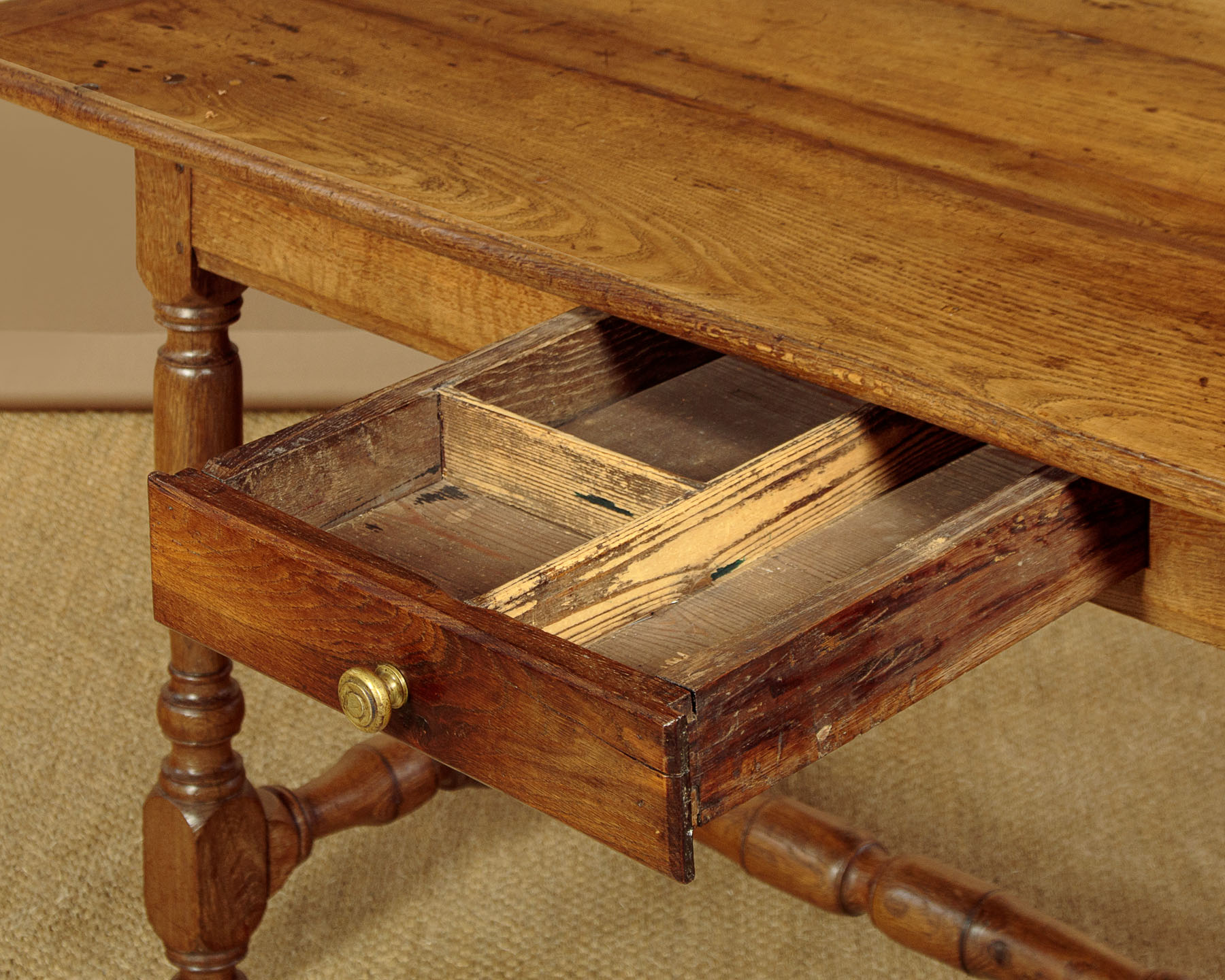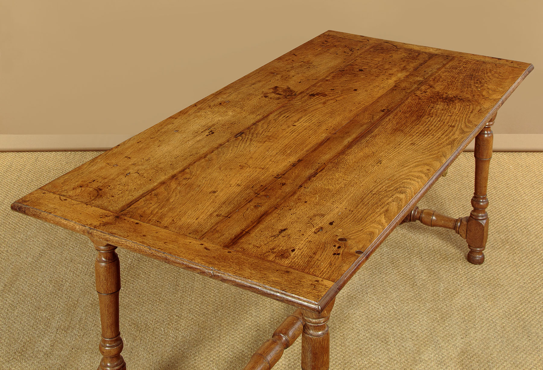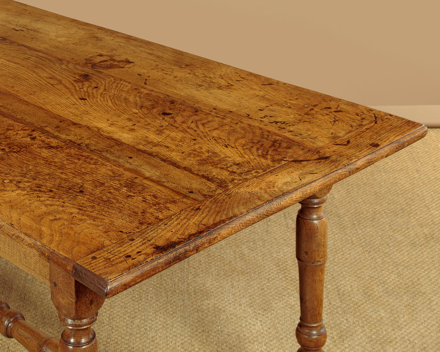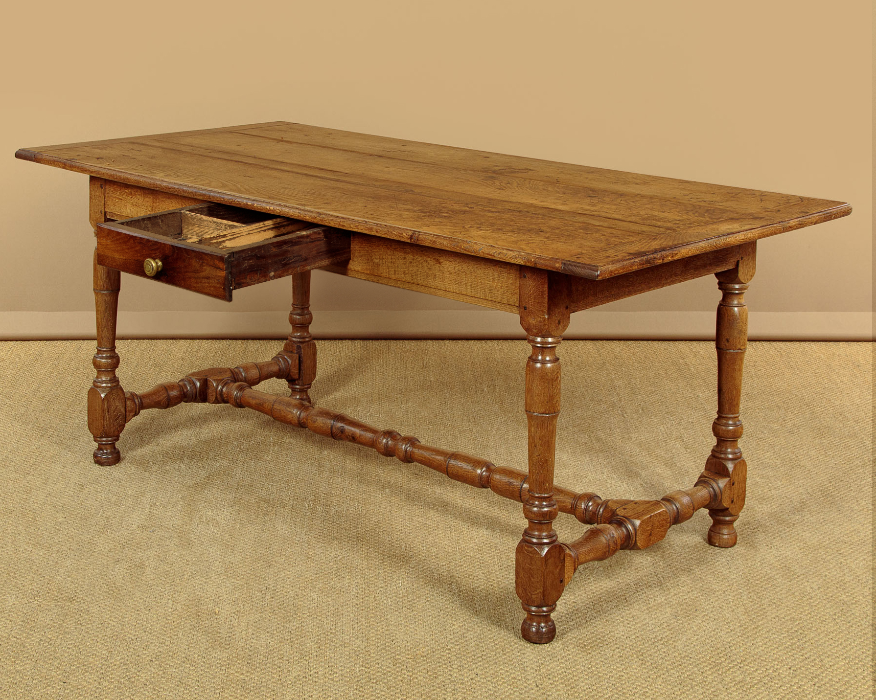 Lovely early 19th.c. oak farmhouse kitchen dining table c.1830. 65" x 31½" top made of solid oak boards with cleated ends and a moulded edge. Over a slim apron with a single drawer in one side. Raised on good turned and block legs joined with matching stretchers to the ends and centre. Note the pegged construction. Repairs to the top where oak strips have been used to fill shrinkage gaps between the boards. Otherwise excellent colour and condition, cleaned and waxed in our workshops.
