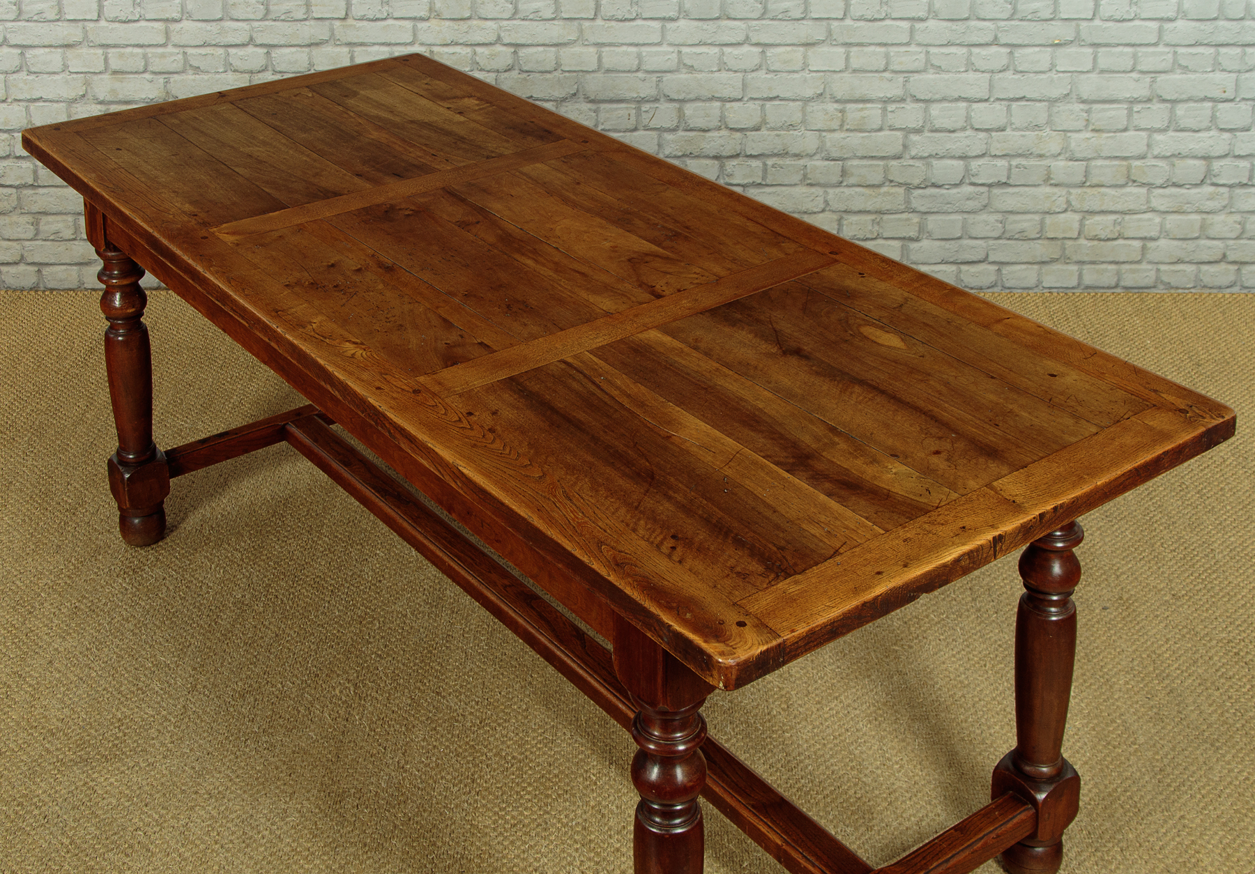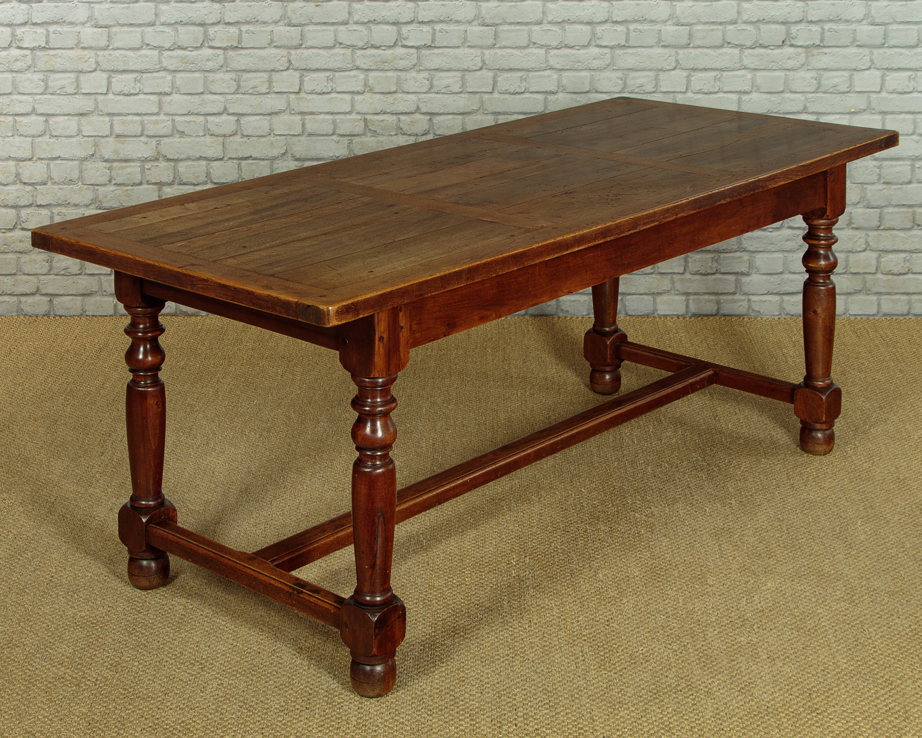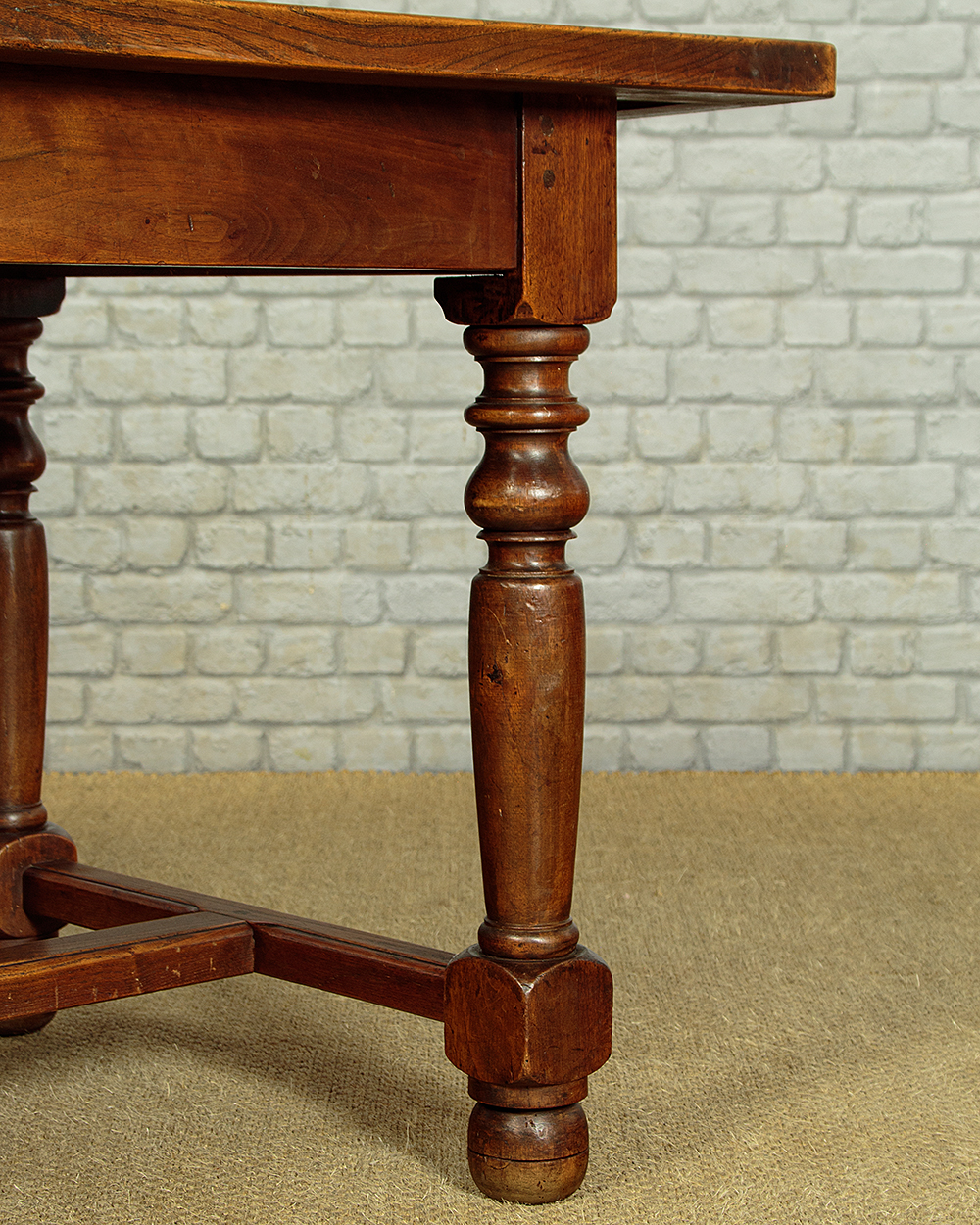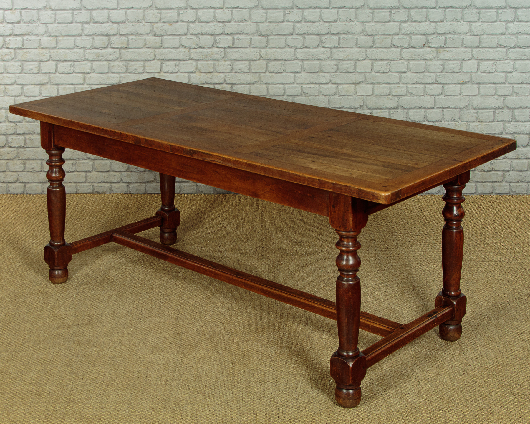 Sturdy kitchen dining table in walnut and oak c.1900. 70½" x 30½" top made from walnut boards within an oak frame. Walnut apron (knee height 23") and turned legs joined with moulded oak stretchers. Some shrinkage to the boards on the top, otherwise excellent colour and condition, cleaned and waxed in our workshops.