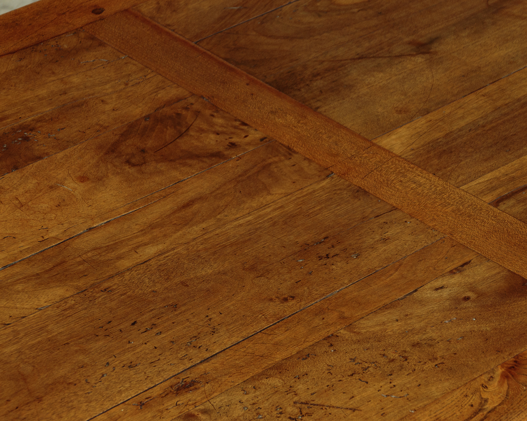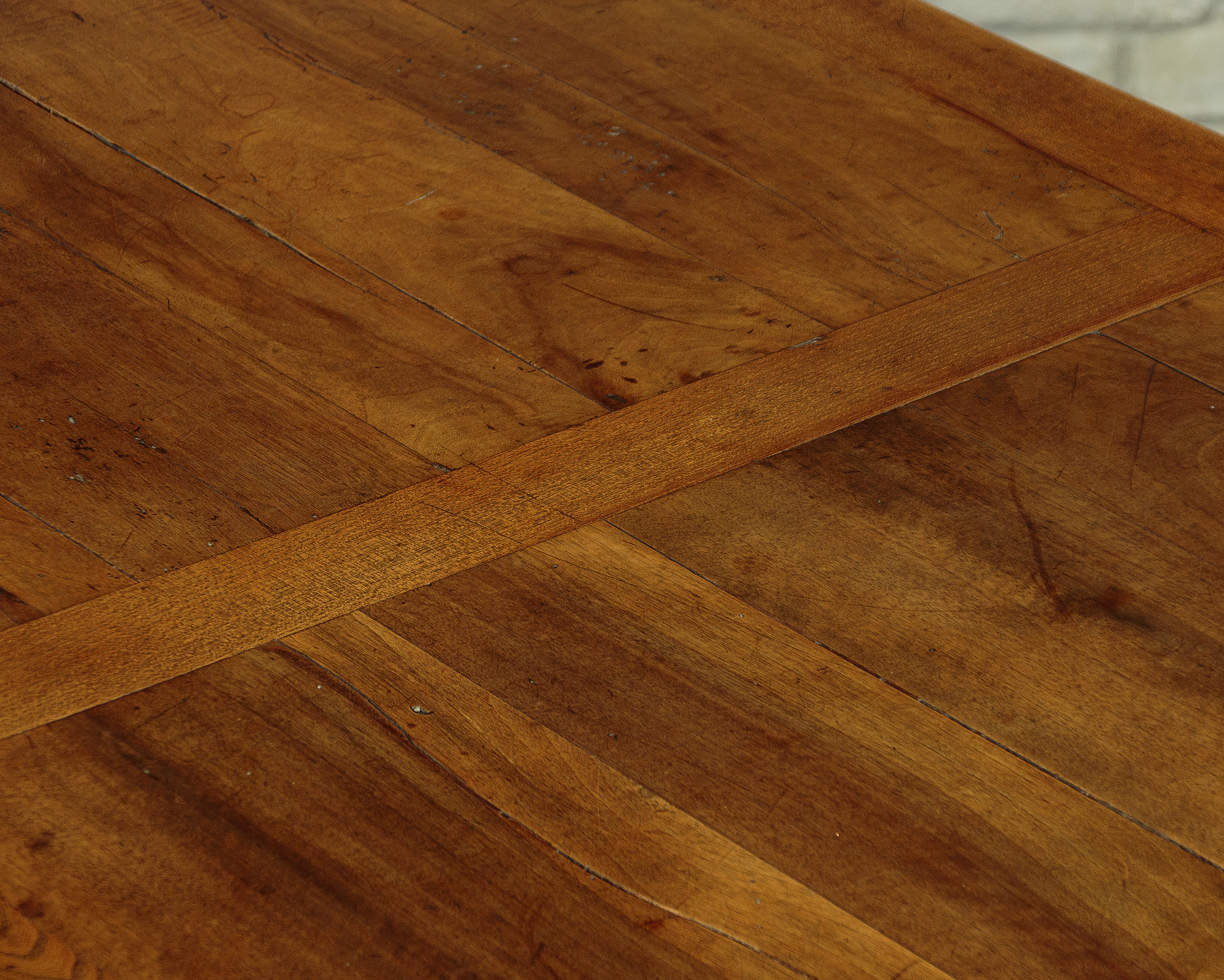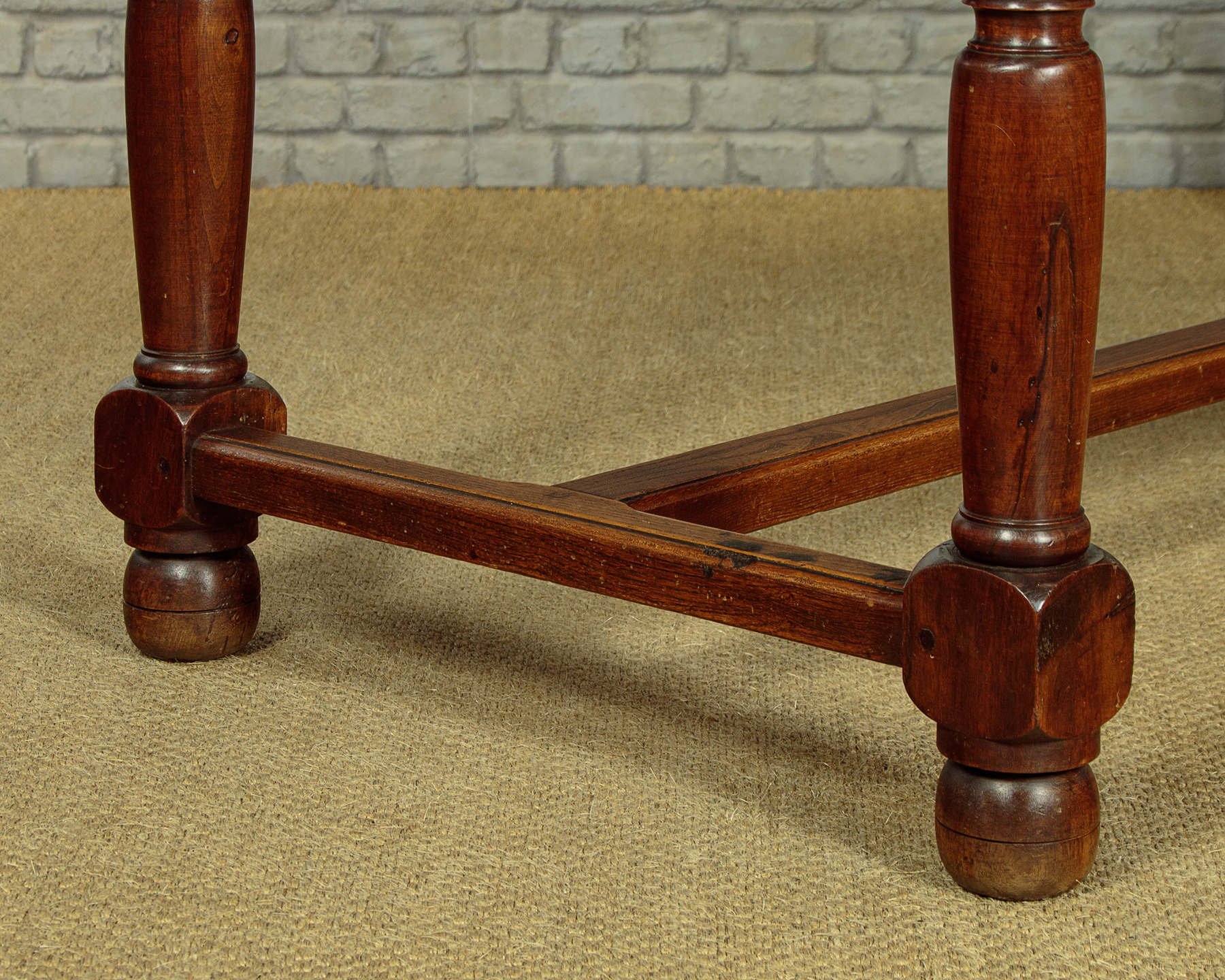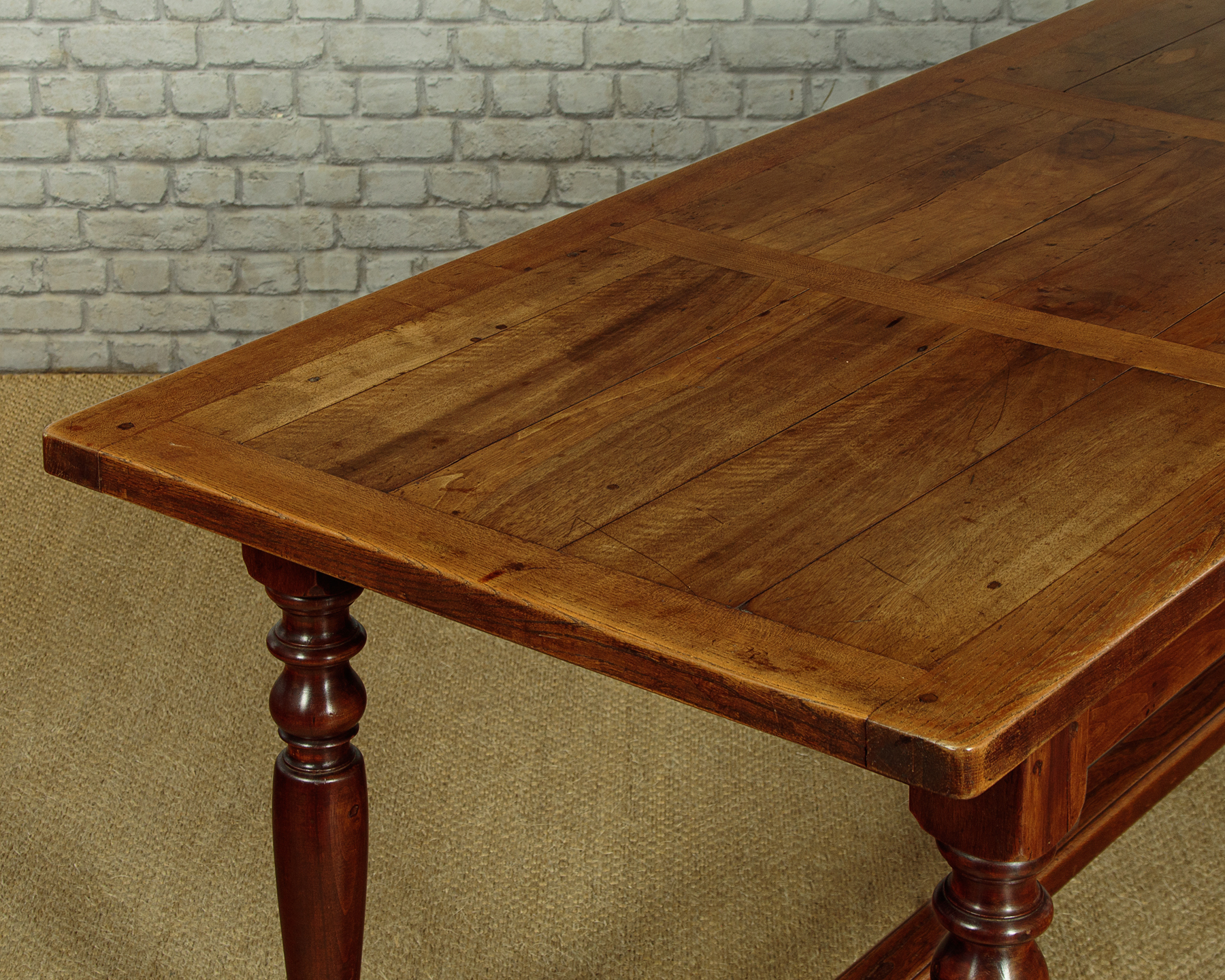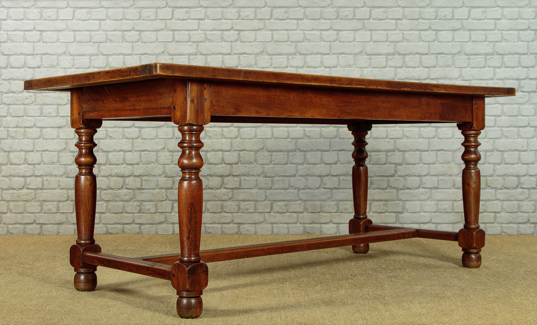 Sturdy kitchen dining table in walnut and oak c.1900. 70½" x 30½" top made from walnut boards within an oak frame. Walnut apron (knee height 23") and turned legs joined with moulded oak stretchers. Some shrinkage to the boards on the top, otherwise excellent colour and condition, cleaned and waxed in our workshops.