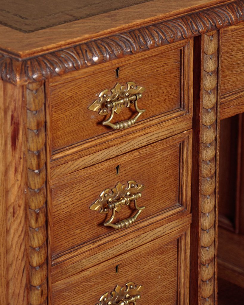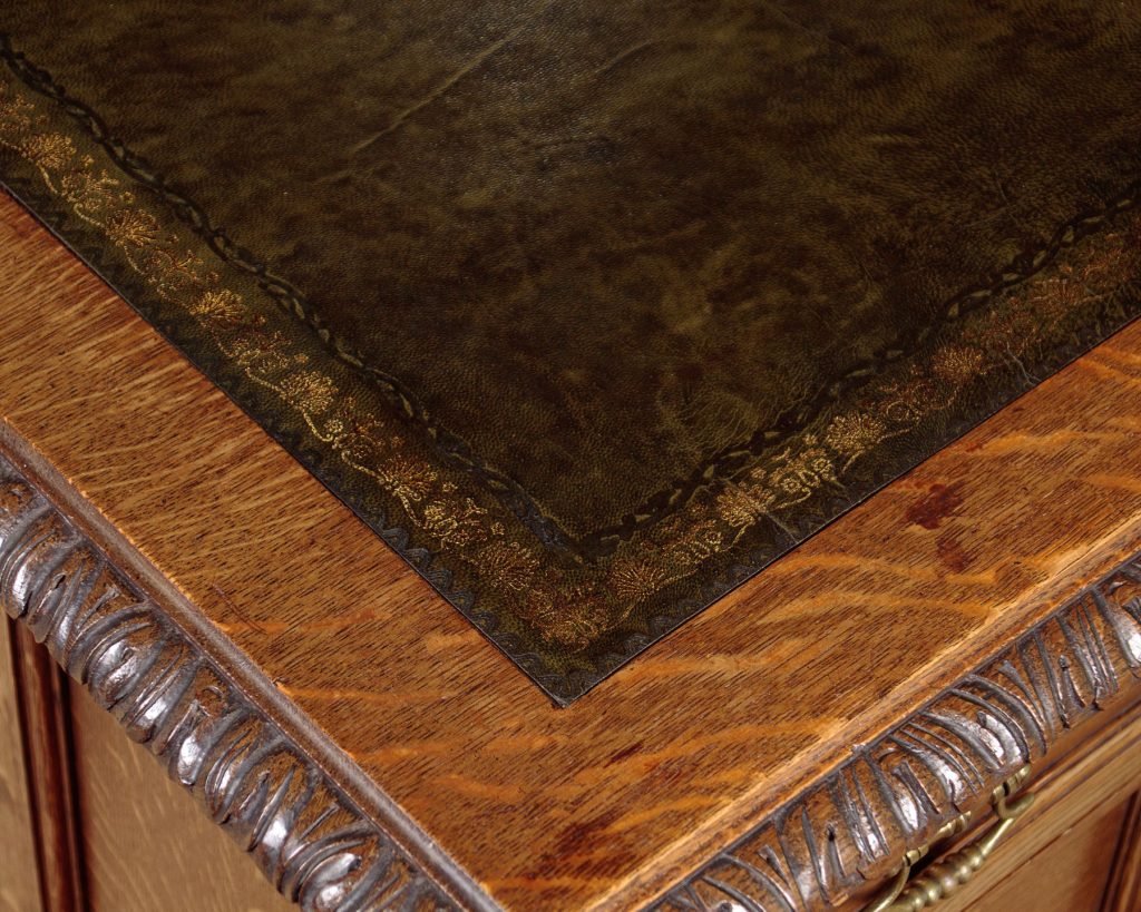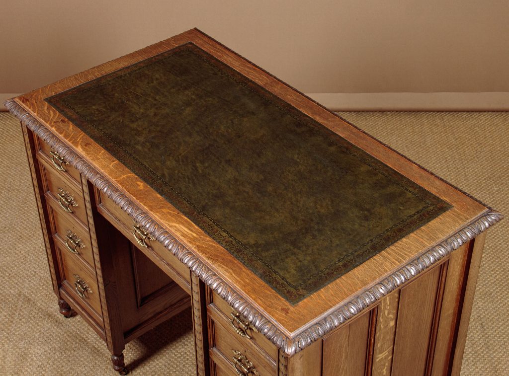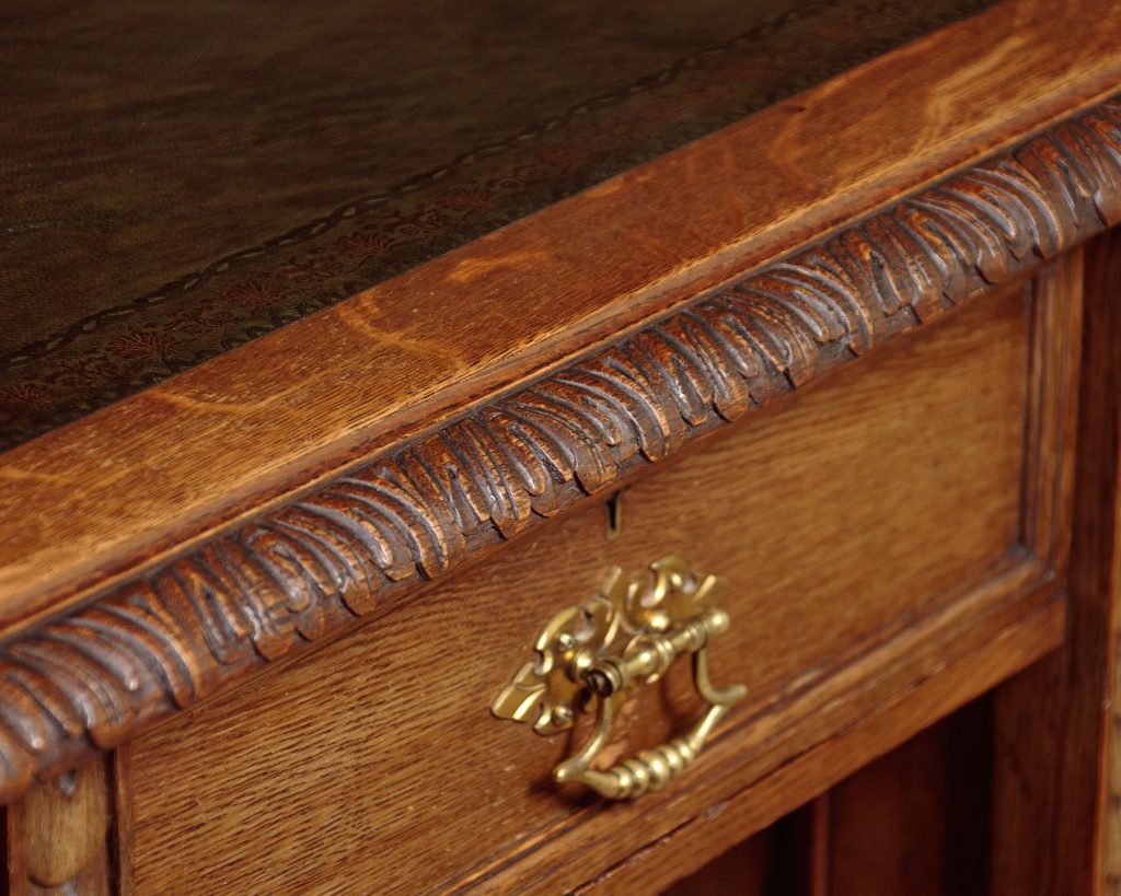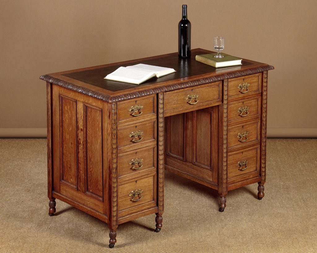 Great quality late 19th.c oak kneehole desk c.1890. 44" x 25" top with a dark green leather work surface and a carved edge. Single drawer above the kneehole flanked by two banks of four drawers of graduated height. Moulded drawer fronts with original brass handles, carved detail to the uprights either side of the drawers. Oak panelled sides and rear. Raised on short turned and carved legs with original castors below. Excellent condition, cleaned and waxed in our workshops. Please note for delivery this desk is in one piece.