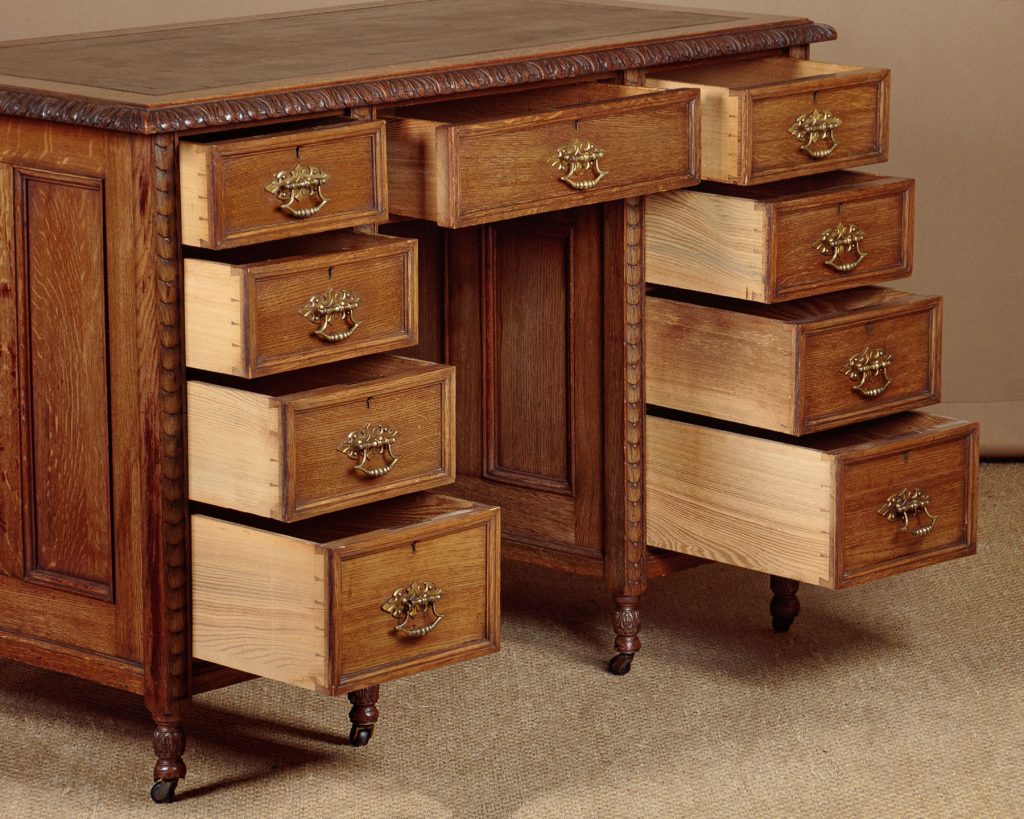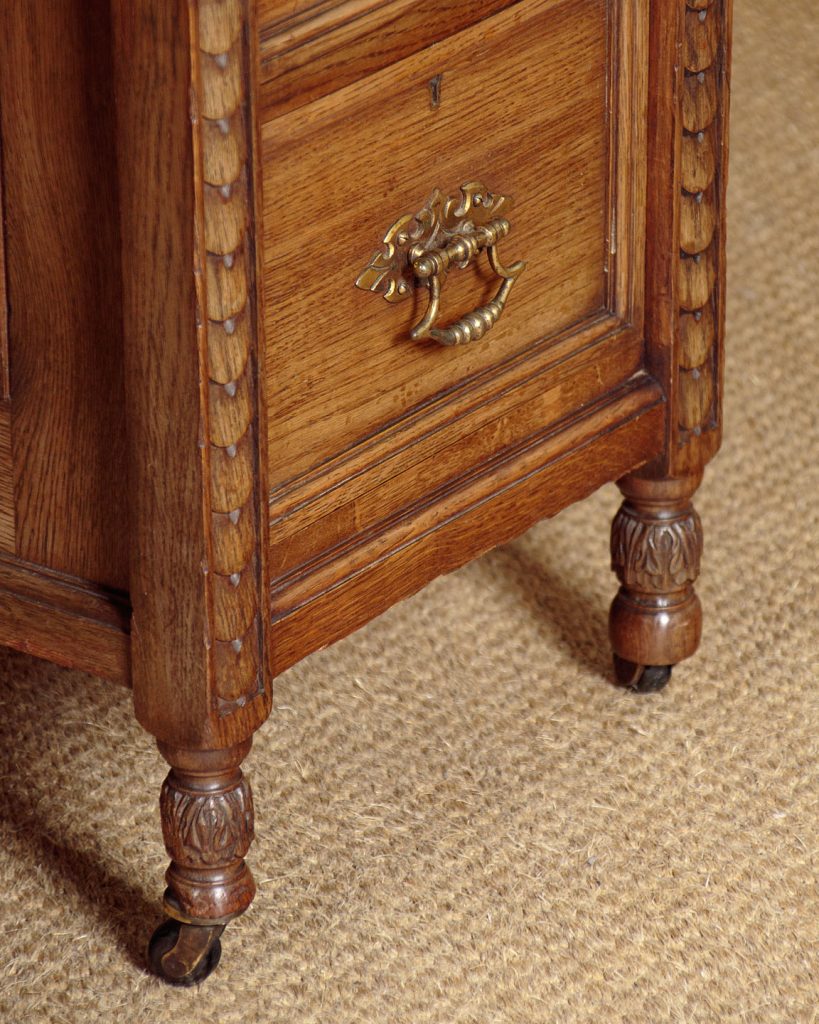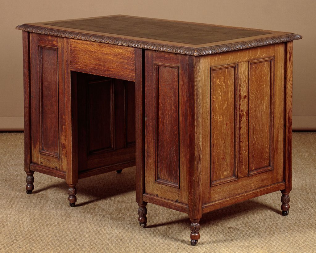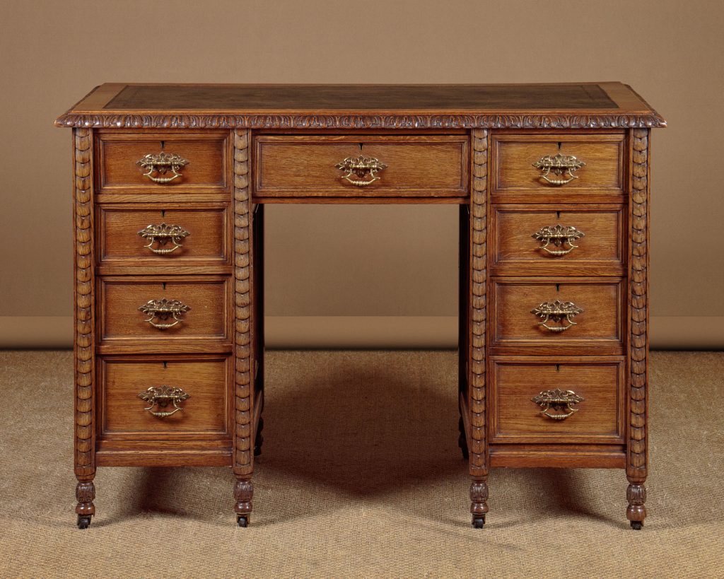 Great quality late 19th.c oak kneehole desk c.1890. 44" x 25" top with a dark green leather work surface and a carved edge. Single drawer above the kneehole flanked by two banks of four drawers of graduated height. Moulded drawer fronts with original brass handles, carved detail to the uprights either side of the drawers. Oak panelled sides and rear. Raised on short turned and carved legs with original castors below. Excellent condition, cleaned and waxed in our workshops. Please note for delivery this desk is in one piece.