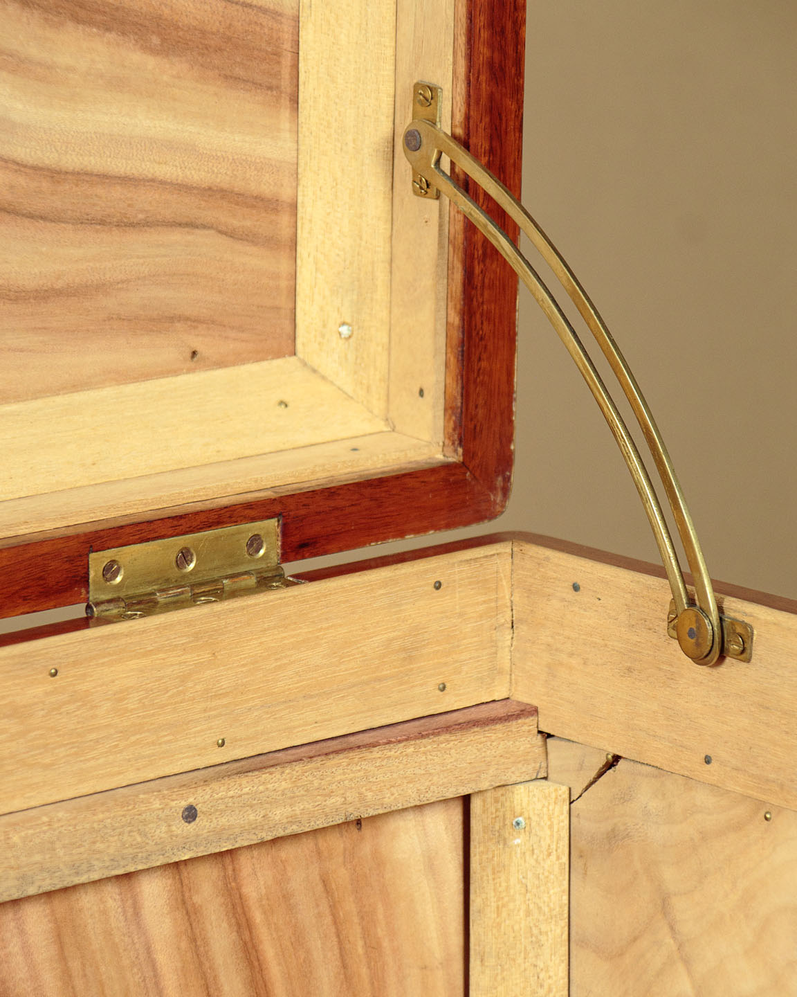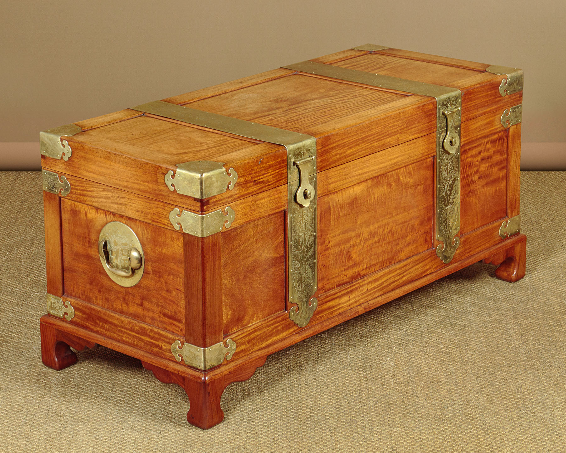 Splendid mid 20th.c. oriental brass bound chest c.1950. In solid camphor wood, a fragrant and pest resistant timber traditionally used for travelling chests as it helped protect the contents during passage. Oversized decorative brass bindings to the top front and rear, and also at the corners, with engraved decoration and Chinese characters. Large brass carry handles, also decorated, to the sides. Polished and decorated all round it would make a fine feature coffee table. Brass hinges and stay. Excellent colour and condition, cleaned and waxed in our workshops.
