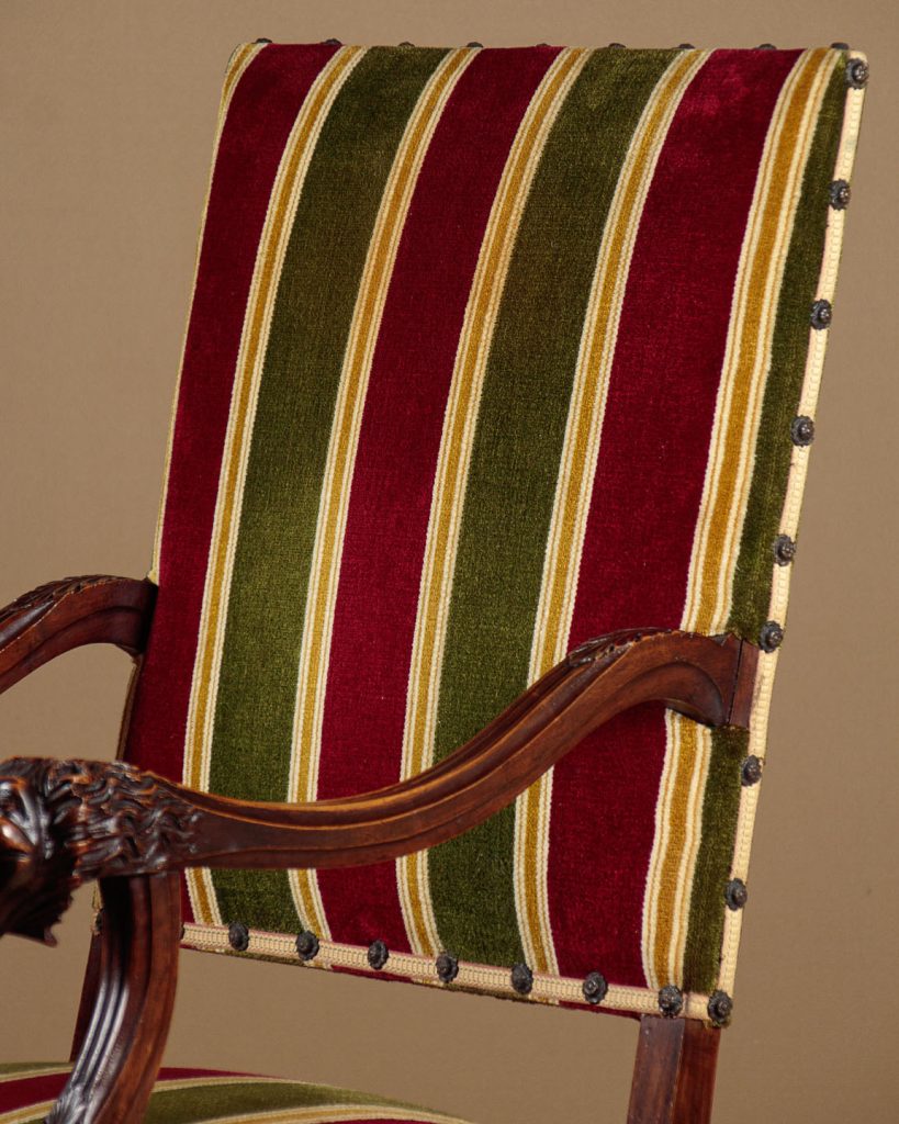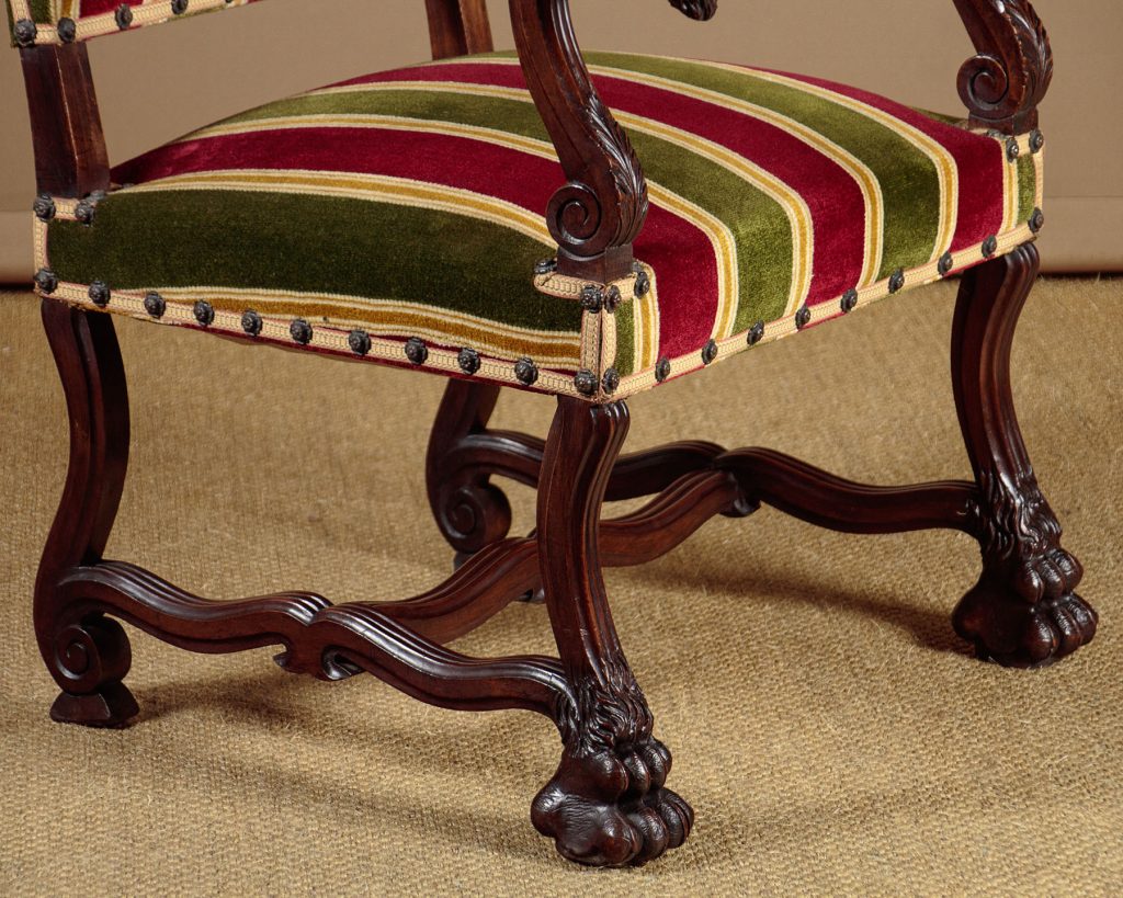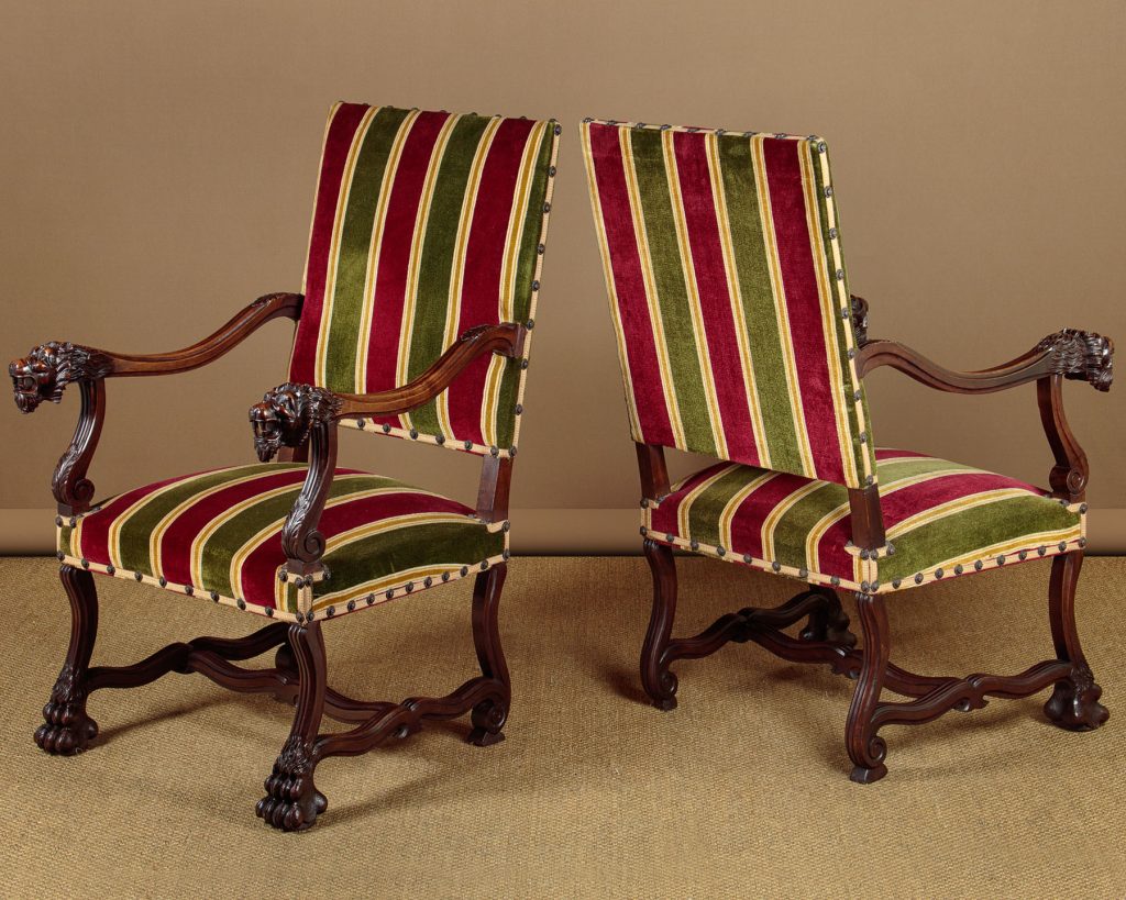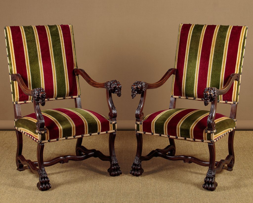 Splendid pair of large Louis XIV style walnut open armchairs c.1900. High backrests and large sprung seats upholstered in a rich red, green and gold stripe chenille with unusual rose head studs at the edges. Shaped and moulded walnut frames featuring superb carved lion heads to the arm terminals. Note also the large paw feet, carved acanthus detail and scrolling back feet. Excellent colour and condition, cleaned and waxed in our workshops. With clean and serviceable upholstery.