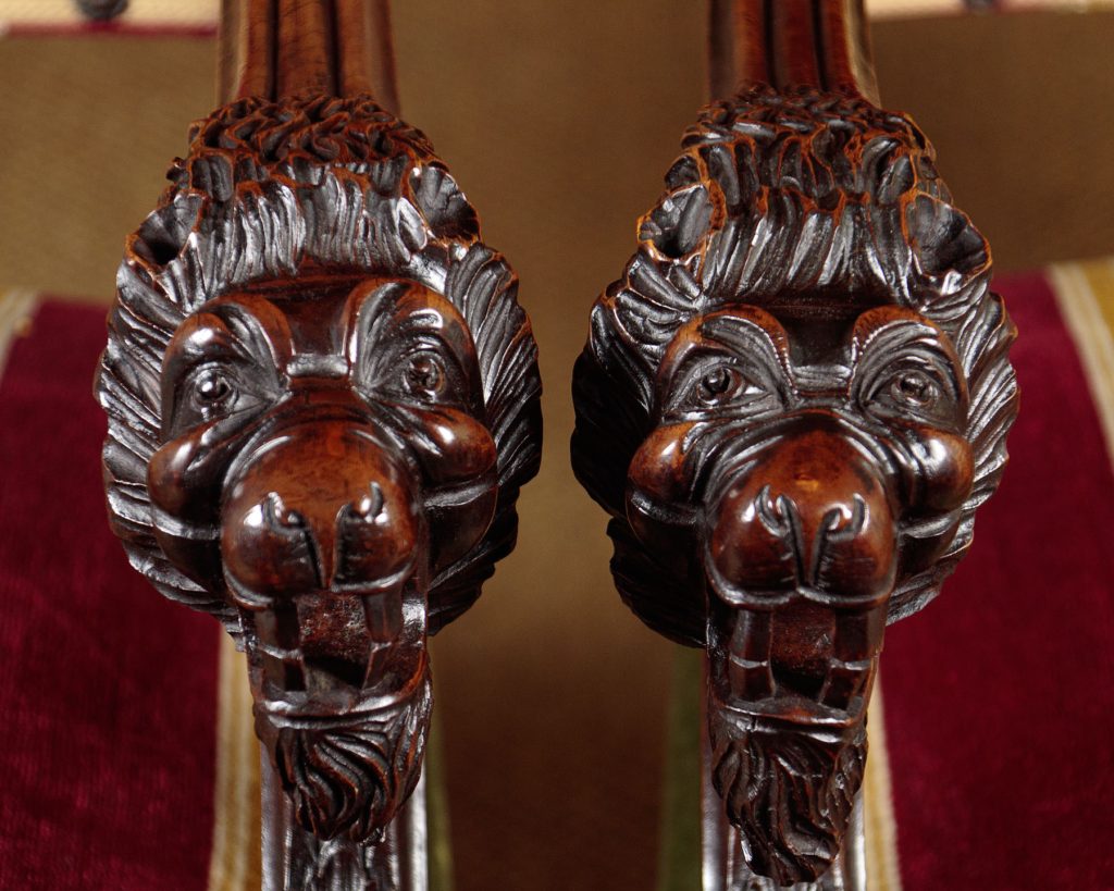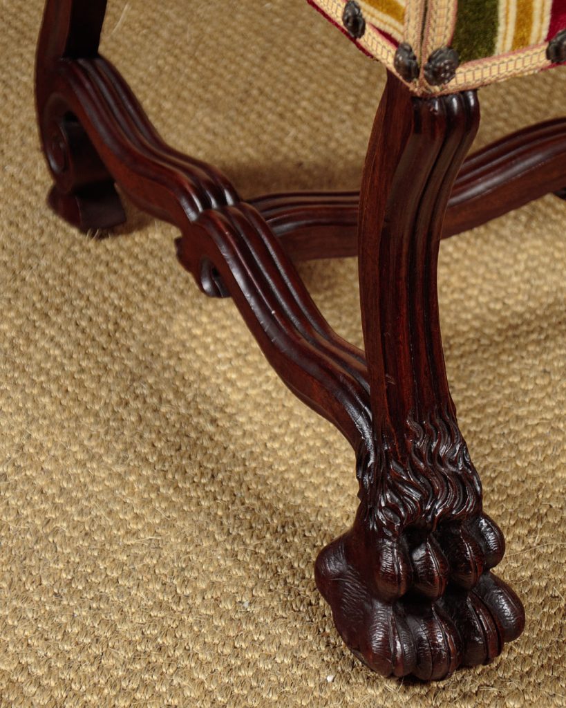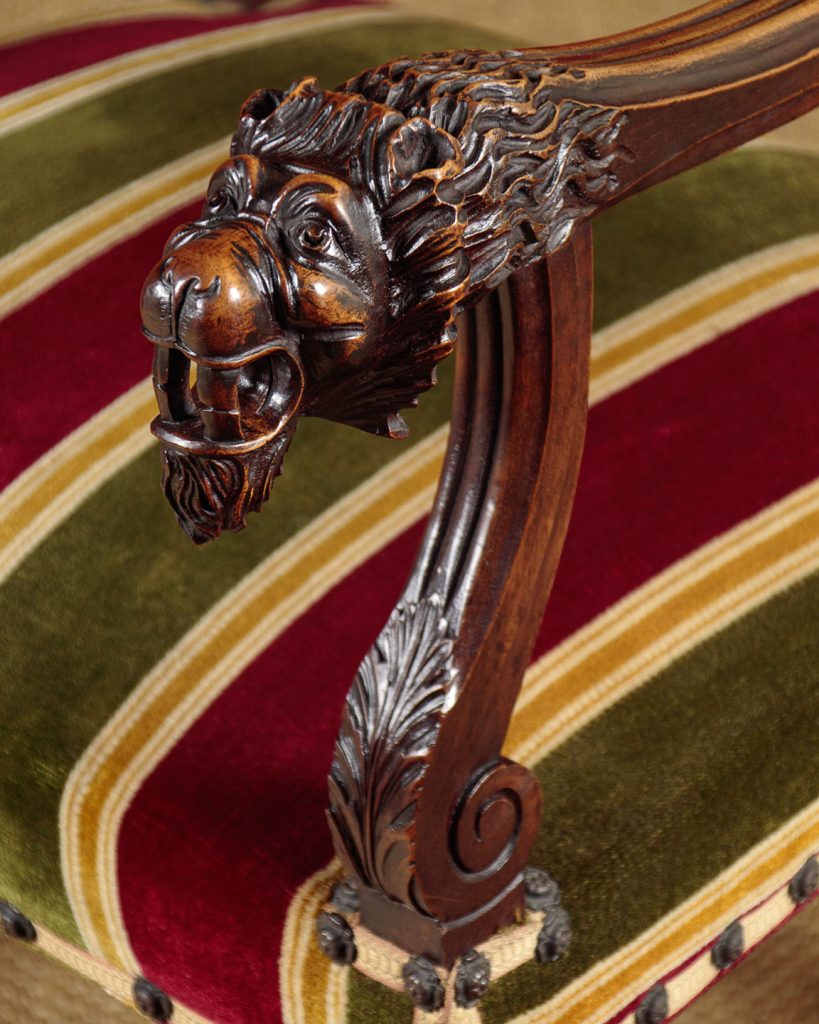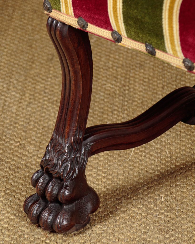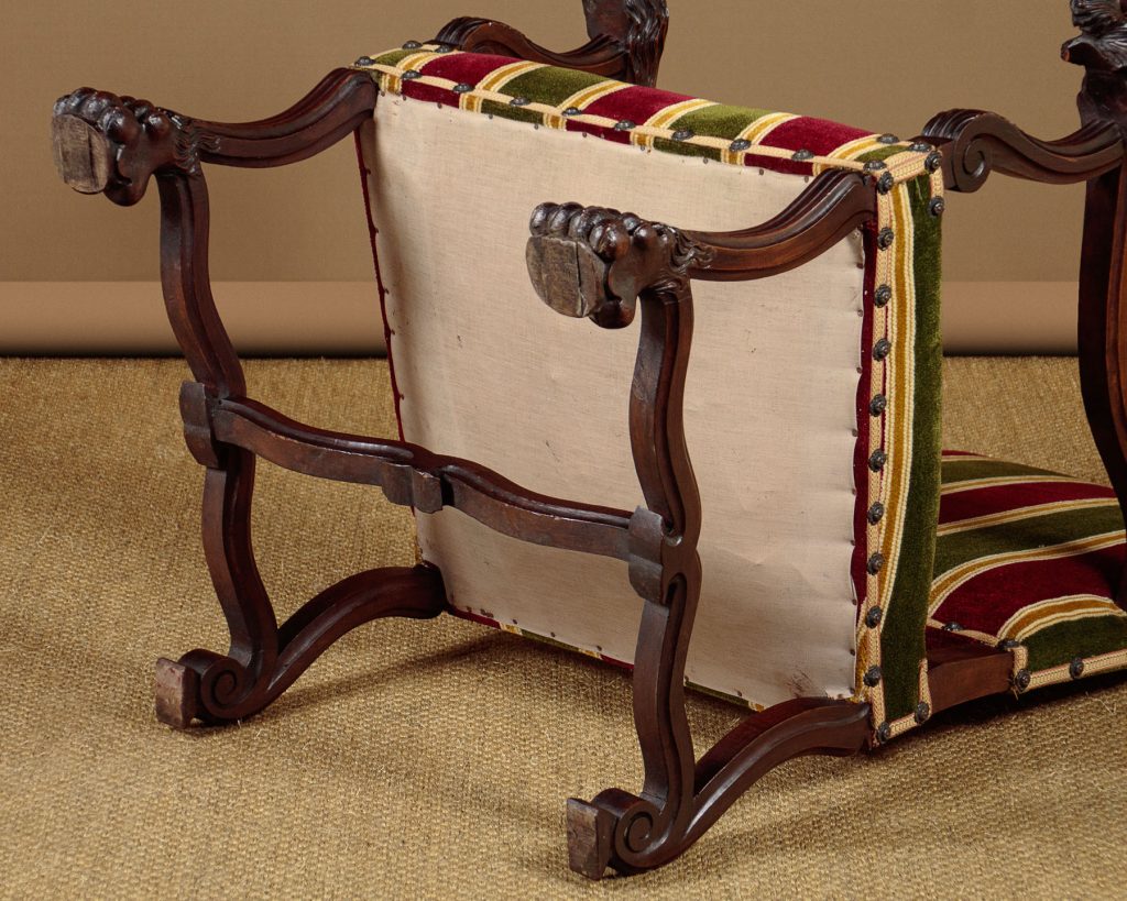 Splendid pair of large Louis XIV style walnut open armchairs c.1900. High backrests and large sprung seats upholstered in a rich red, green and gold stripe chenille with unusual rose head studs at the edges. Shaped and moulded walnut frames featuring superb carved lion heads to the arm terminals. Note also the large paw feet, carved acanthus detail and scrolling back feet. Excellent colour and condition, cleaned and waxed in our workshops. With clean and serviceable upholstery.