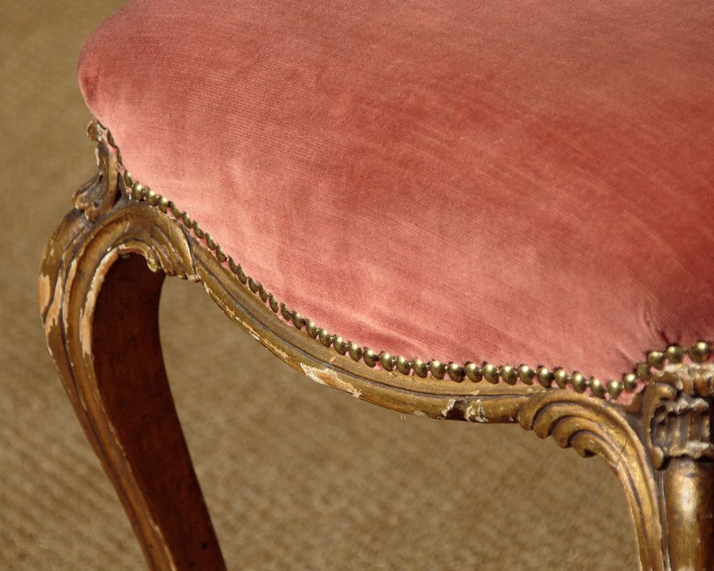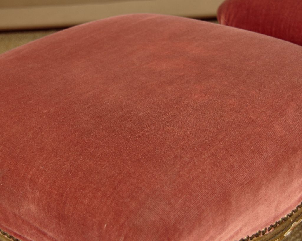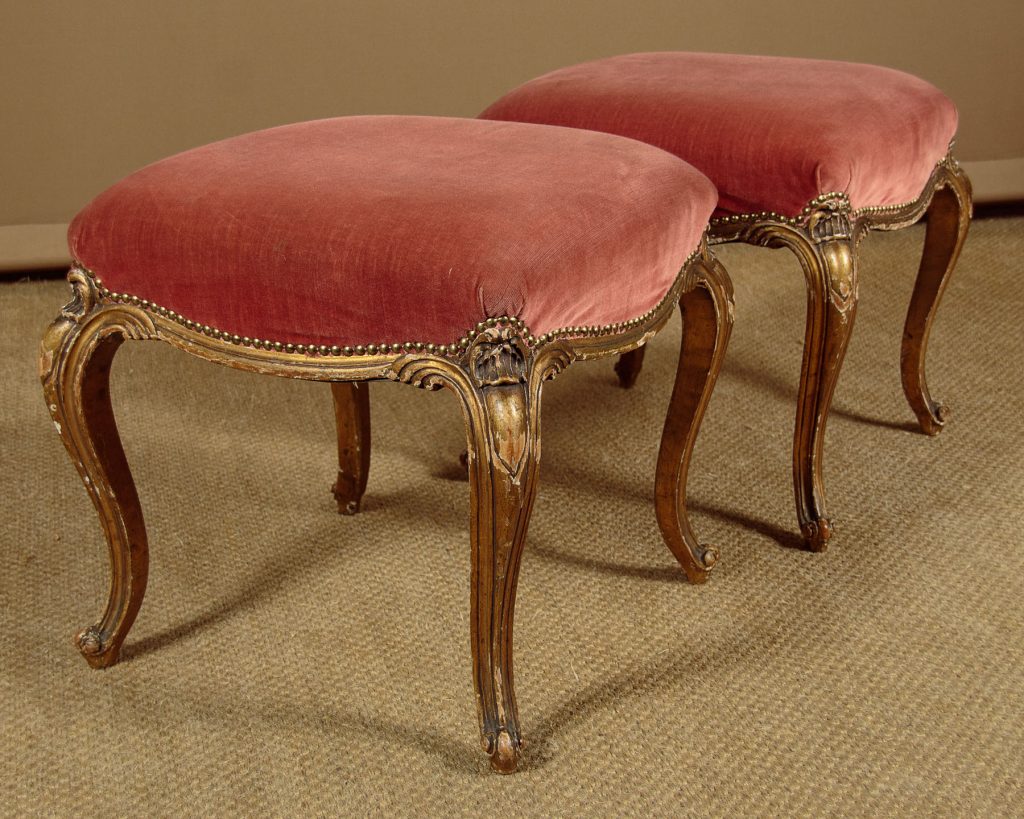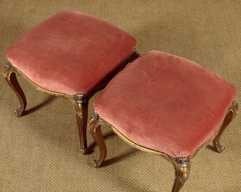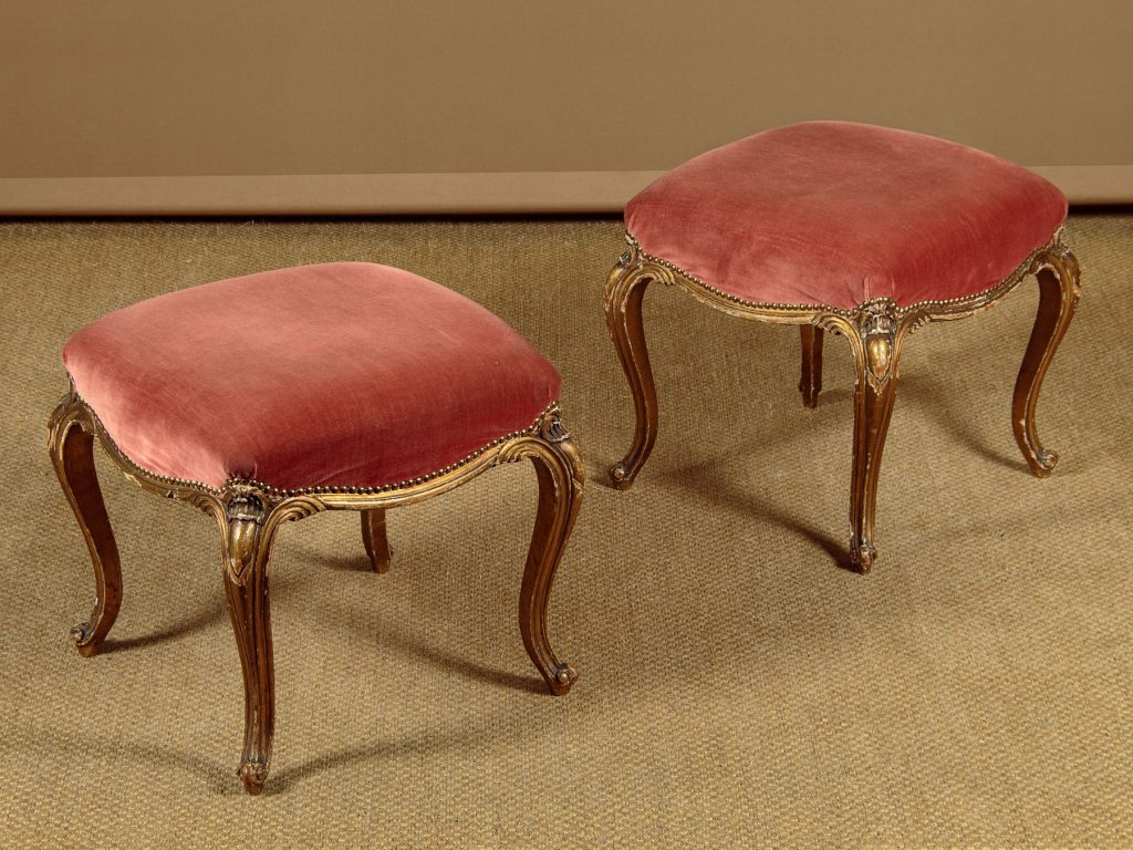 Pair of giltwood stools c.1900. 18" square seat pads upholstered in a pink velvet chenille. Shapely giltwood frames with unusual carved detail and cabriole legs with scrolling feet. Obvious distress to the gilding on both stools. Otherwise good solid condition with clean and serviceable covers.