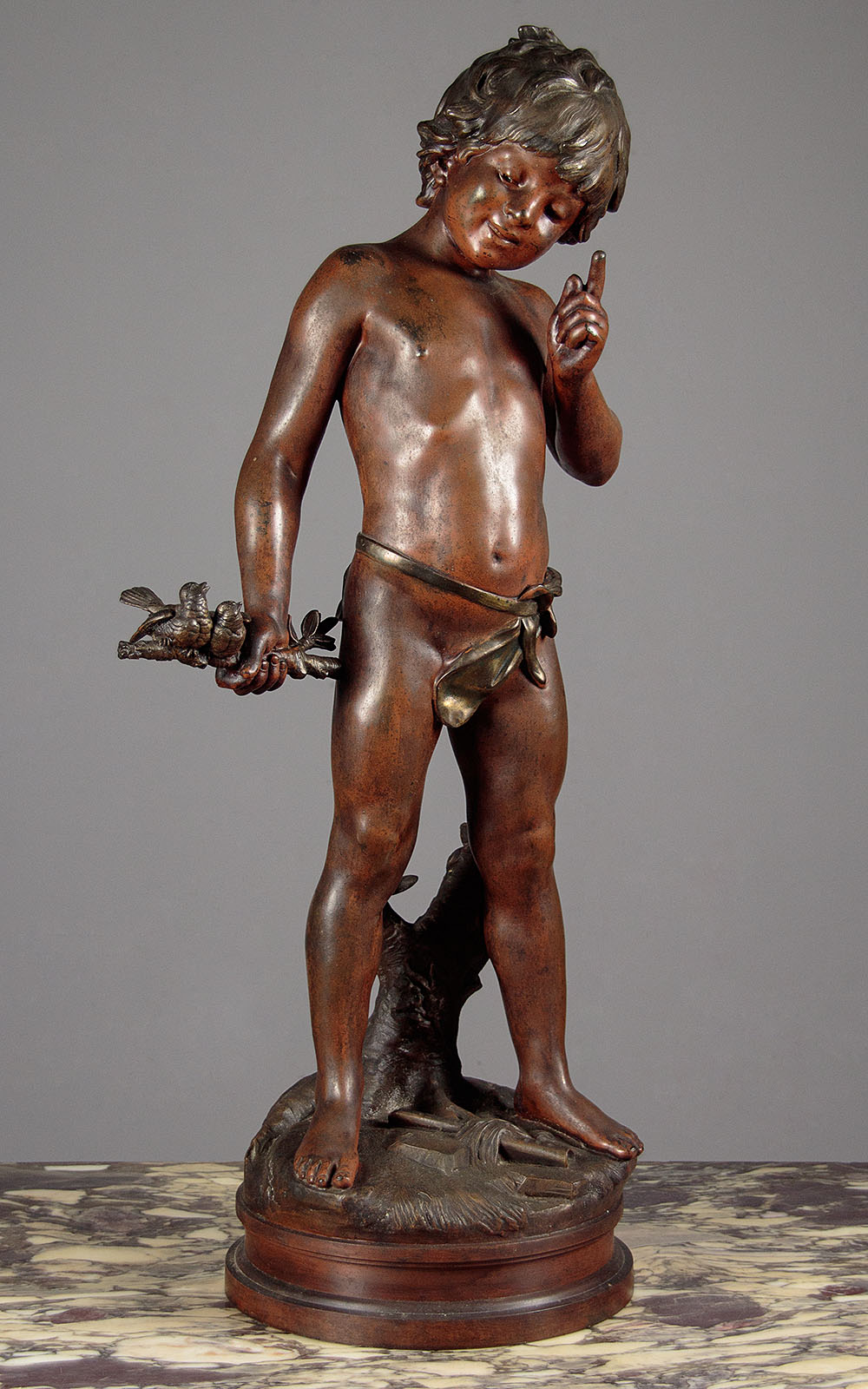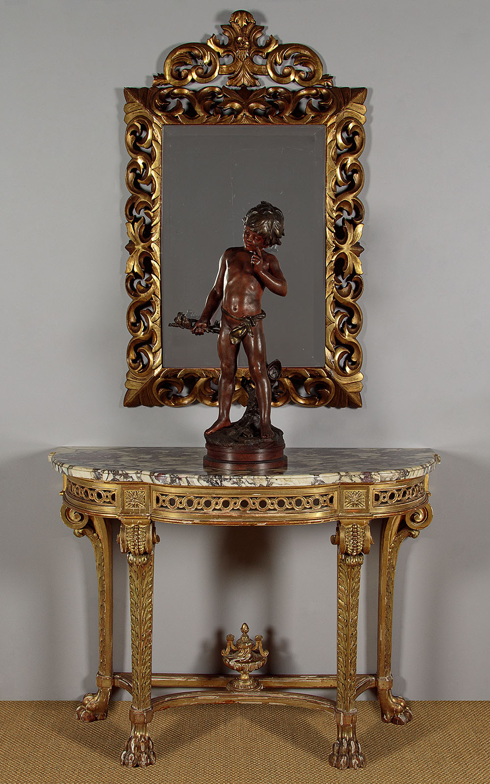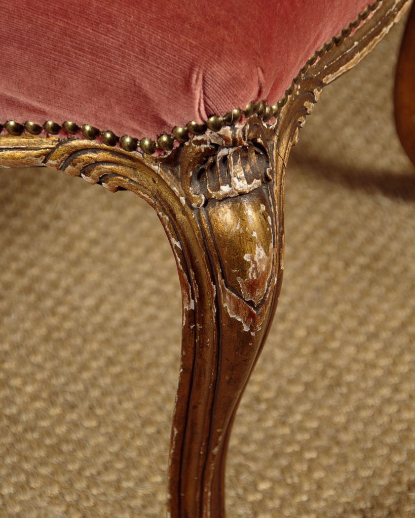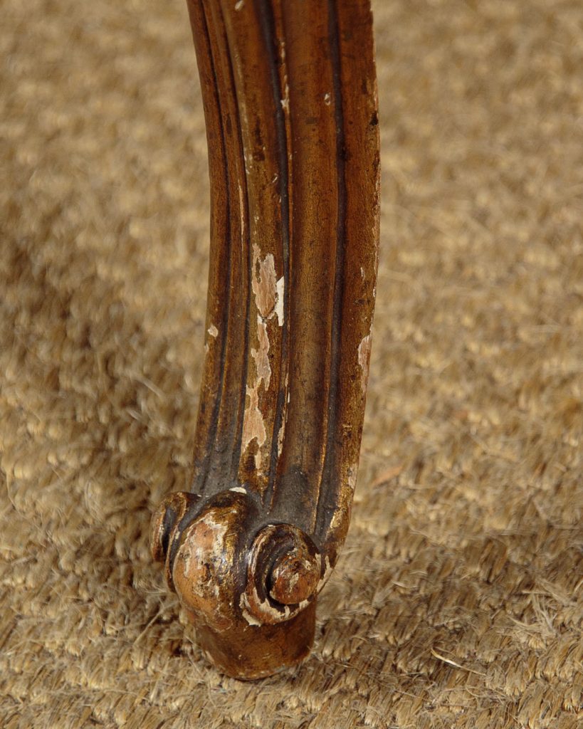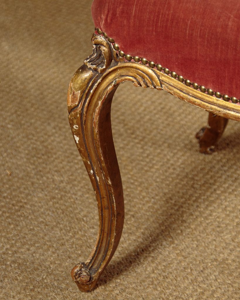 Pair of giltwood stools c.1900. 18" square seat pads upholstered in a pink velvet chenille. Shapely giltwood frames with unusual carved detail and cabriole legs with scrolling feet. Obvious distress to the gilding on both stools. Otherwise good solid condition with clean and serviceable covers.