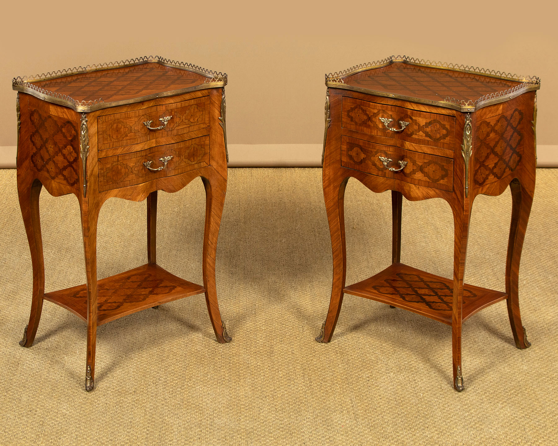 Beautiful pair of small marble top bedside cabinets c.1930. Just 13" wide. Ideal as bedside cabinets or as lamp tables perhaps. Rouge marble tops with serpentine front edge and raised sides over four drawers plus a pull out slide with leather skiver. Highly figured tulipwood parquetry veneers arranged in a symmetrical pattern across the fronts and sides with cast brass handles. Shaped apron and legs with brass mounts to the front feet. Some minor wear to the veneers, otherwise very good colour and condition, cleaned and waxed in our workshops.