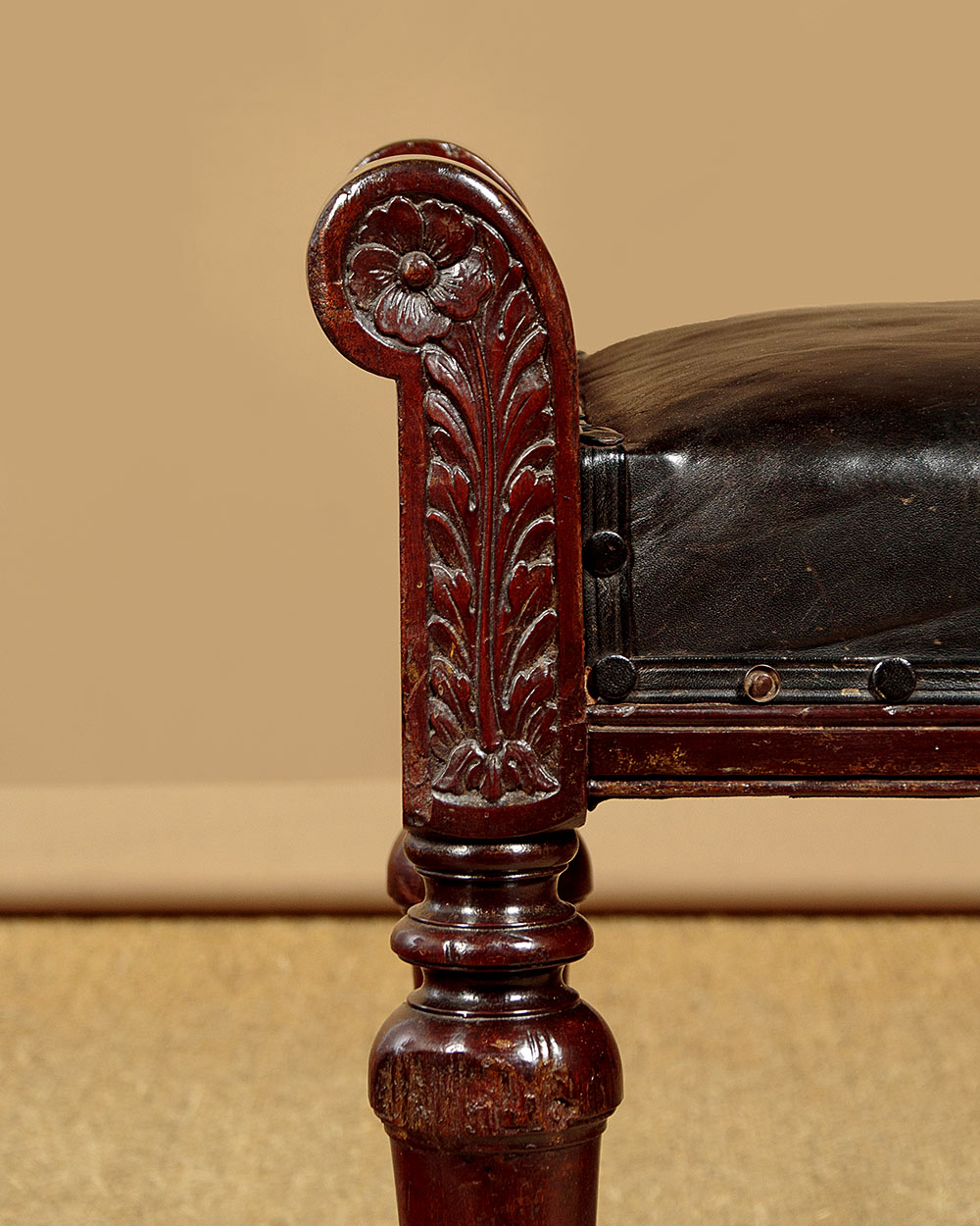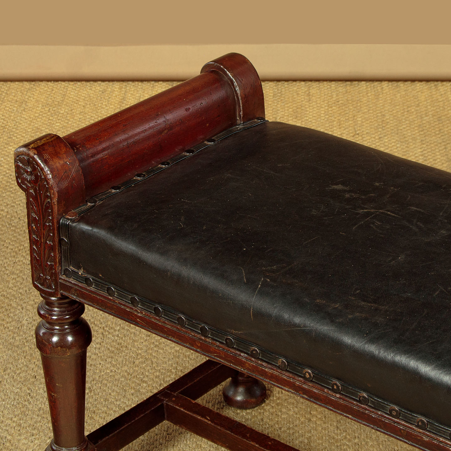 Handsome pair of late 19th.c. mahogany and leather benches c.1880. 41" x 16" padded seats (height 18") in black leather. Solid mahogany frames with raised roll-over ends carved with a flower detail to one face on both stools (the other face left plain). Raised on turned and tapering legs joined with an H stretcher for strength. Some obvious old wear but solid and sturdy, cleaned and waxed in our workshops.