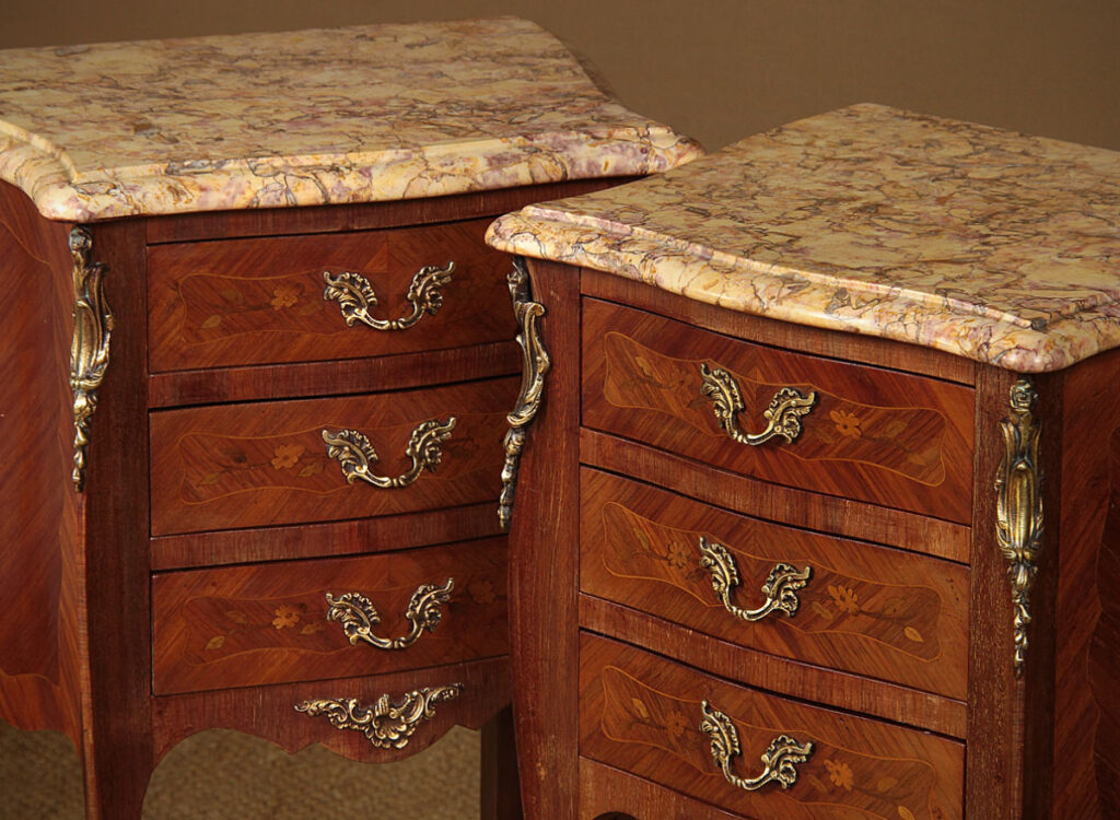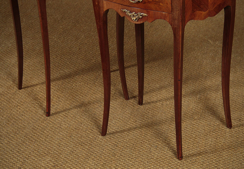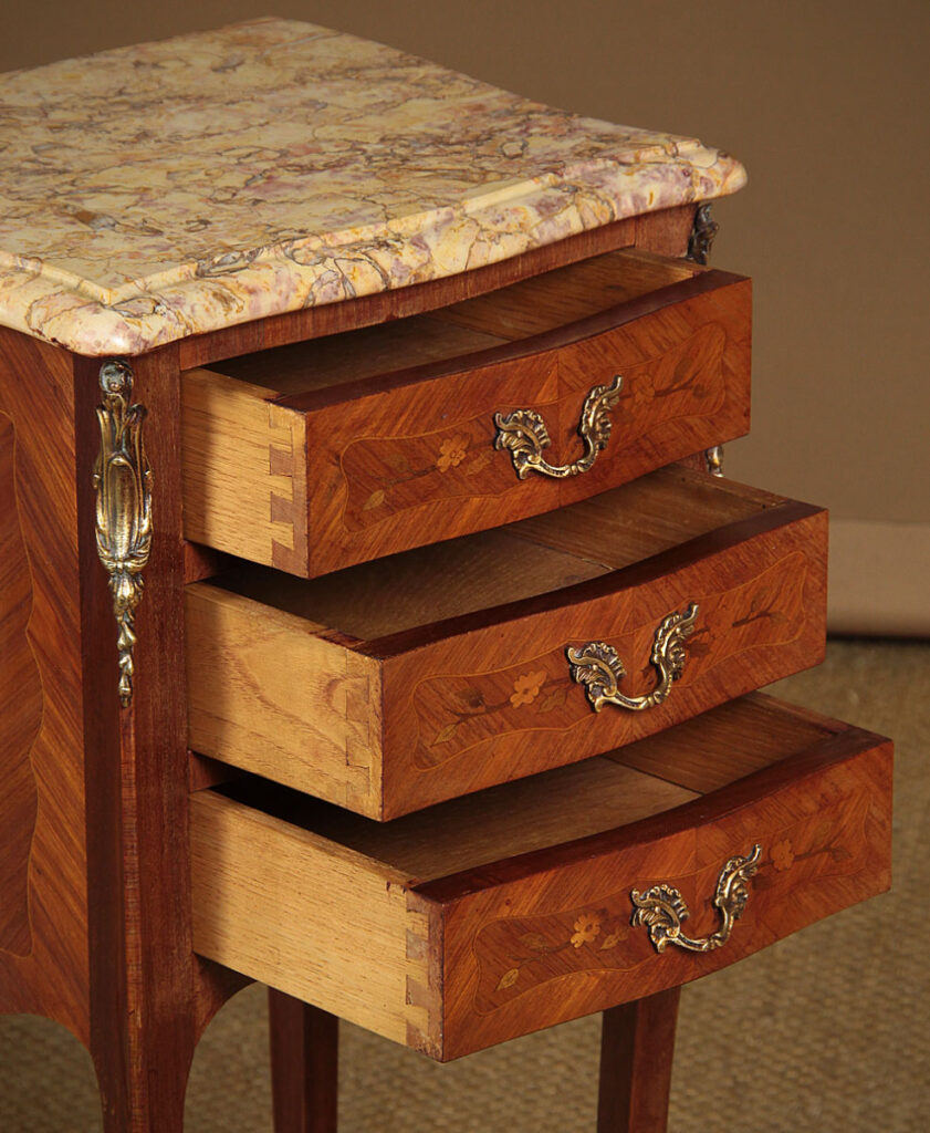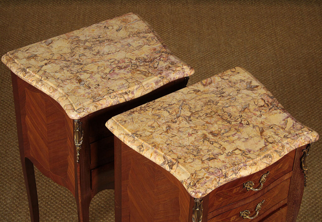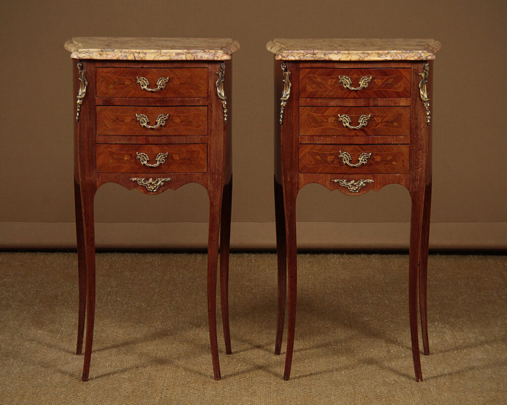 Good looking pair of French marble top side tables c.1950. Ideal as bedsides or as lamp tables in a living room perhaps. Marble tops with serpentine moulded edges over three drawers. Symmetrically arranged rosewood veneers to the front and sides with inlaid floral marquetry detail and inlaid stringing. Decorative brass handles and mounts to the shoulders and apron. Raised on slim shaped legs front and rear. Excellent colour and condition, cleaned and waxed in our workshops.