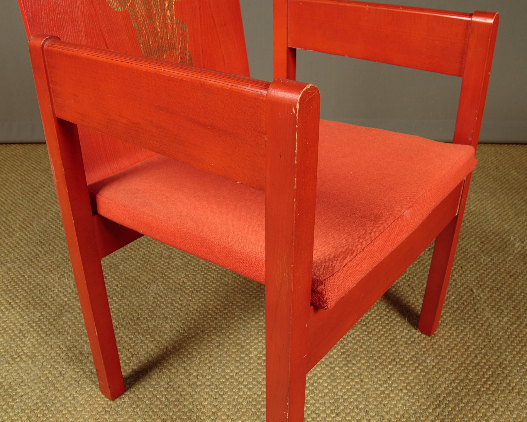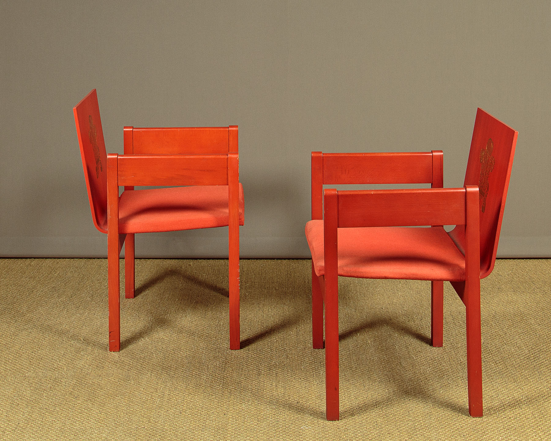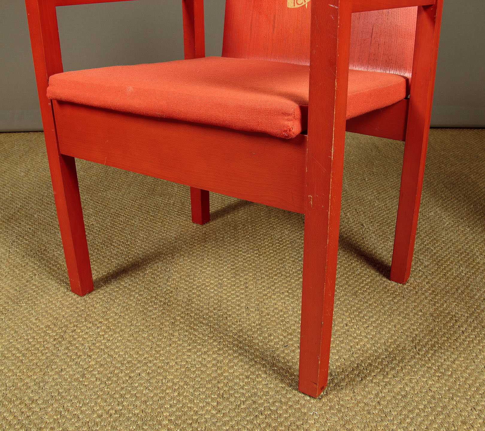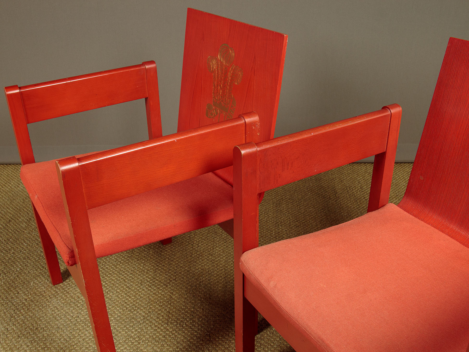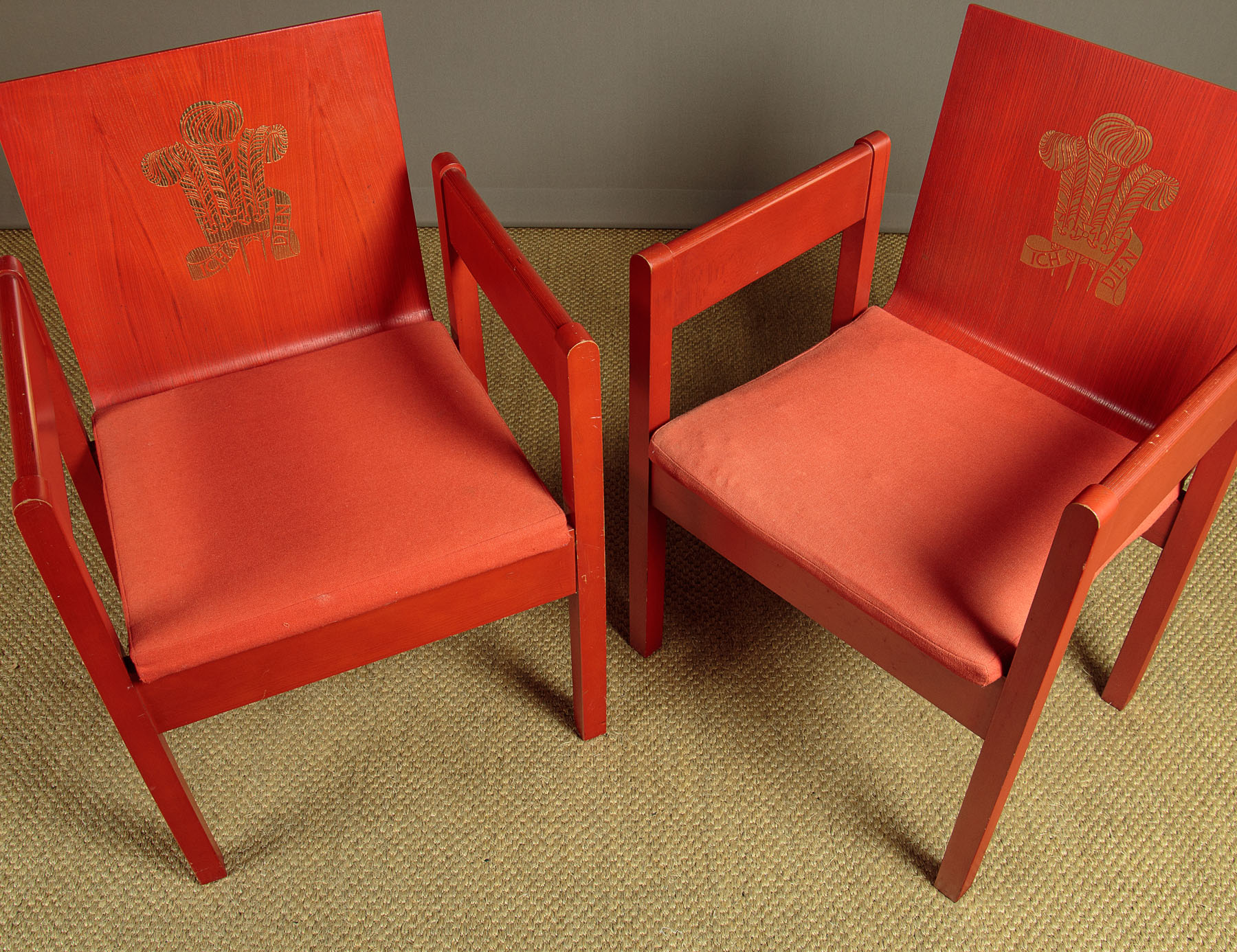 A rare pair of the famous red chairs produced for the investiture ceremony of the Prince of Wales at Caernarfon castle on July 1st 1969. Striking mid-century modern design, in vermilion stained beech and bent plywood. The gilded three feathers motif is cleverly impressed onto the back rest to prevent wear to the gilding. Date stamp on the underside. Presented as found, with some minor wear to the paintwork and as is typical the foam in the seats has gone brittle. Otherwise very good original condition.