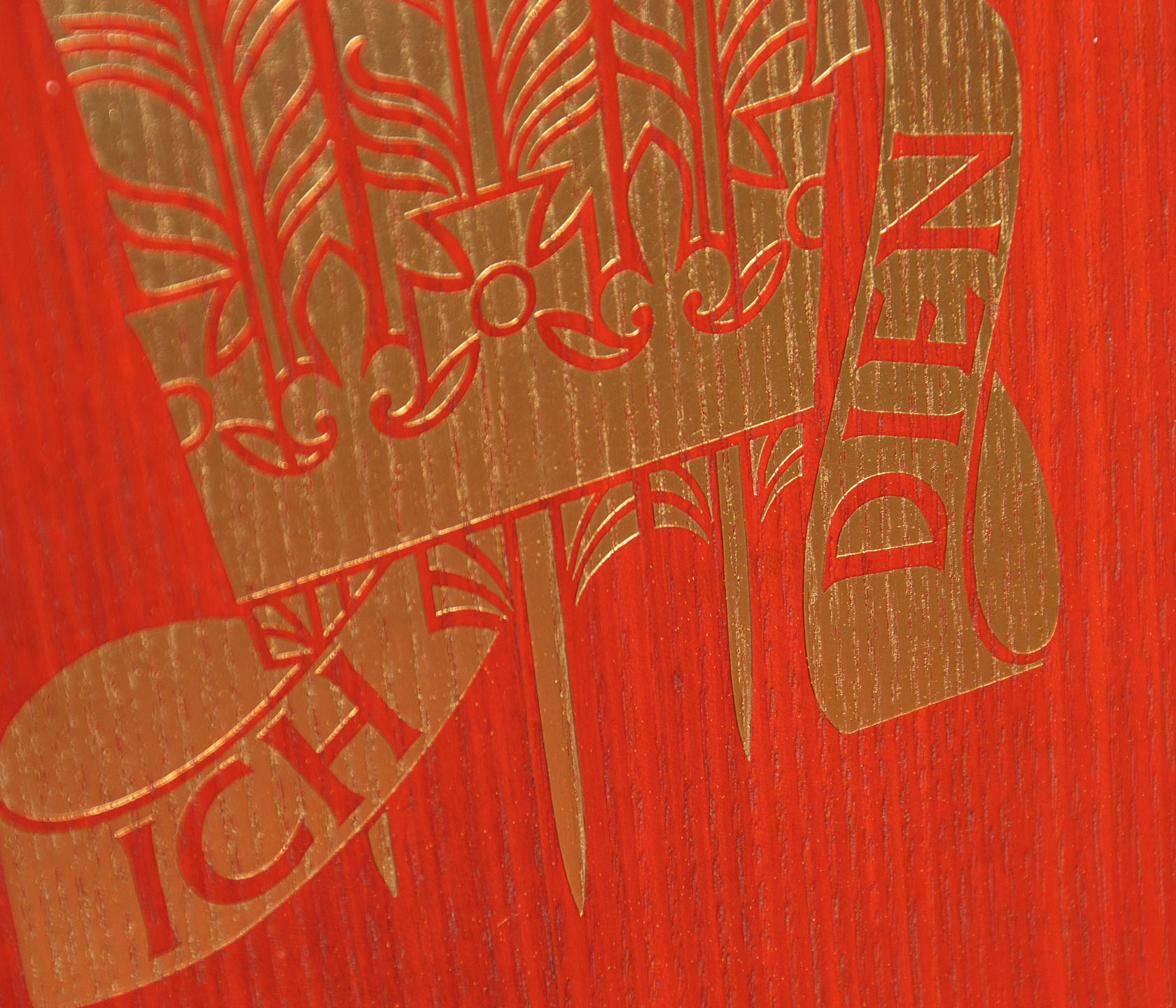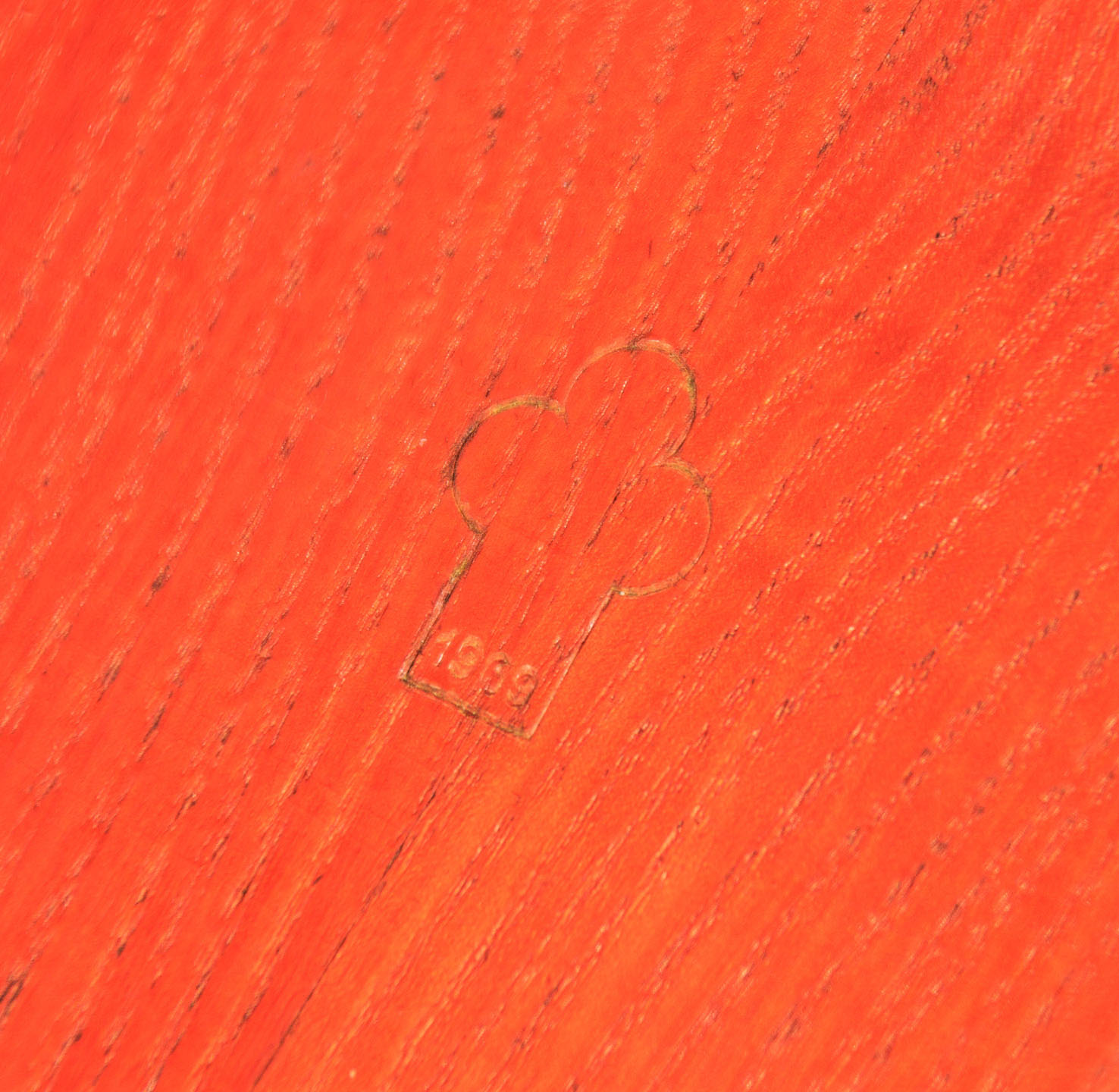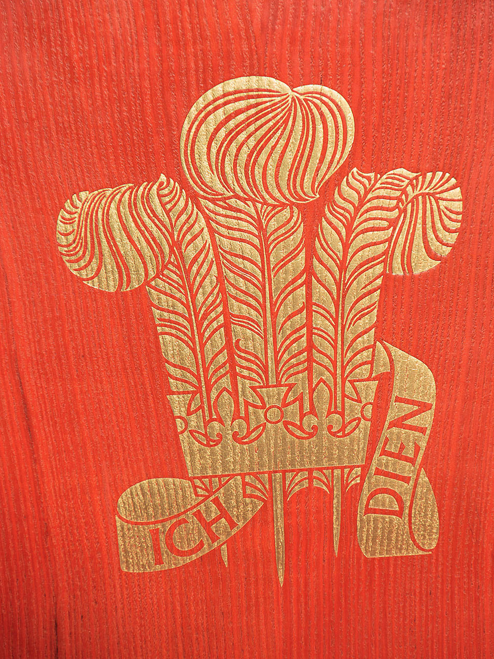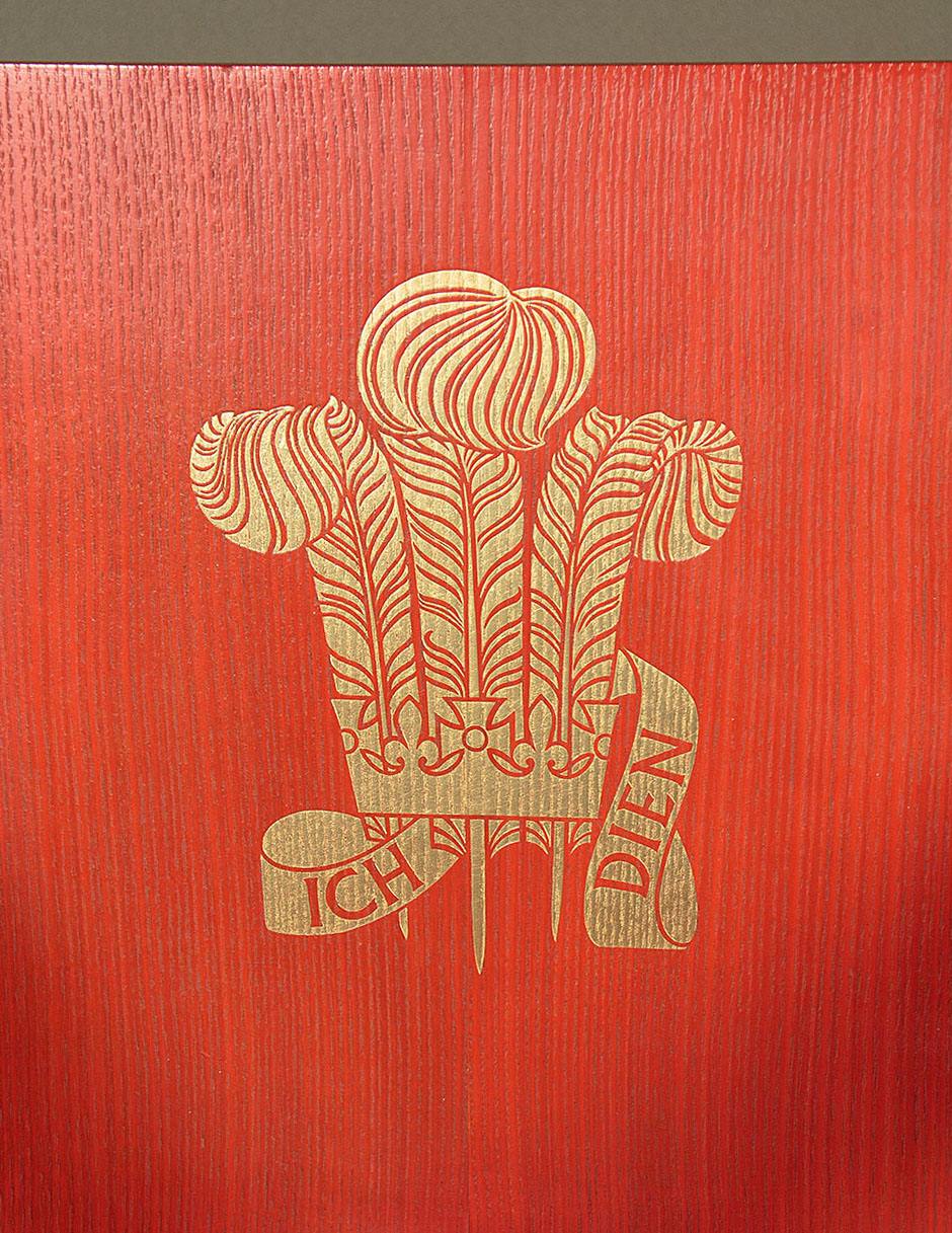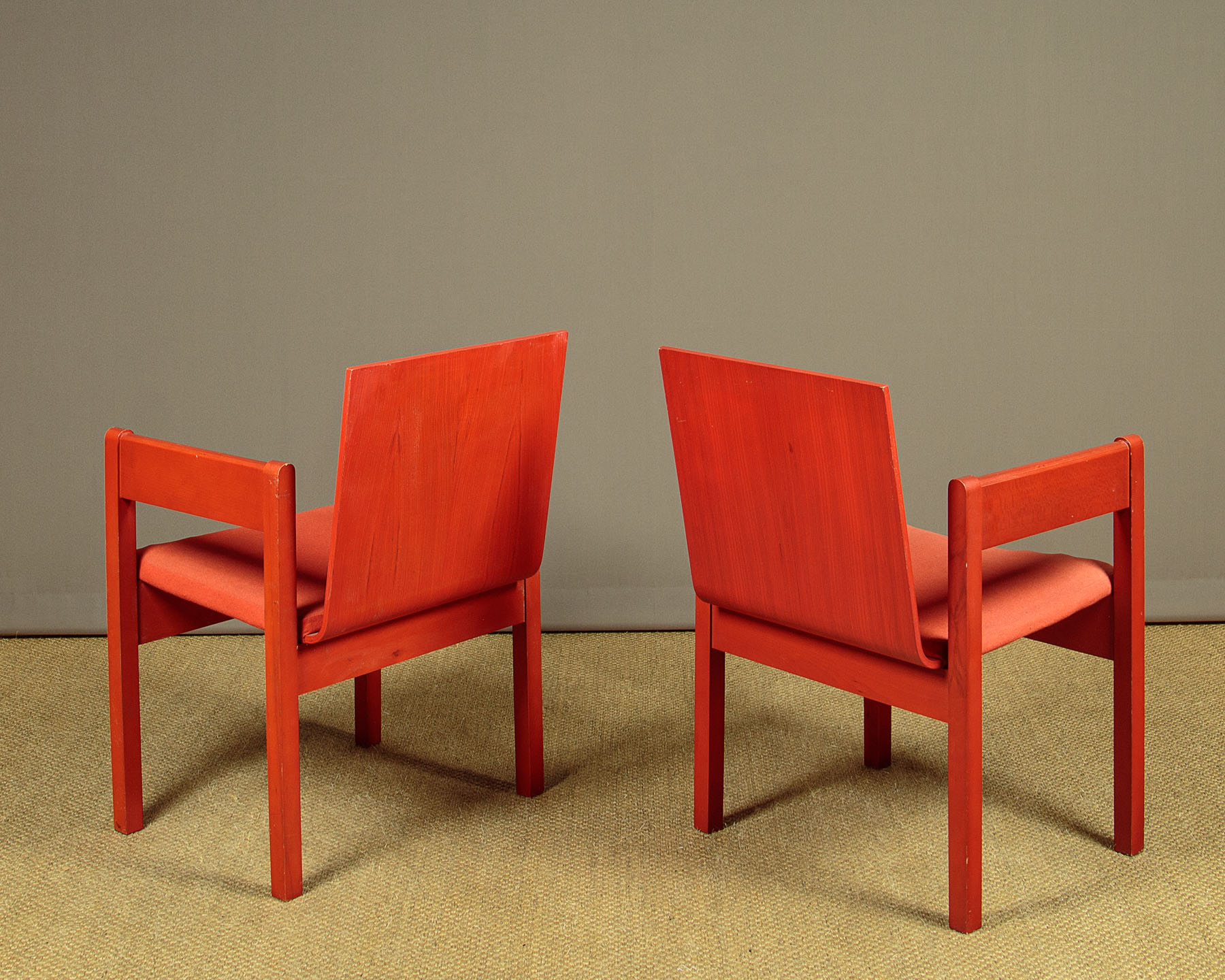 A rare pair of the famous red chairs produced for the investiture ceremony of the Prince of Wales at Caernarfon castle on July 1st 1969. Striking mid-century modern design, in vermilion stained beech and bent plywood. The gilded three feathers motif is cleverly impressed onto the back rest to prevent wear to the gilding. Date stamp on the underside. Presented as found, with some minor wear to the paintwork and as is typical the foam in the seats has gone brittle. Otherwise very good original condition.