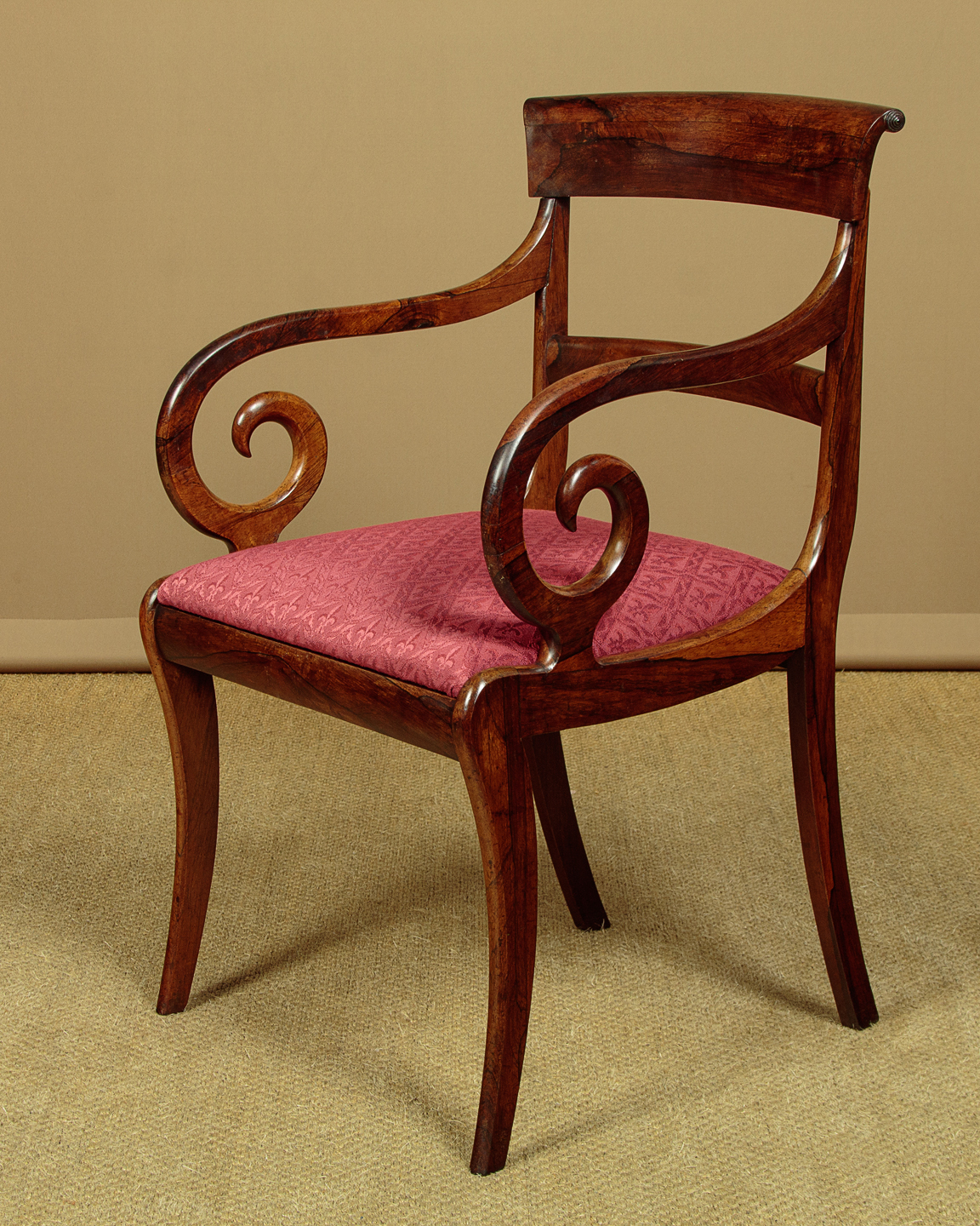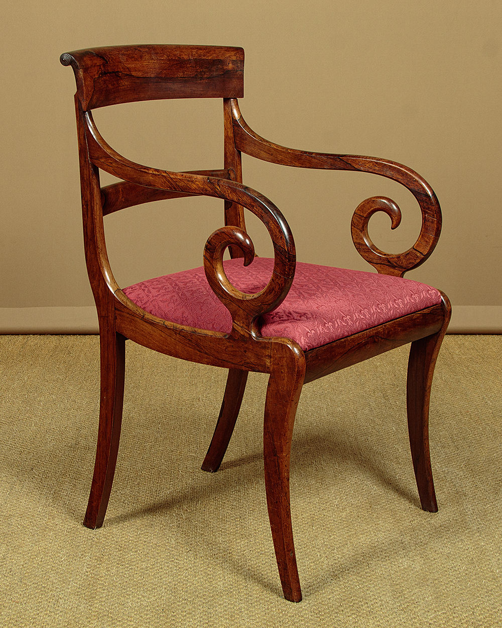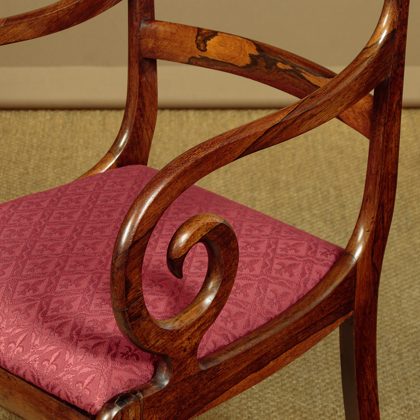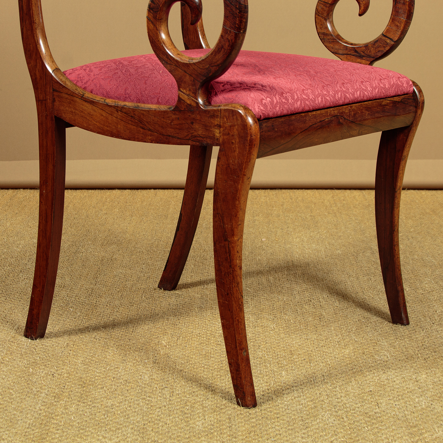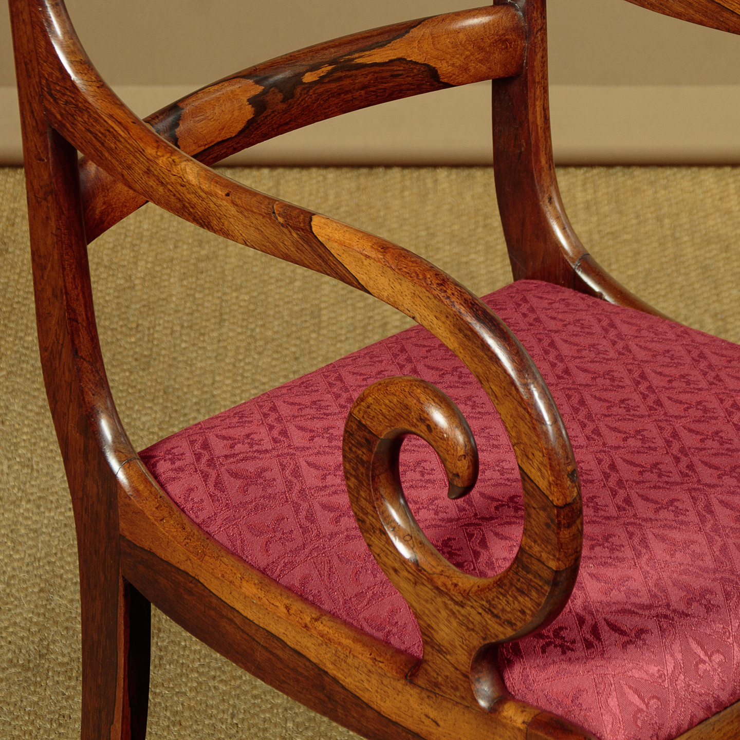 Handsome pair of English Regency rosewood scroll armchairs c.1830. Highly figured solid rosewood frames featuring flared and curved top rails with roll-over tops and turned roundels at the edges. Curved back stretchers and slim arms flowing into a graceful scroll with pointed ends. Loose seat pads freshly upholstered in a burgundy flat weave with a fleur-de-lis pattern. Raised on sabre legs. With an earlier repair to one of the arms, otherwise very good condition. Cleaned and waxed in our workshops.