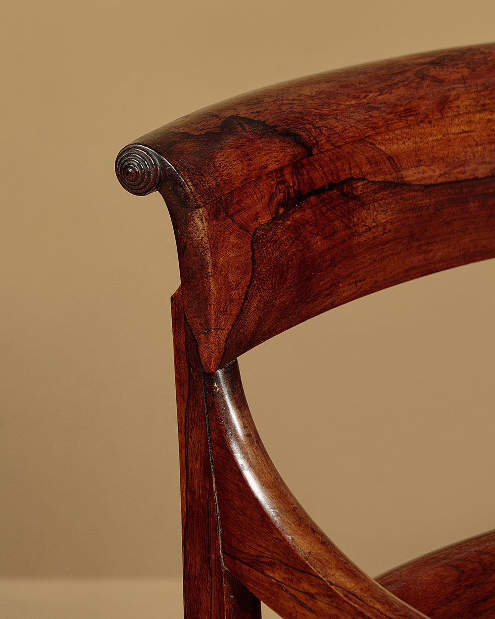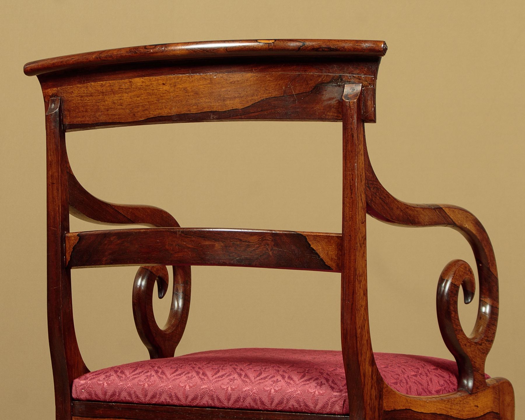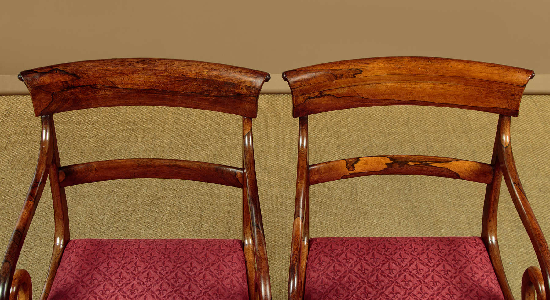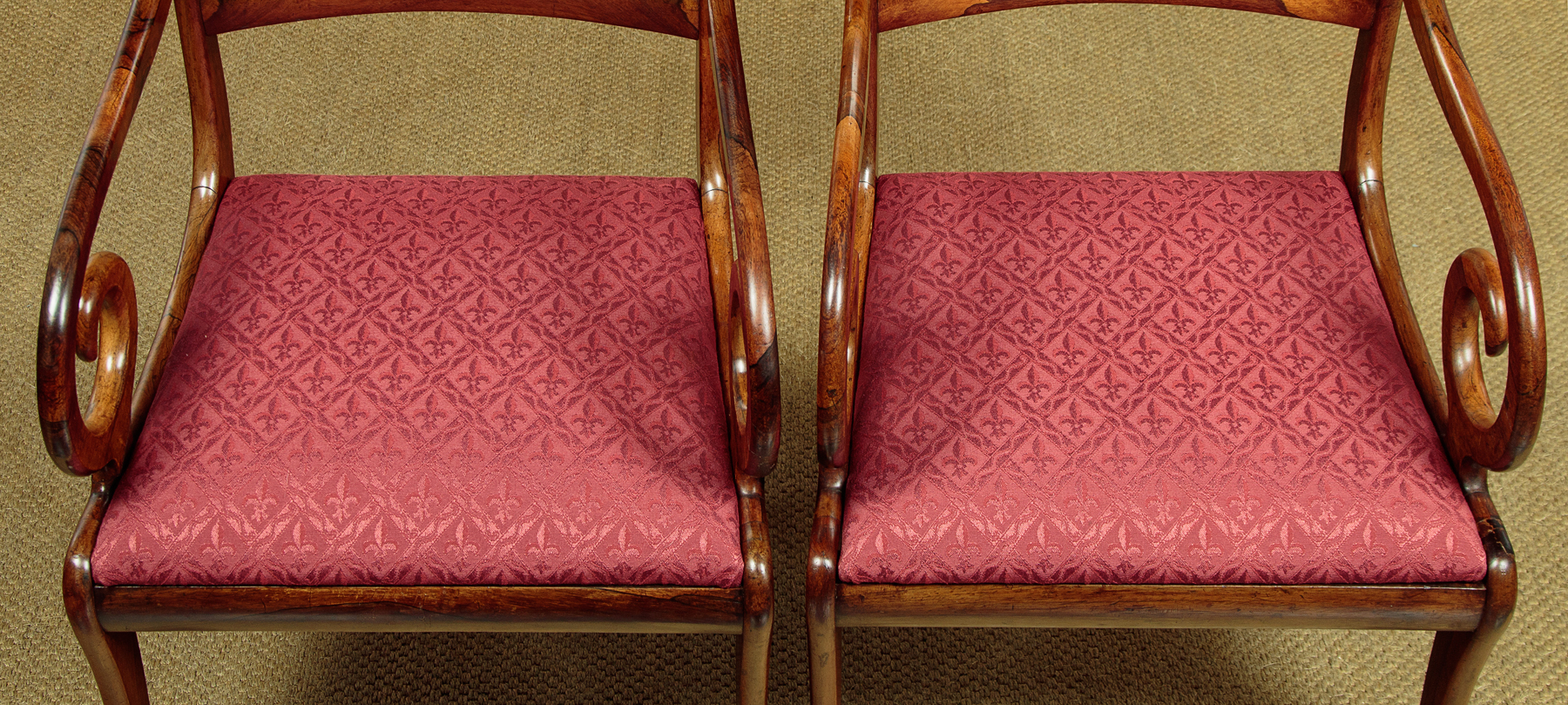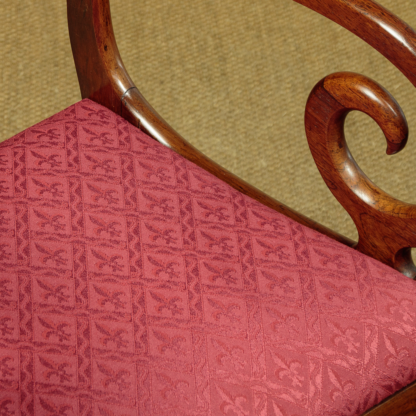 Handsome pair of English Regency rosewood scroll armchairs c.1830. Highly figured solid rosewood frames featuring flared and curved top rails with roll-over tops and turned roundels at the edges. Curved back stretchers and slim arms flowing into a graceful scroll with pointed ends. Loose seat pads freshly upholstered in a burgundy flat weave with a fleur-de-lis pattern. Raised on sabre legs. With an earlier repair to one of the arms, otherwise very good condition. Cleaned and waxed in our workshops.