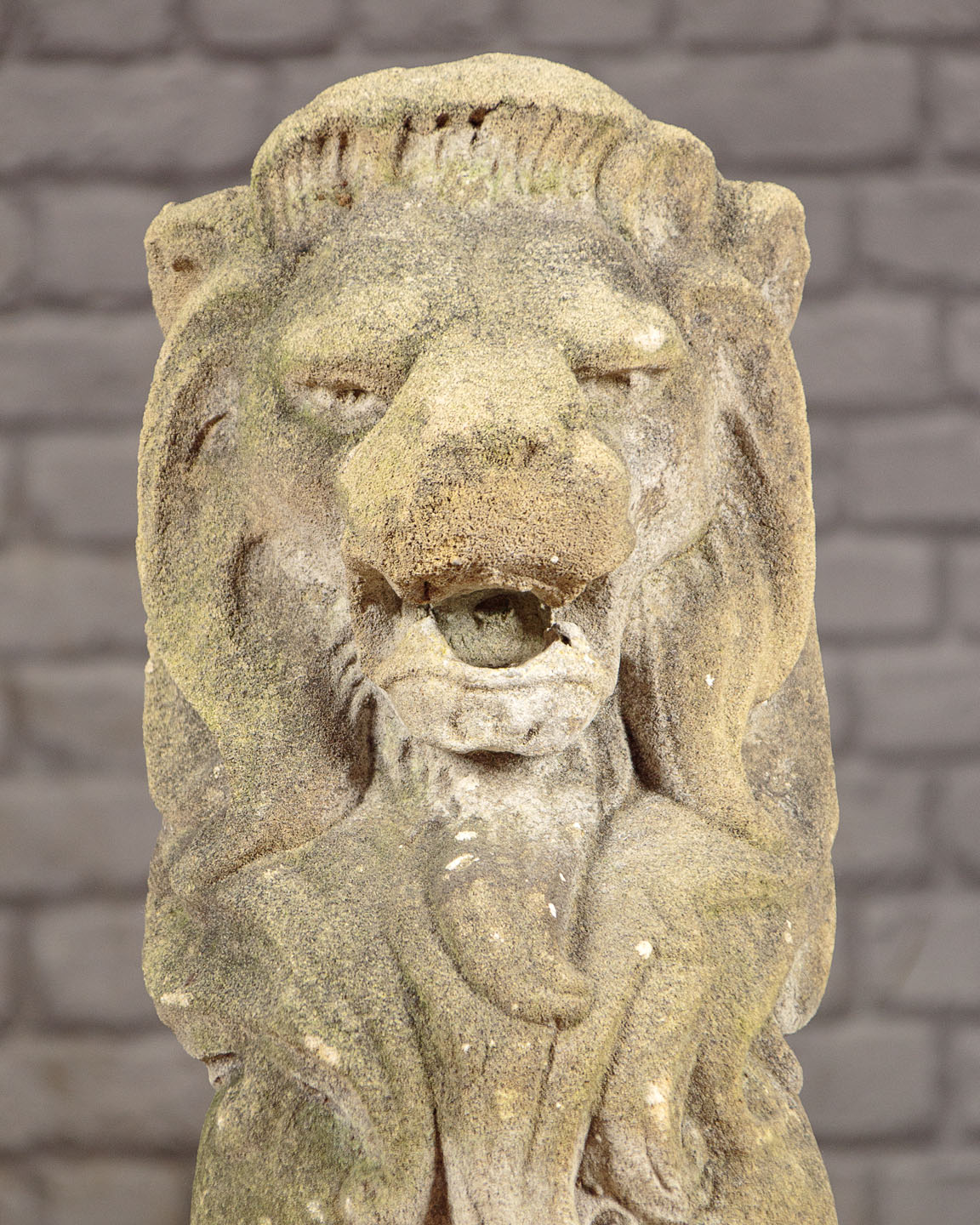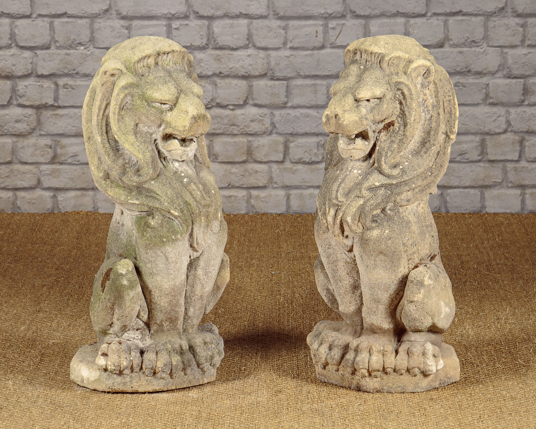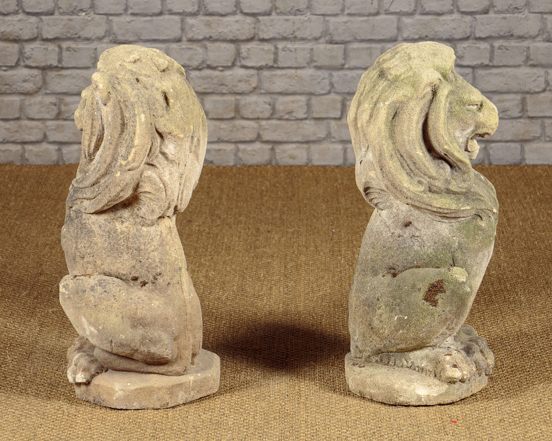Fine pair of reconstituted stone lions c.1950. Ideal for the top of gateposts or similar garden use. In a seated pose, or sejant as it’s known in heraldry, on octagonal plinth bases. Excellent condition, nicely worn and weathered with age.