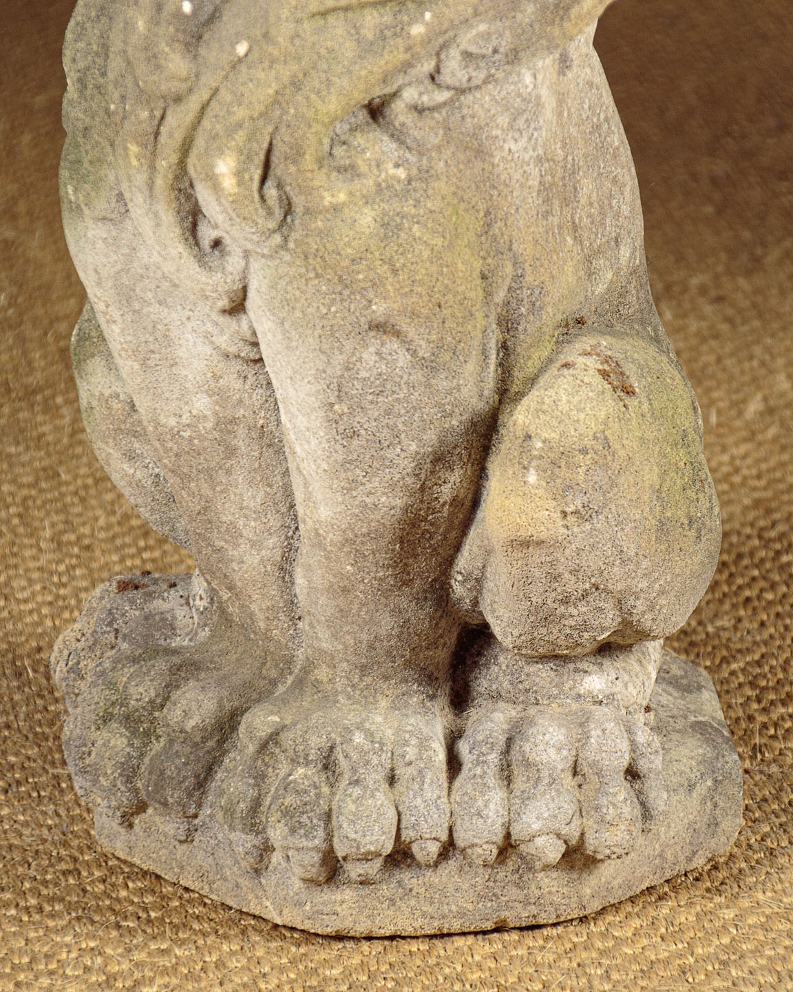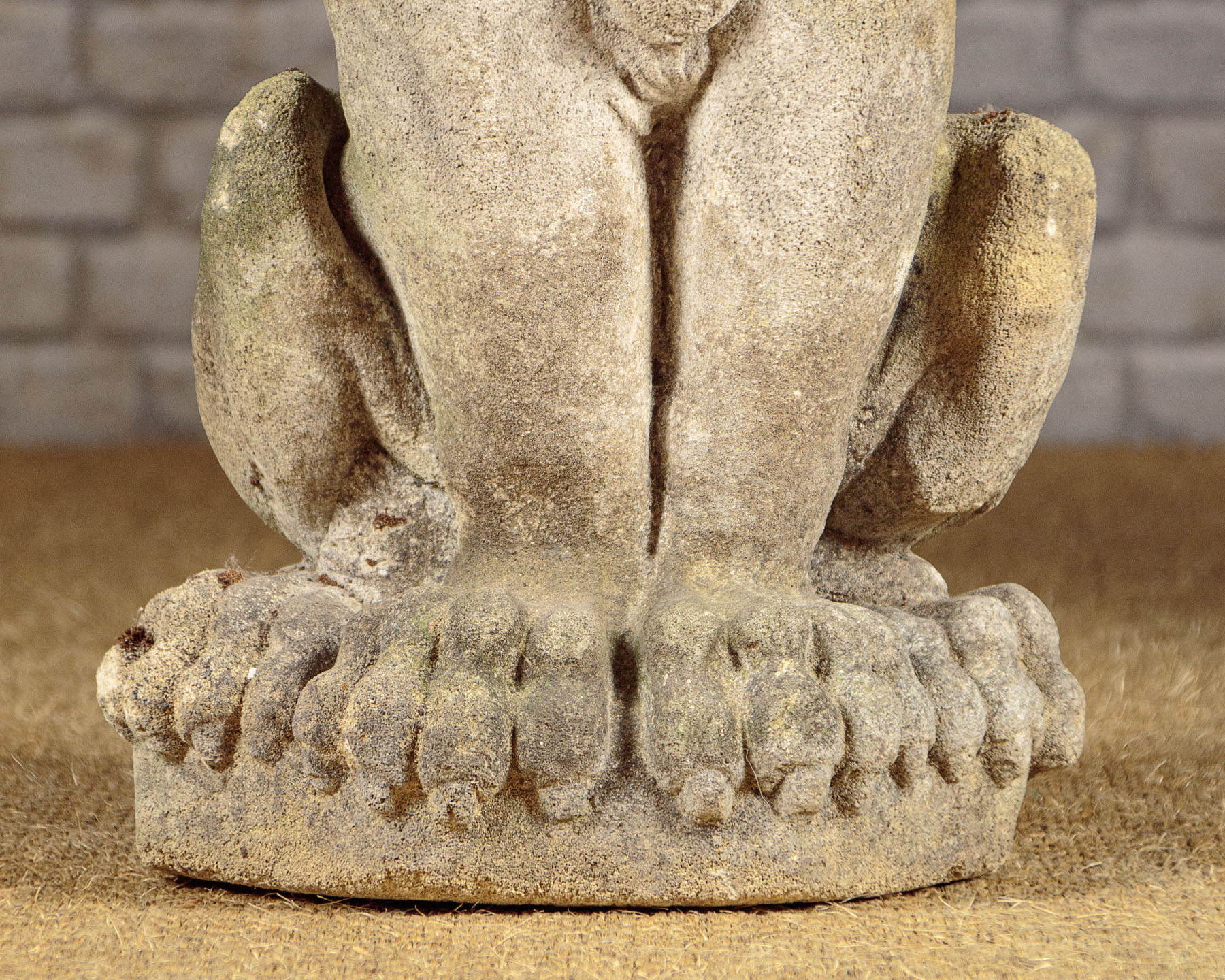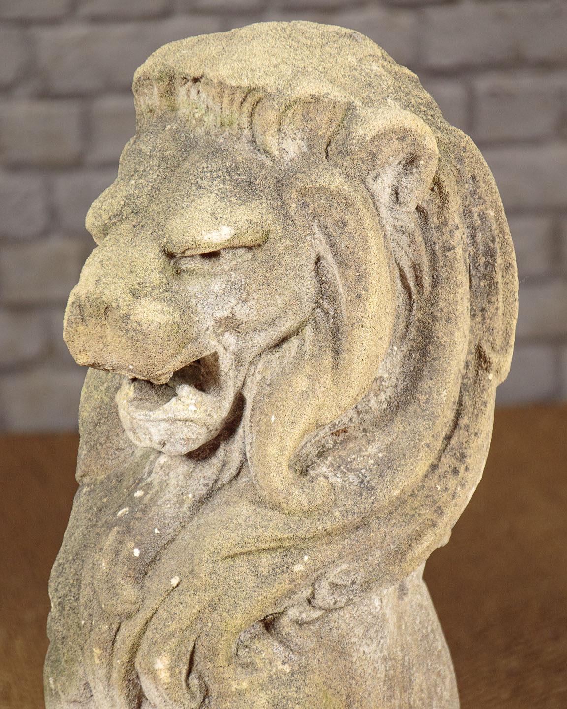 Fine pair of reconstituted stone lions c.1950. Ideal for the top of gateposts or similar garden use. In a seated pose, or sejant as it’s known in heraldry, on octagonal plinth bases. Excellent condition, nicely worn and weathered with age.