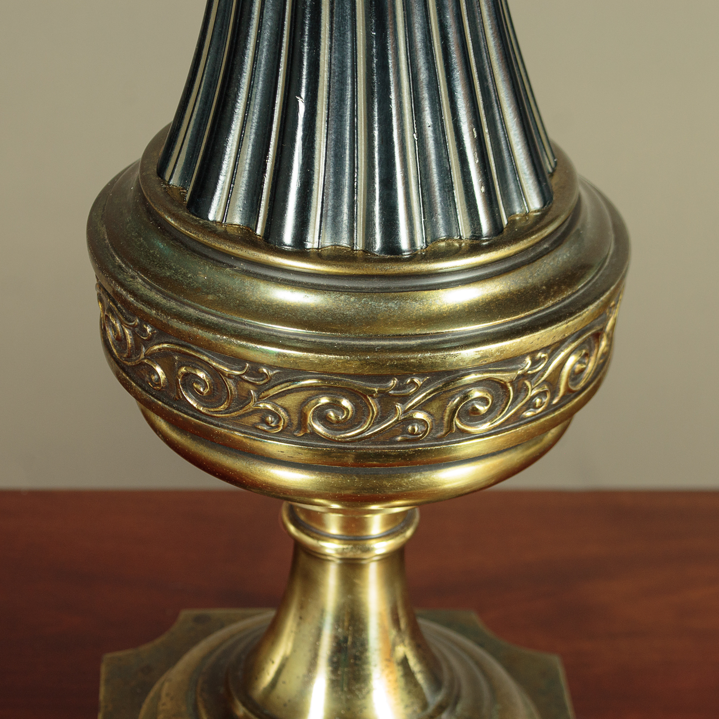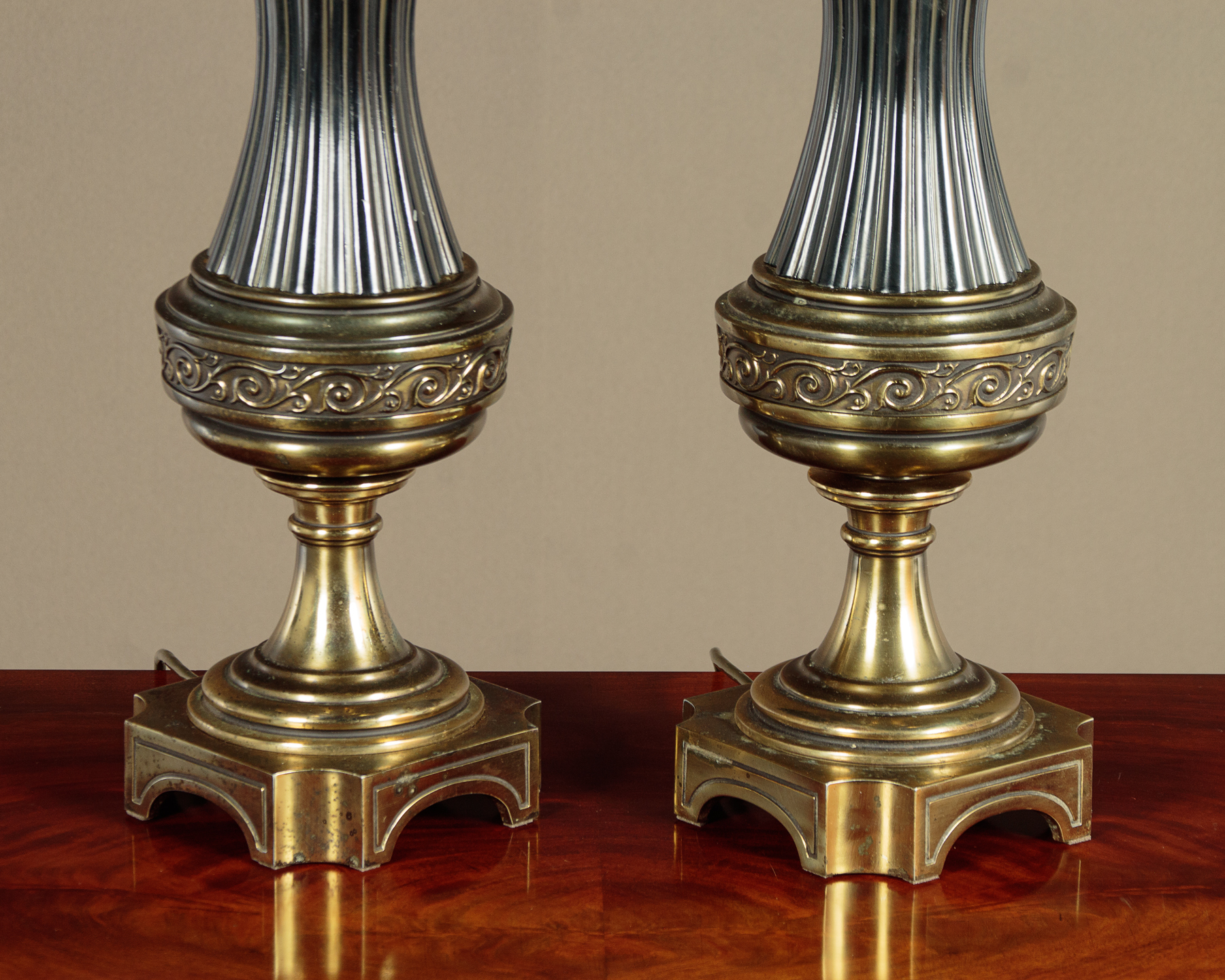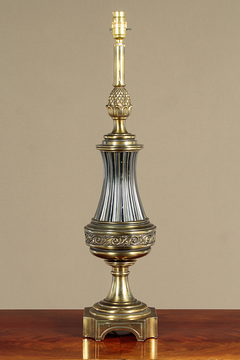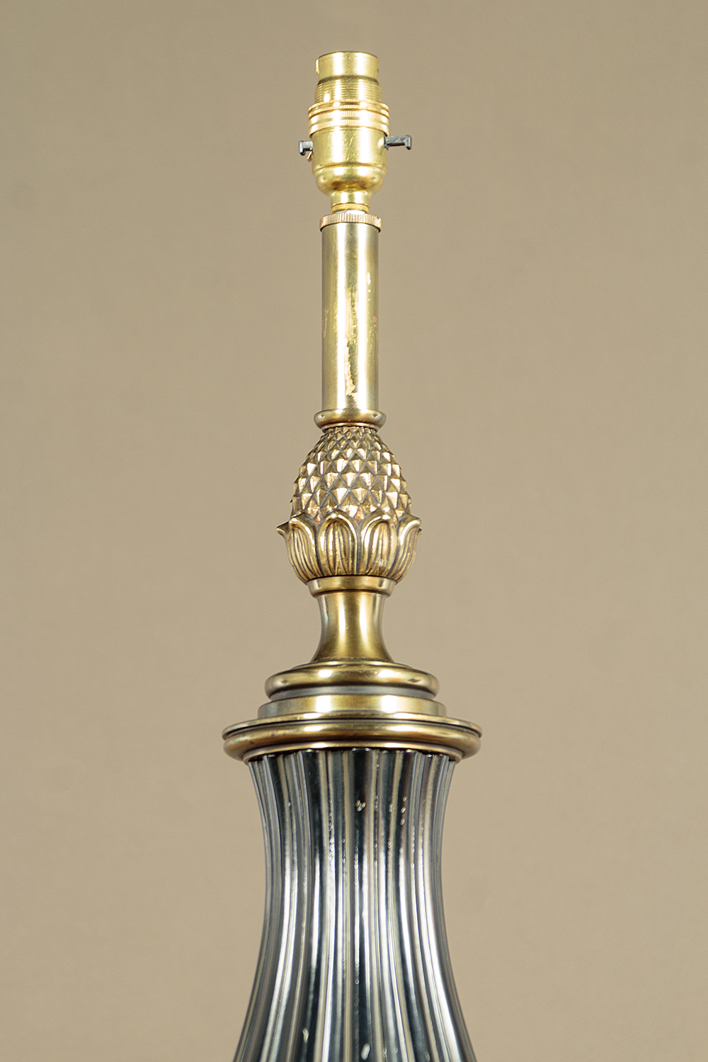 Good looking pair of tall table lamps c.1960. Brass plated baluster form bodies with pineapple tops, black reeded middles and a band of raised decoration below. Some tarnish and pitting to the finish. Otherwise good condition, cleaned rewired and PAT tested.