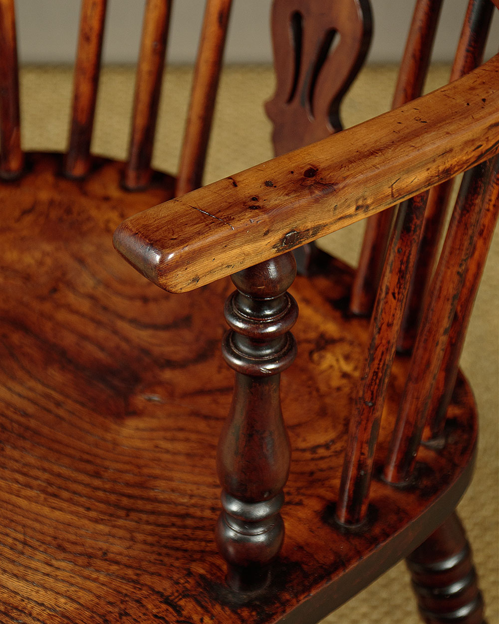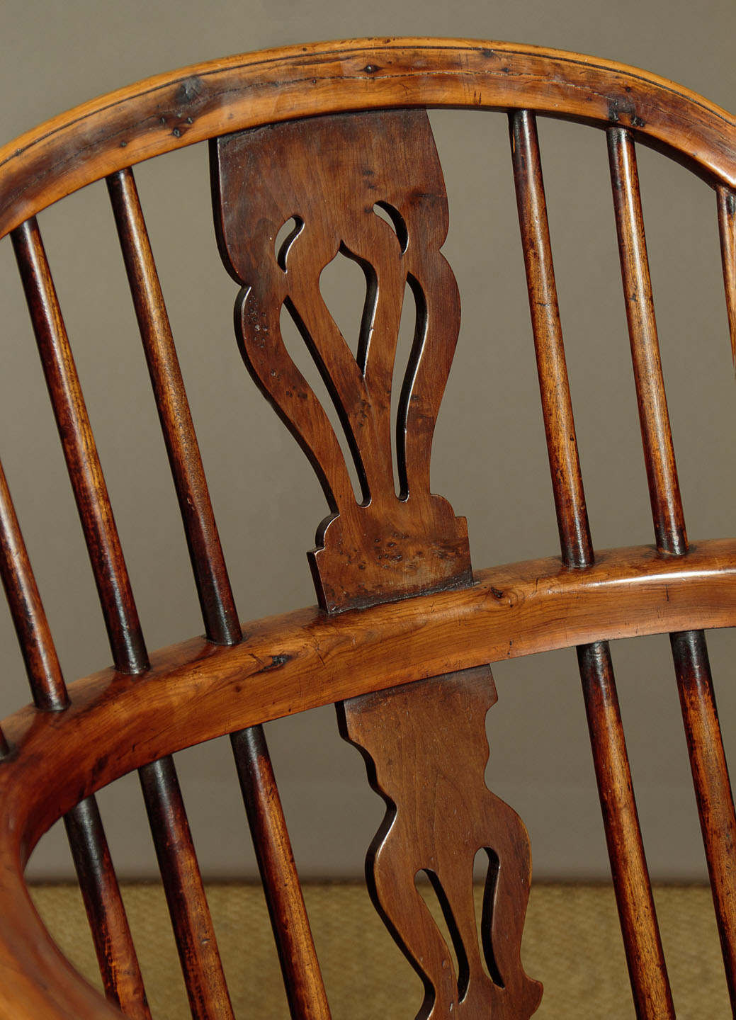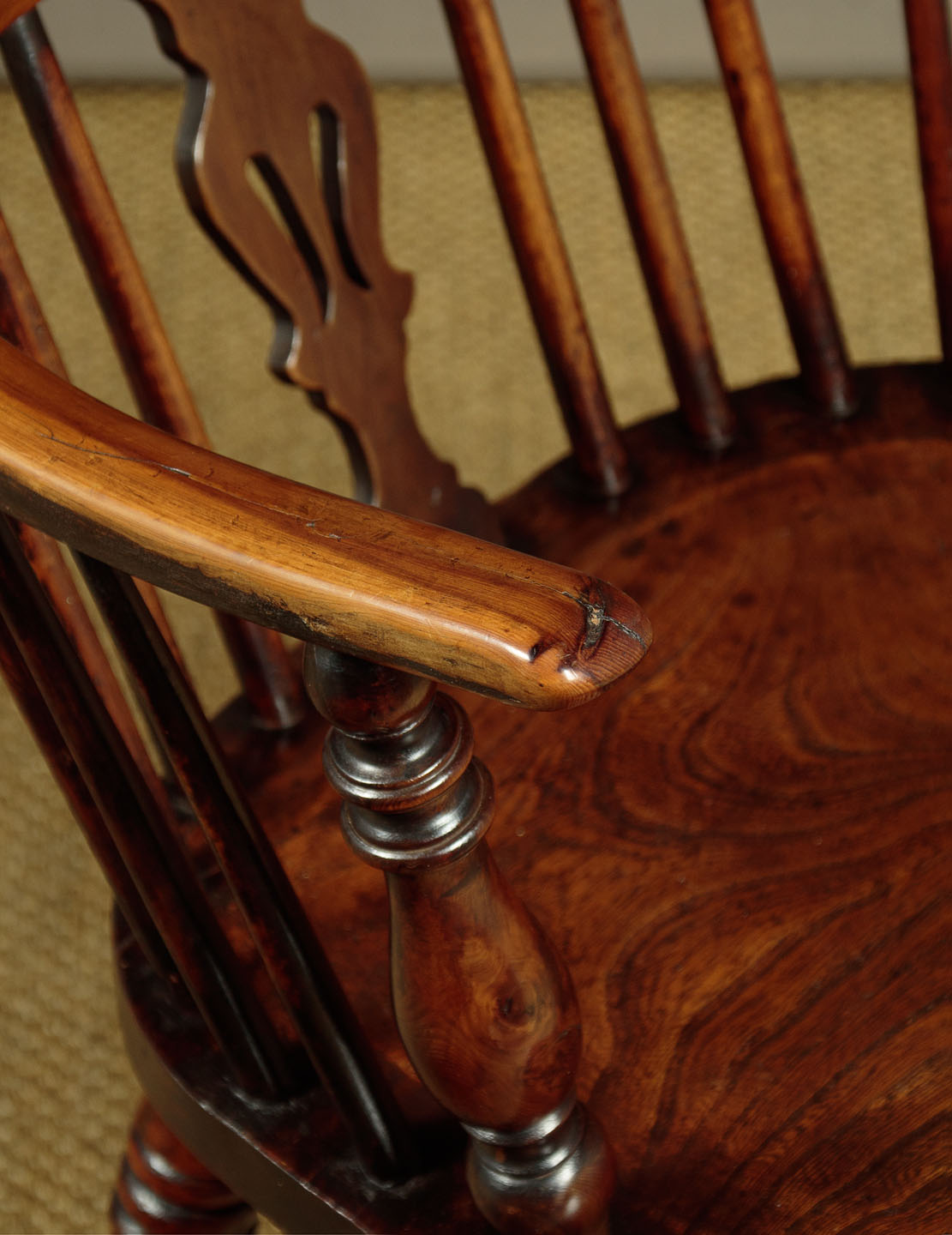 Lovely pair of mid 19th.c. yew wood and elm Windsor armchairs c.1840 .Yew wood back rests with a steamed and bent top rail and arms joined with simple stick spindles either side of an attractively shaped and pierced back splat. The arms raised on crisply turned spindles. Over single piece elm seats, nicely shaped for comfort. Raised on yew wood turned legs, slightly spayed for stability and joined with curving crinoline stretchers. A repair to the arm of one chair. Otherwise excellent colour and condition with particularly good patina. Cleaned and waxed in our workshops.