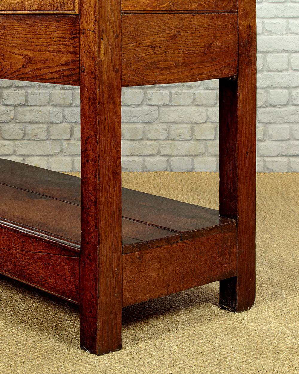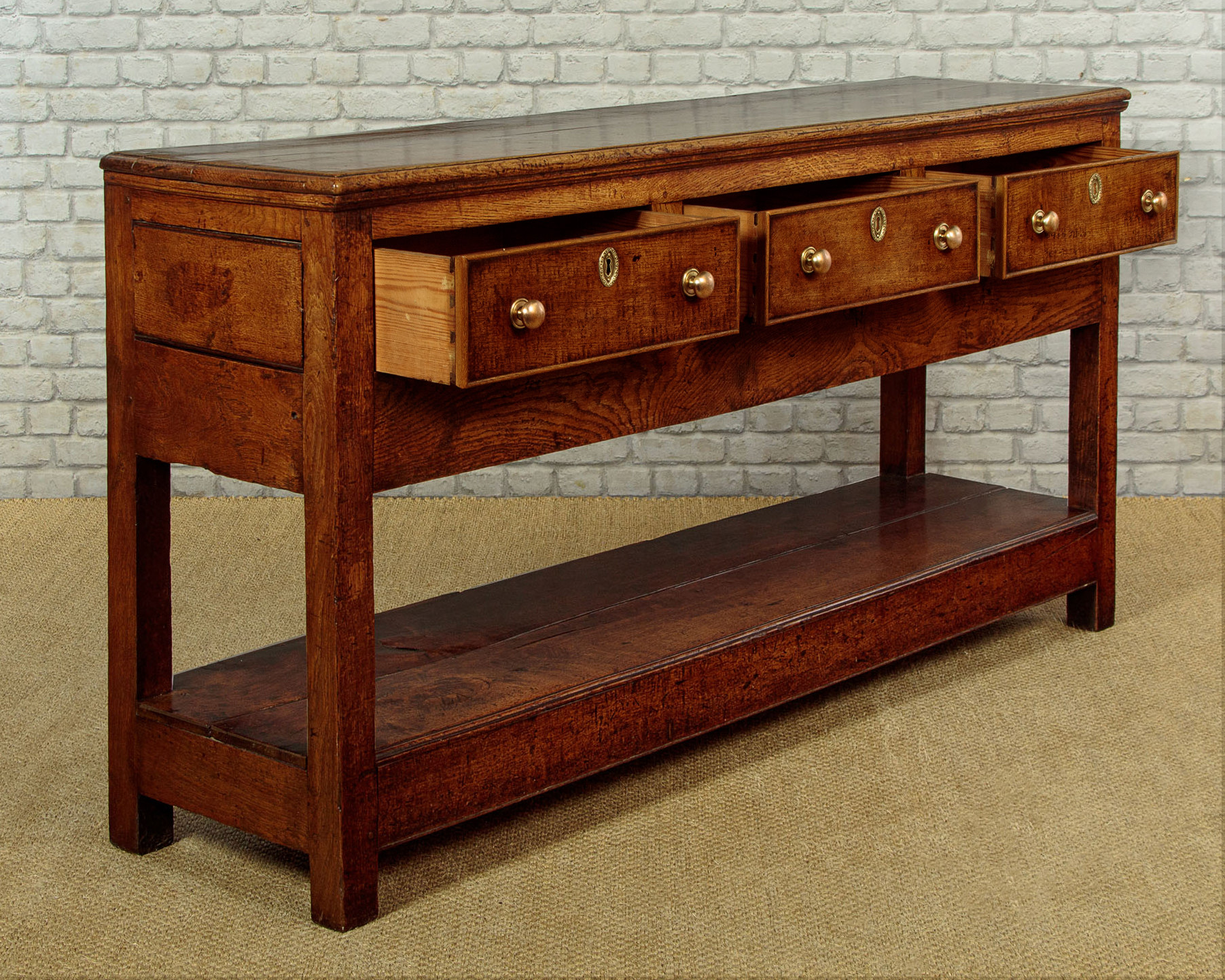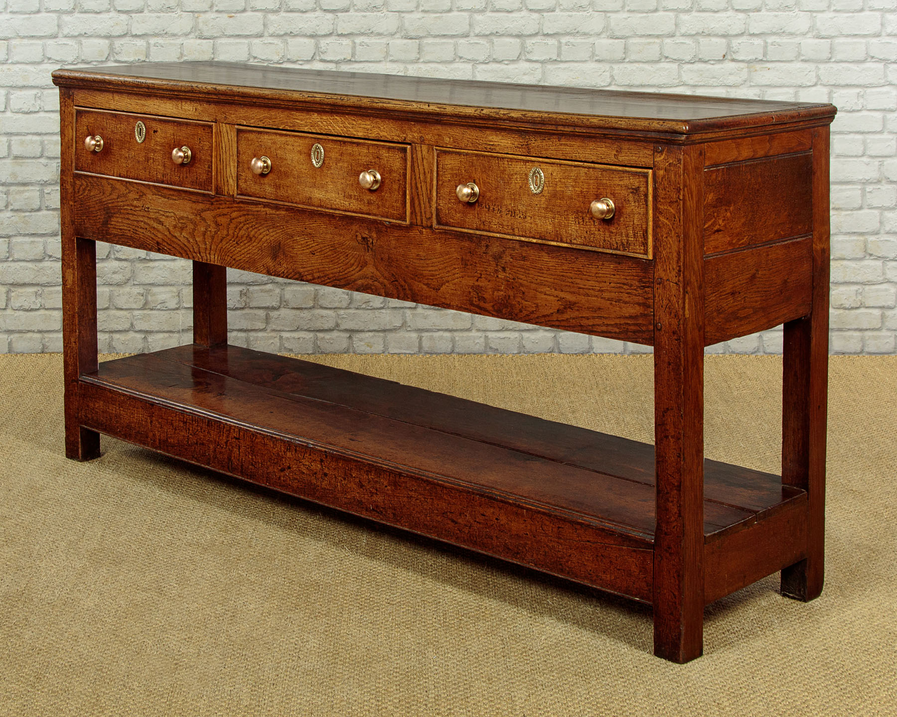 Simple little early 19th.c. Welsh oak potboard kitchen or dairy dresser base c.1810. Two plank top with a moulded edge and an applied moulding to the underside. Over three drawers with cockbeaded edges to the drawers fronts and later brass knobs. With a straight apron below the drawers and raised on sturdy square stiles front and rear, joined with an open potboard display shelf formed from two long oak boards and with unusually deep rails at the front and sides. This was a dresser designed for strength and everyday use with few if any refinements or decoration. Solid oak sides, pine drawer linings. Excellent colour and condition, cleaned and waxed in our workshops.