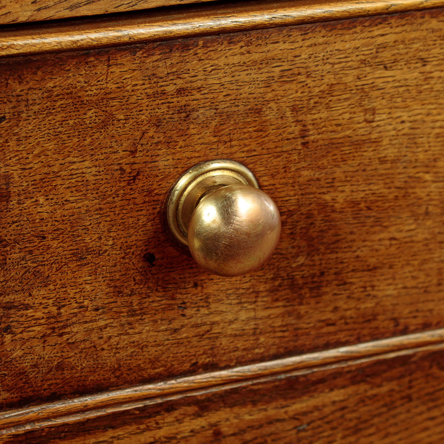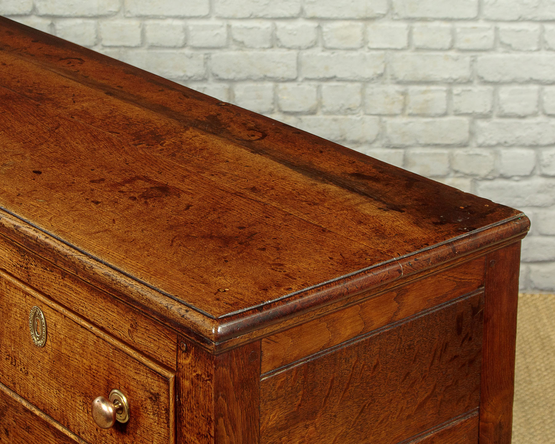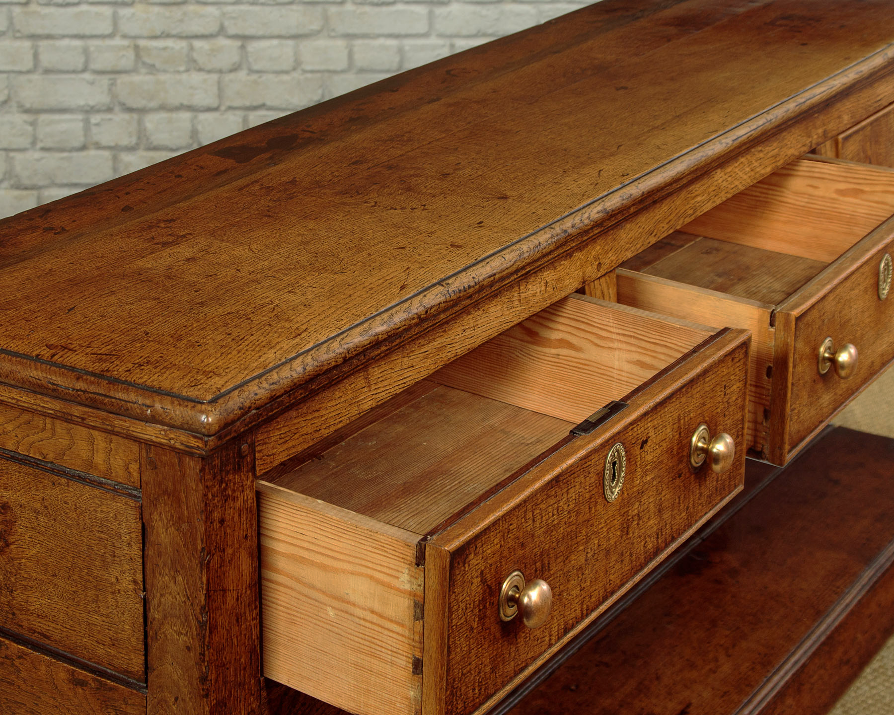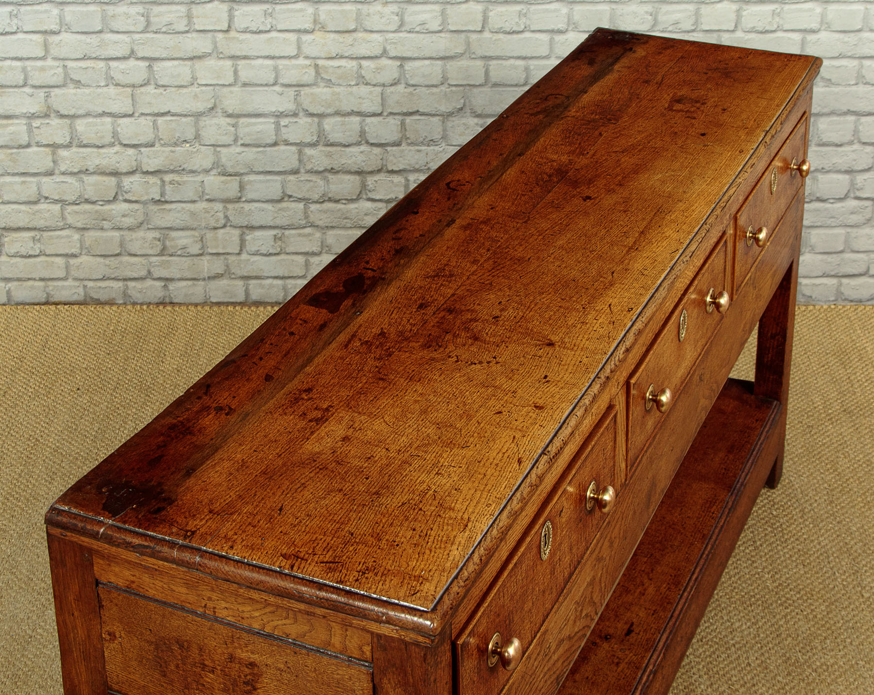 Simple little early 19th.c. Welsh oak potboard kitchen or dairy dresser base c.1810. Two plank top with a moulded edge and an applied moulding to the underside. Over three drawers with cockbeaded edges to the drawers fronts and later brass knobs. With a straight apron below the drawers and raised on sturdy square stiles front and rear, joined with an open potboard display shelf formed from two long oak boards and with unusually deep rails at the front and sides. This was a dresser designed for strength and everyday use with few if any refinements or decoration. Solid oak sides, pine drawer linings. Excellent colour and condition, cleaned and waxed in our workshops.