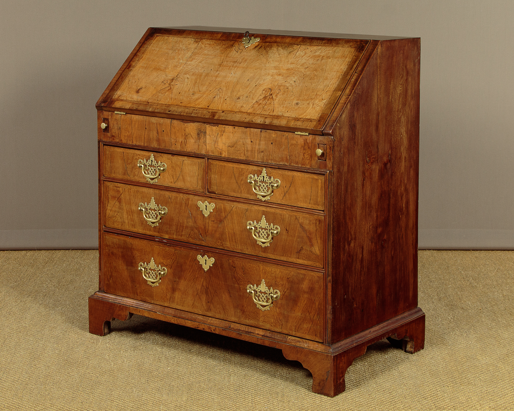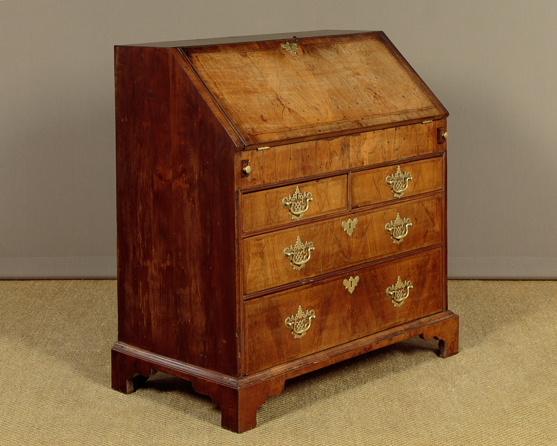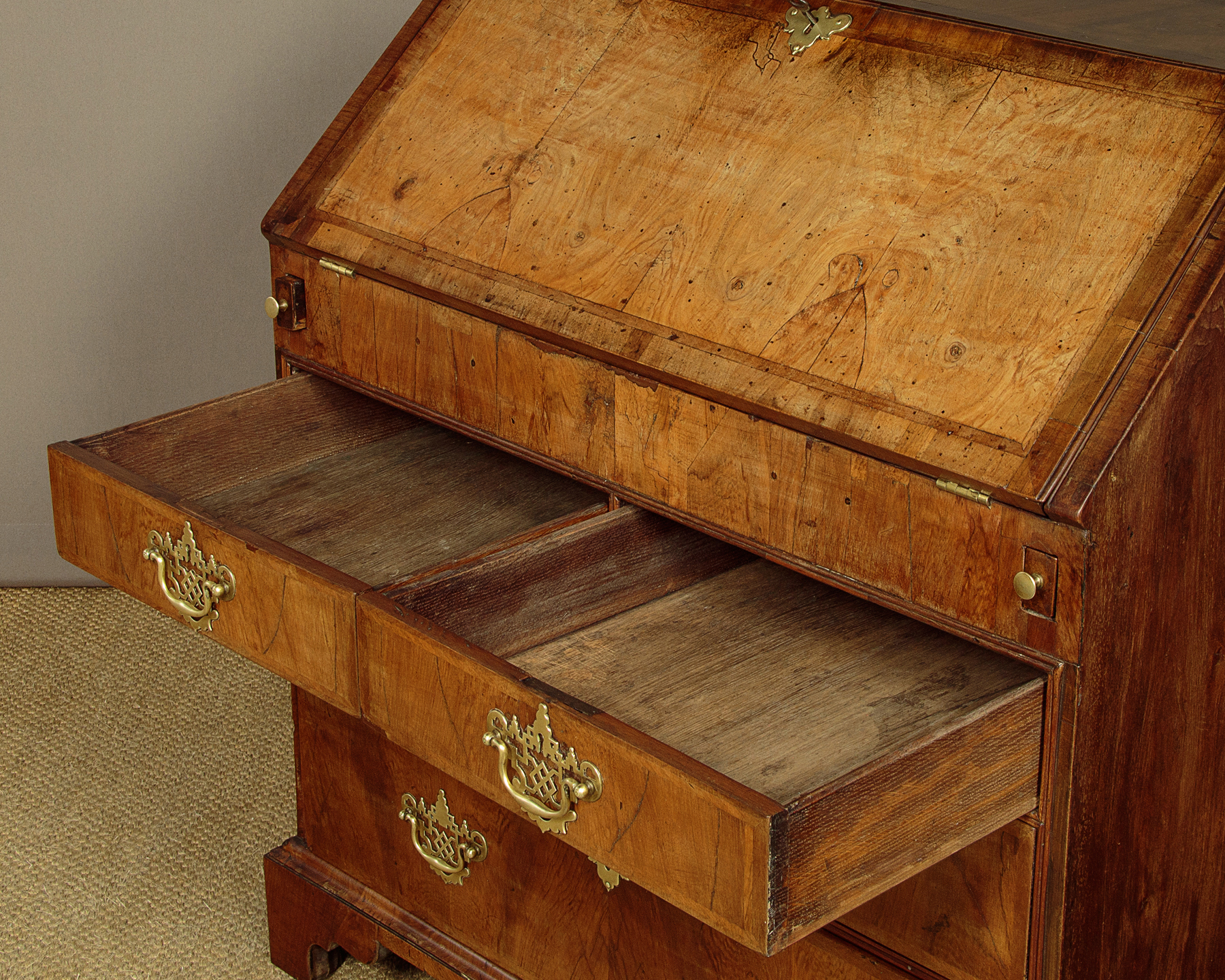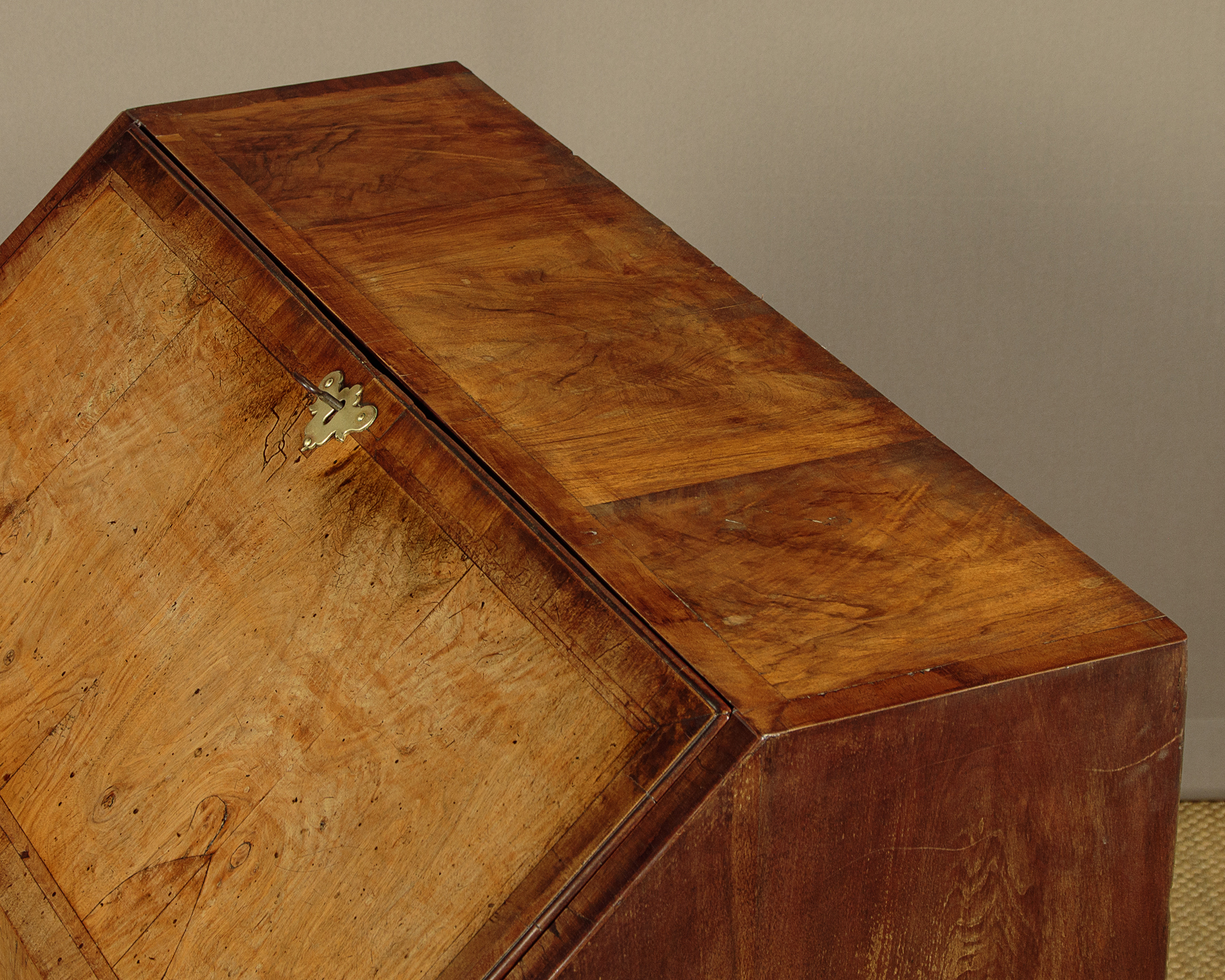 Early 18th.c. Queen Anne period walnut bureau c.1710. Very well figured English walnut veneered exterior with inlaid feather or herringbone banding to the fall and drawer fronts. Open the fall to reveal a fitted interior of pigeon holes and small drawers around a lockable central compartment. Desk height 29". With access to the well below through a sliding panel in the base of the desk interior. With two short and two long drawers of graduated depth below the desk. Oak drawer linings, note the grain of the drawer bases running front to back, the thin drawer sides with rounded top edge and the lack of cockbeading to the drawer fronts; all indicative of very early 18th.c. cabinet making. Later Georgian pattern brass handles. With a good deep ogee moulding around the base and shaped bracket feet. Some previous repairs and restorations and noticeably faded colour to the fall. Generally good condition, restored cleaned and waxed in our workshops. Key supplied.
