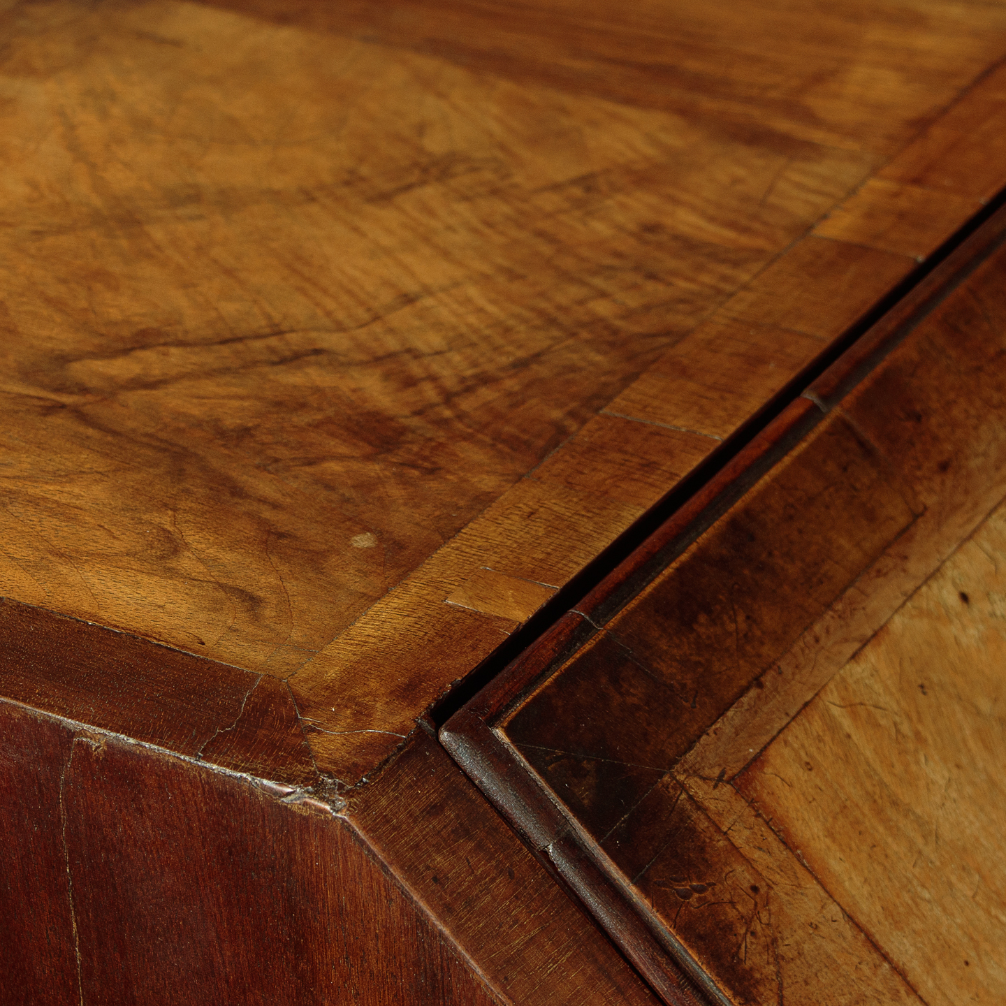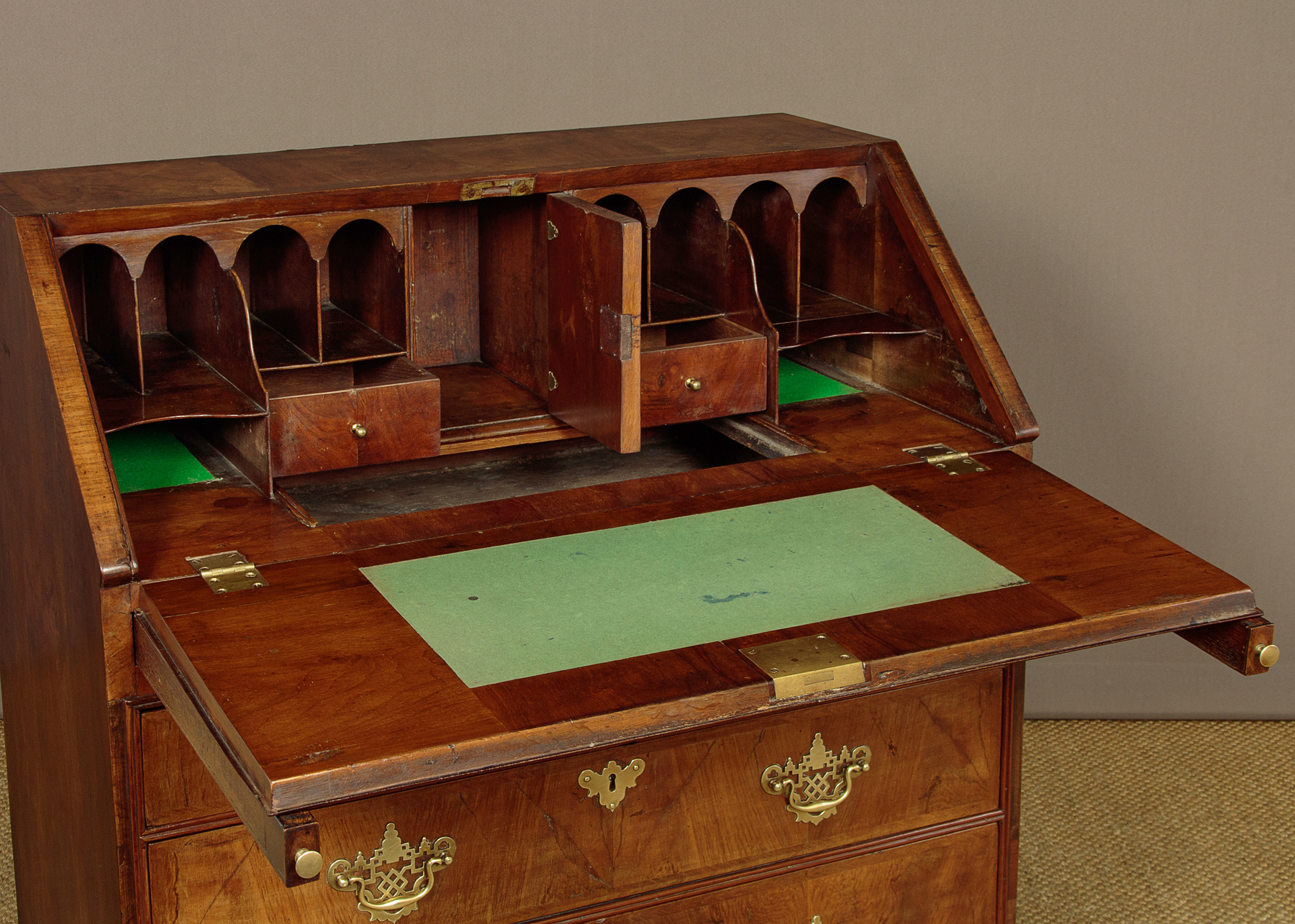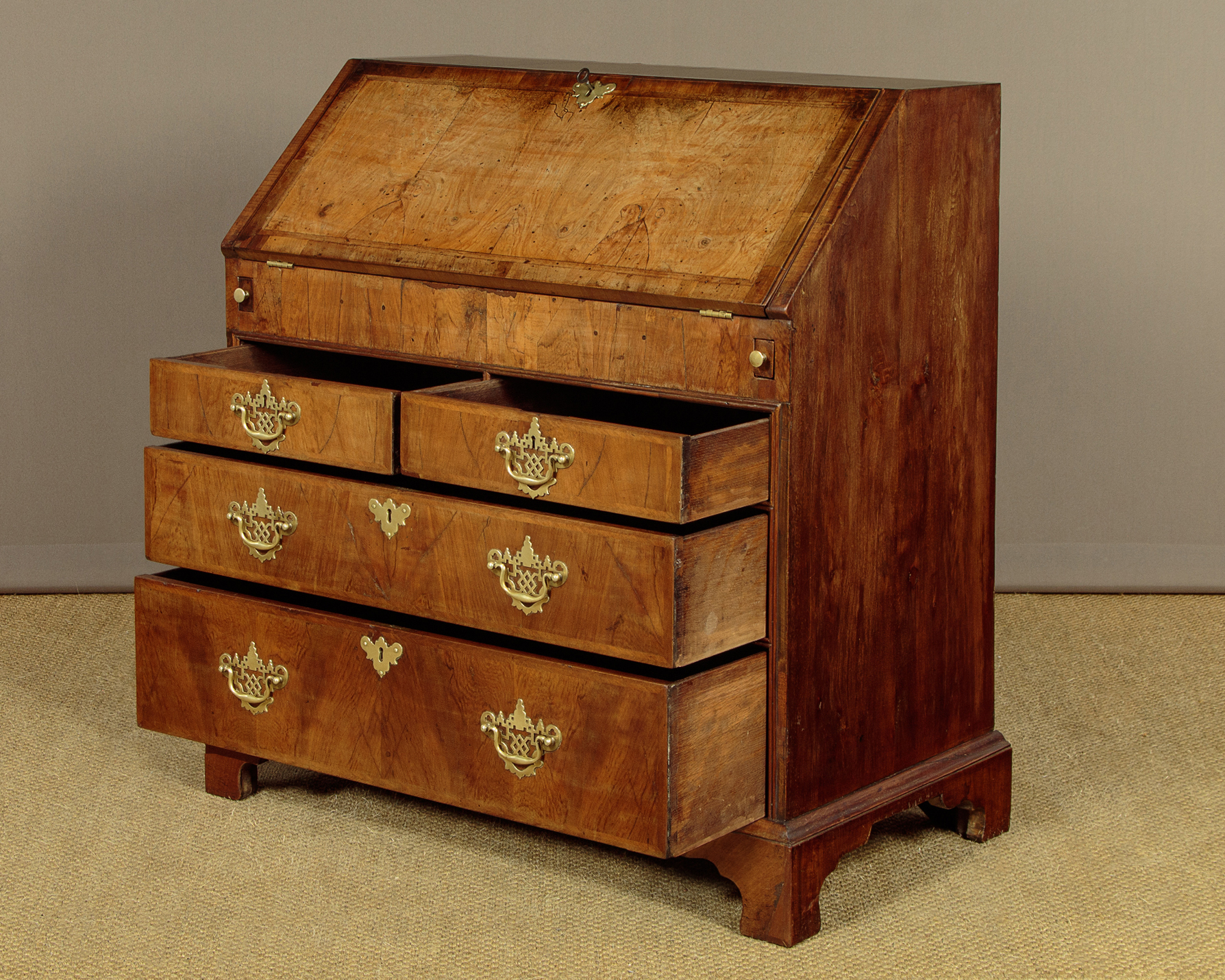Early 18th.c. Queen Anne period walnut bureau c.1710. Very well figured English walnut veneered exterior with inlaid feather or herringbone banding to the fall and drawer fronts. Open the fall to reveal a fitted interior of pigeon holes and small drawers around a lockable central compartment. Desk height 29". With access to the well below through a sliding panel in the base of the desk interior. With two short and two long drawers of graduated depth below the desk. Oak drawer linings, note the grain of the drawer bases running front to back, the thin drawer sides with rounded top edge and the lack of cockbeading to the drawer fronts; all indicative of very early 18th.c. cabinet making. Later Georgian pattern brass handles. With a good deep ogee moulding around the base and shaped bracket feet. Some previous repairs and restorations and noticeably faded colour to the fall. Generally good condition, restored cleaned and waxed in our workshops. Key supplied.