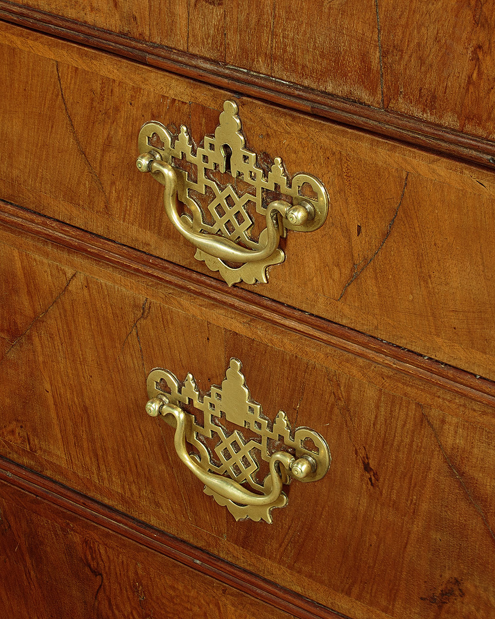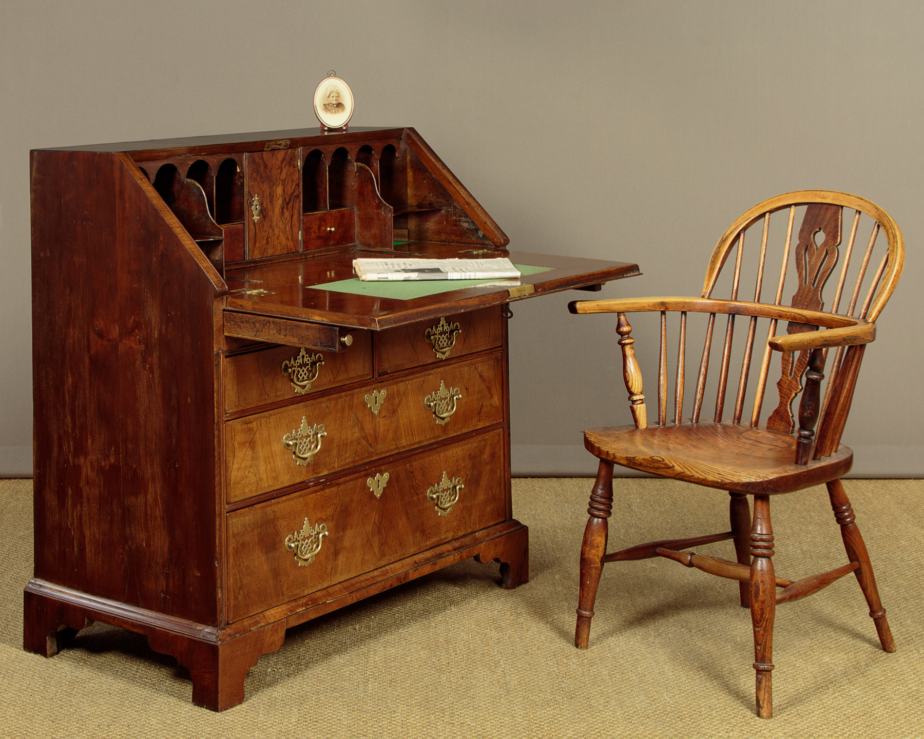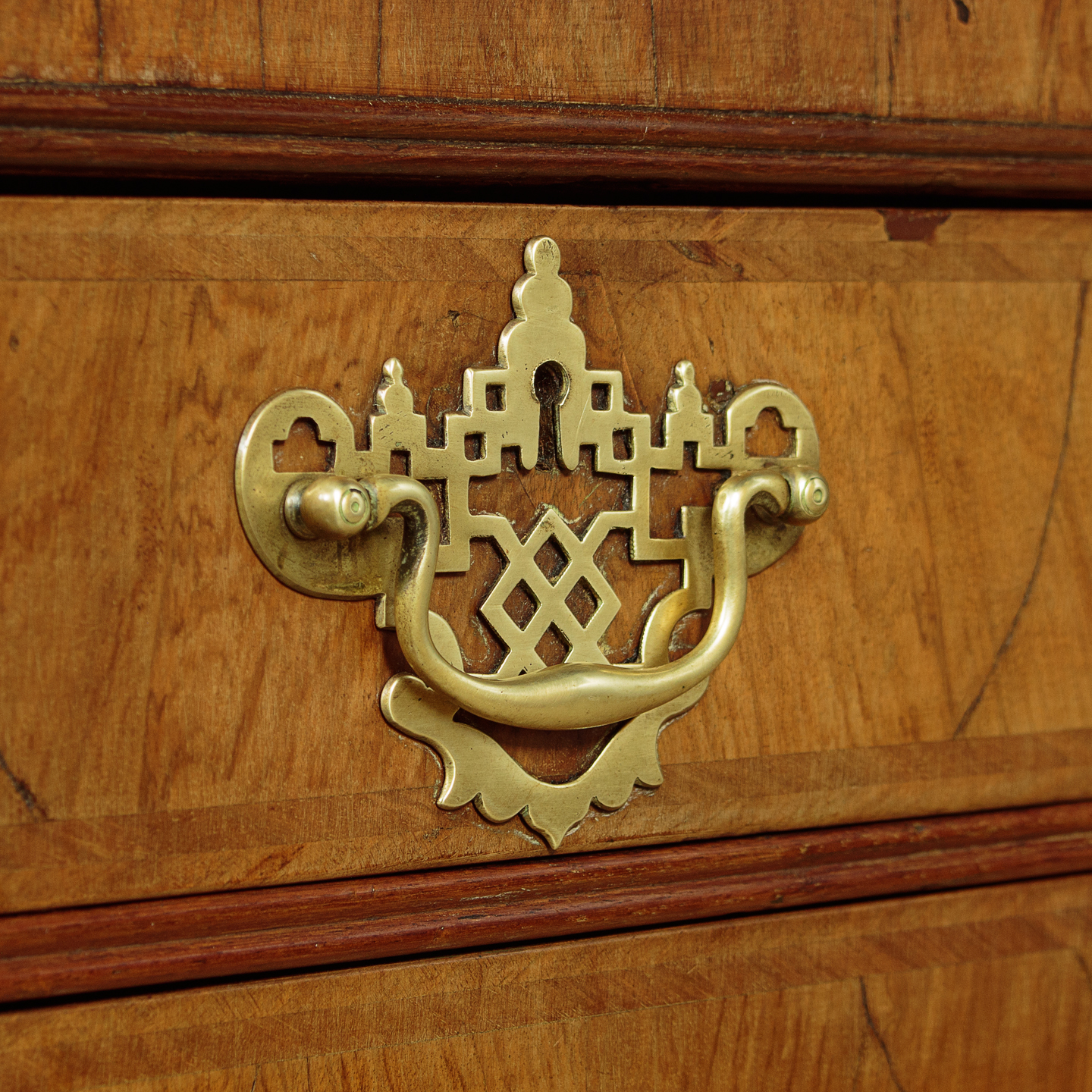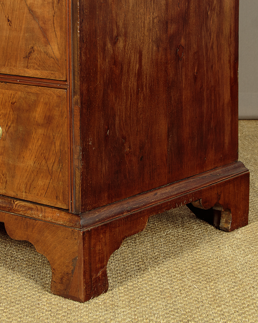 Early 18th.c. Queen Anne period walnut bureau c.1710. Very well figured English walnut veneered exterior with inlaid feather or herringbone banding to the fall and drawer fronts. Open the fall to reveal a fitted interior of pigeon holes and small drawers around a lockable central compartment. Desk height 29". With access to the well below through a sliding panel in the base of the desk interior. With two short and two long drawers of graduated depth below the desk. Oak drawer linings, note the grain of the drawer bases running front to back, the thin drawer sides with rounded top edge and the lack of cockbeading to the drawer fronts; all indicative of very early 18th.c. cabinet making. Later Georgian pattern brass handles. With a good deep ogee moulding around the base and shaped bracket feet. Some previous repairs and restorations and noticeably faded colour to the fall. Generally good condition, restored cleaned and waxed in our workshops. Key supplied.