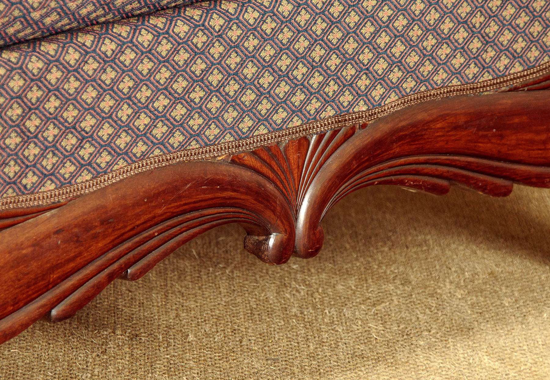 Regency era mahogany daybed or window seat c.1820. Loose feather filled cushion to the seat between raised and padded ends, all freshly reupholstered in a patterned chenille. Attractively shaped and moulded mahogany fronts to the ends and apron accentuating the curving lines of the couch. Raised on short splayed feet, also moulded to match. Excellent condition, cleaned and waxed in our workshops.