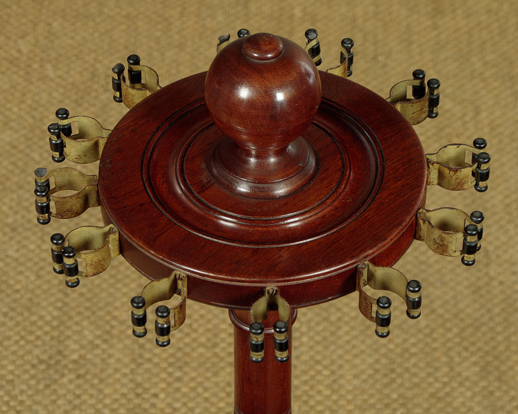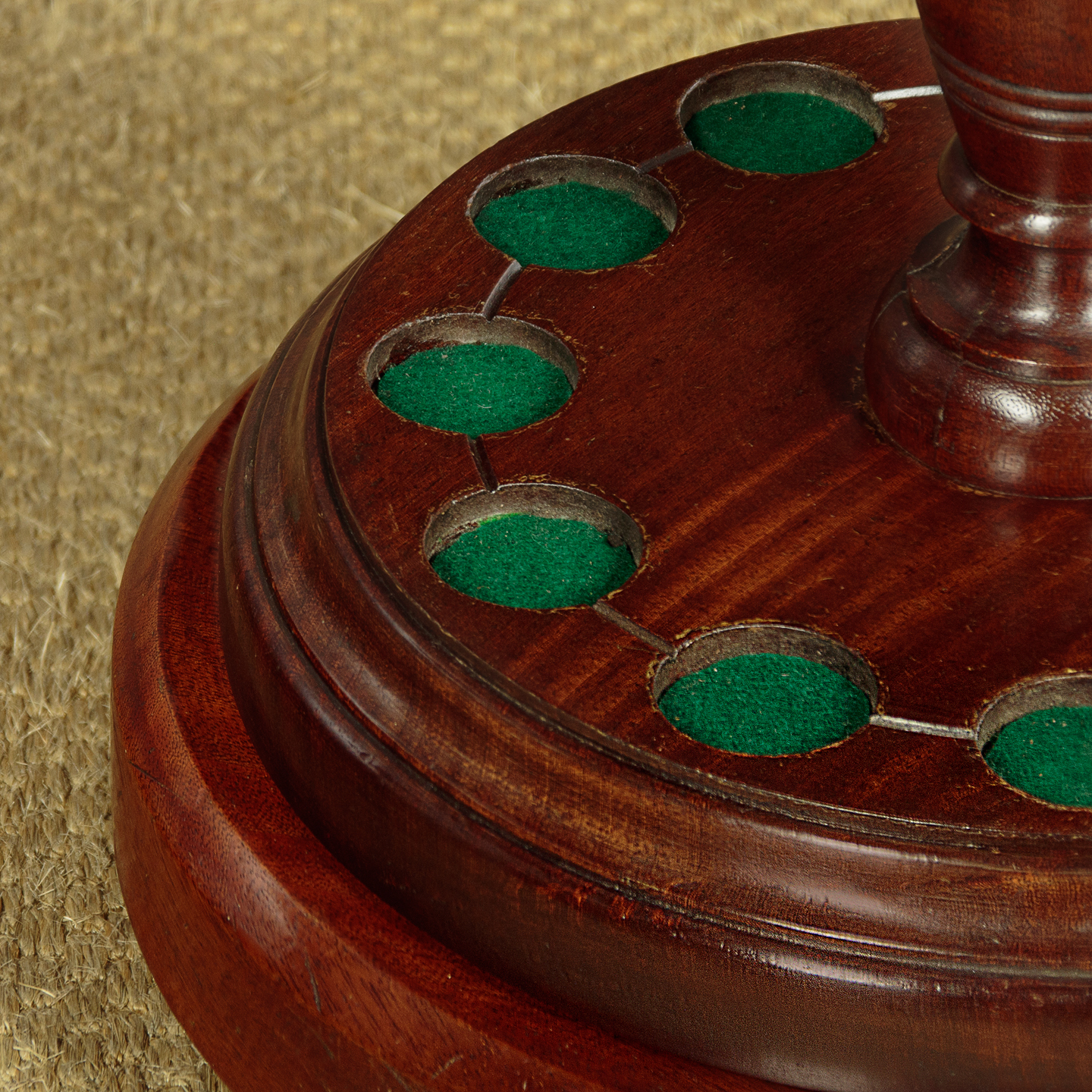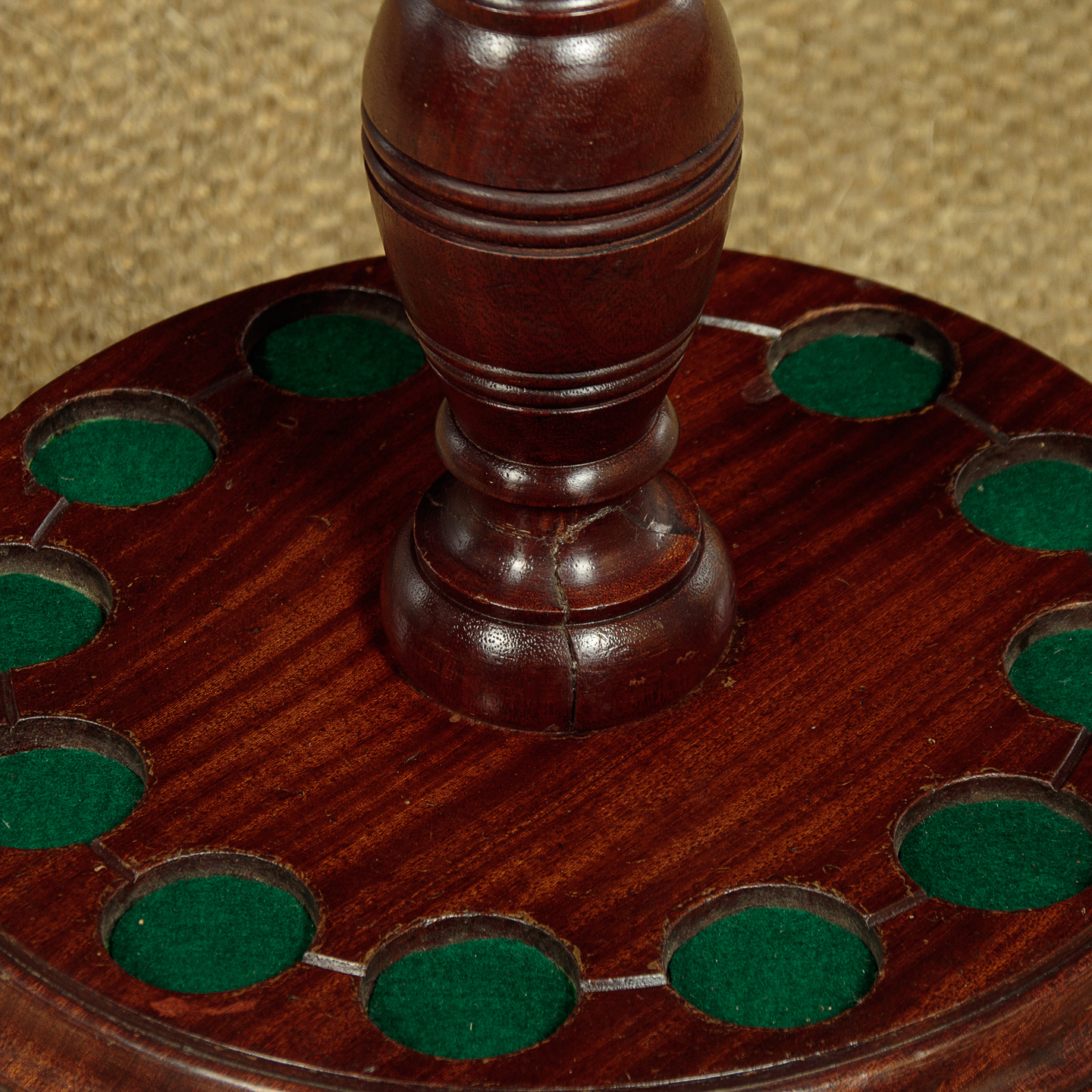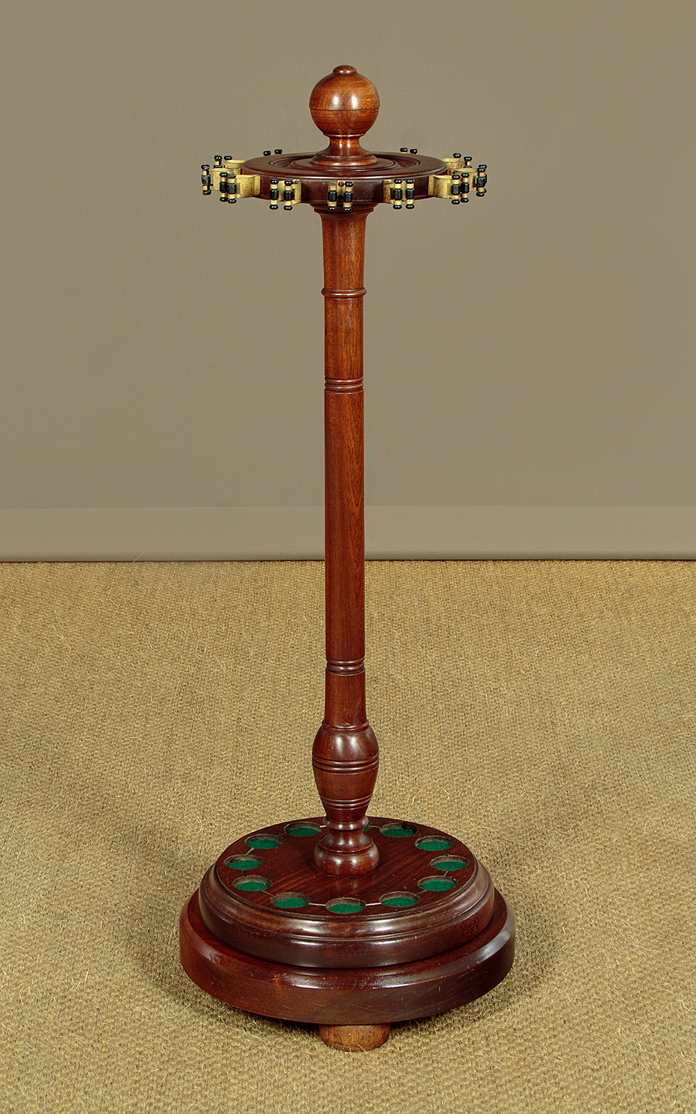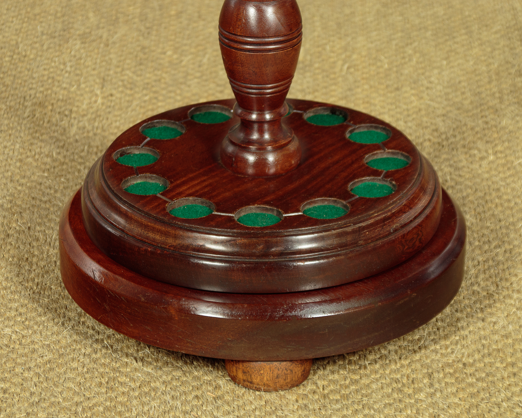 Edwardian style turned mahogany cue stand c.1960. 8" diameter top with 12 metal fittings for pool or snooker cues. With a large turned pommel at the centre and raised on a turned column over the larger base with baize lined recesses for the cues. Revolving on the heavy turned mahogany base raised on three bun feet. Old damage at the base of the column. Otherwise good colour and condition, cleaned and waxed in our workshops.