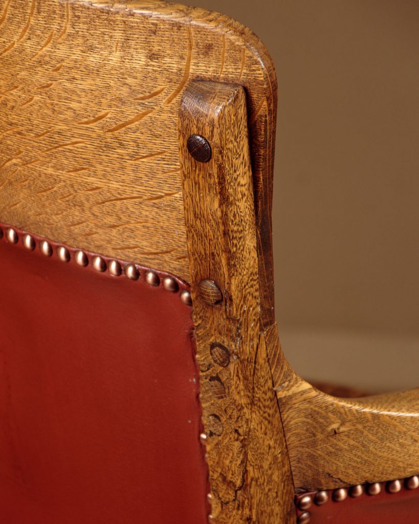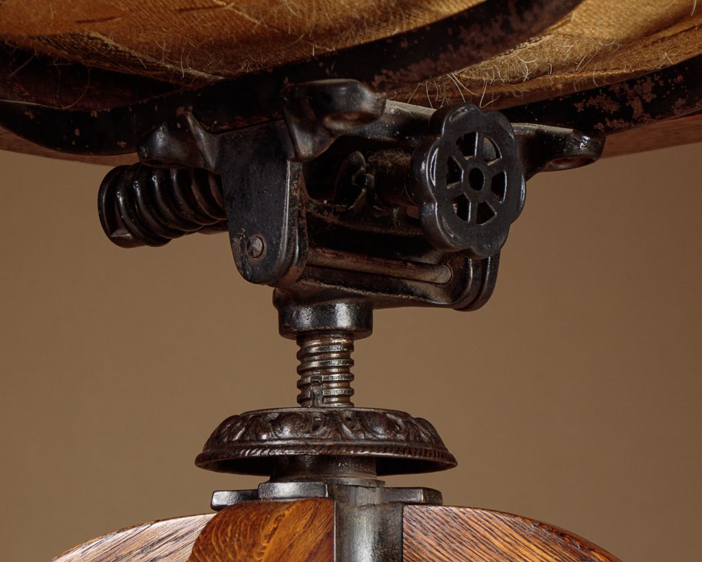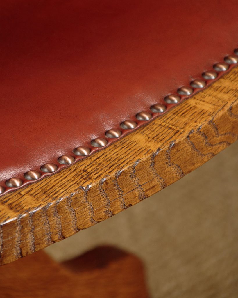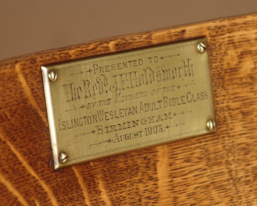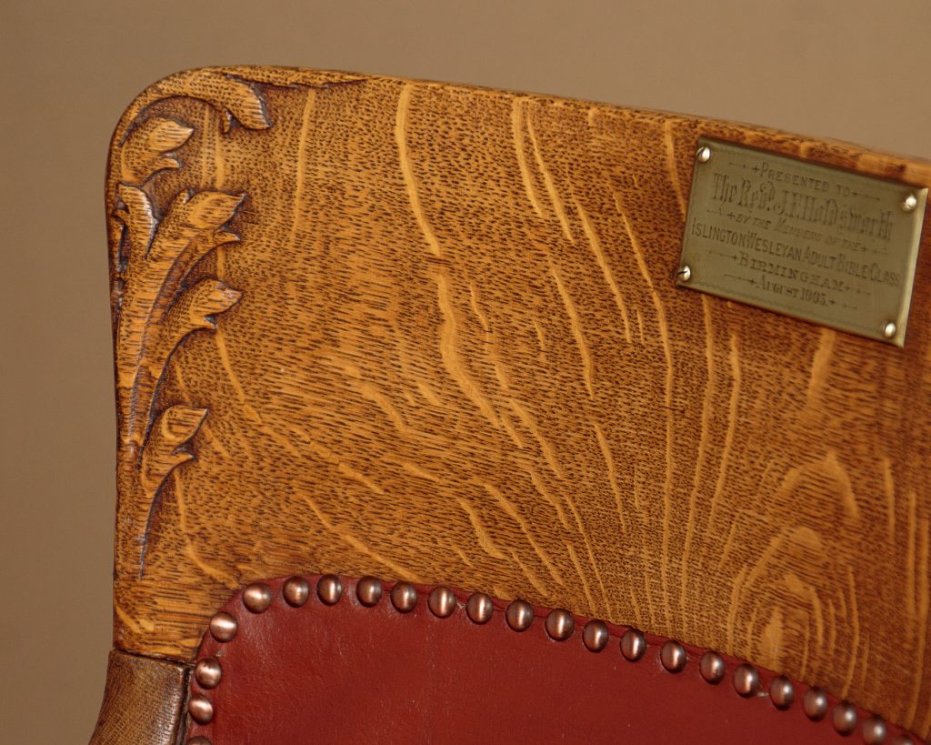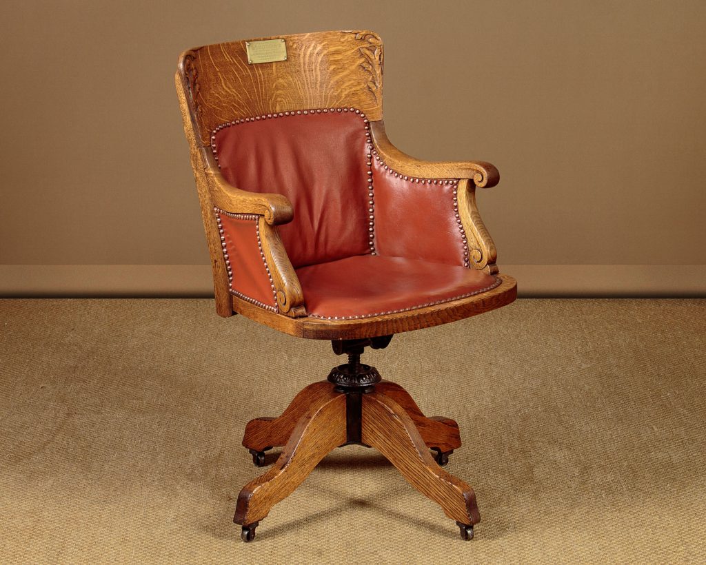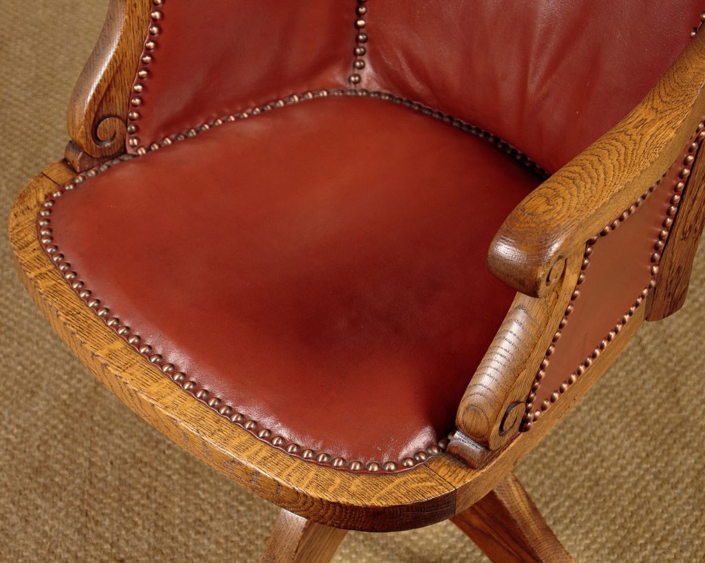 Splendid Edwardian oak office desk chair c.1905. Oak frame with attractive carved acanthus detail to the backrest and shaped arms with scrolling terminals. Tan leather upholstery to the back, sides and seat, with copper studs. Revolves, reclines and is height adjustable on a quality metal mechanism and shaped oak legs with metal castors below. Original brass presentation plaque to the backrest to the Rev. J.F Holdsworth from the members of the Islington Wesleyan Adult Bible Class of Birmingham, dated 1905. With a sturdy repair to the backrest, otherwise very good condition. Cleaned and waxed in our workshops.
