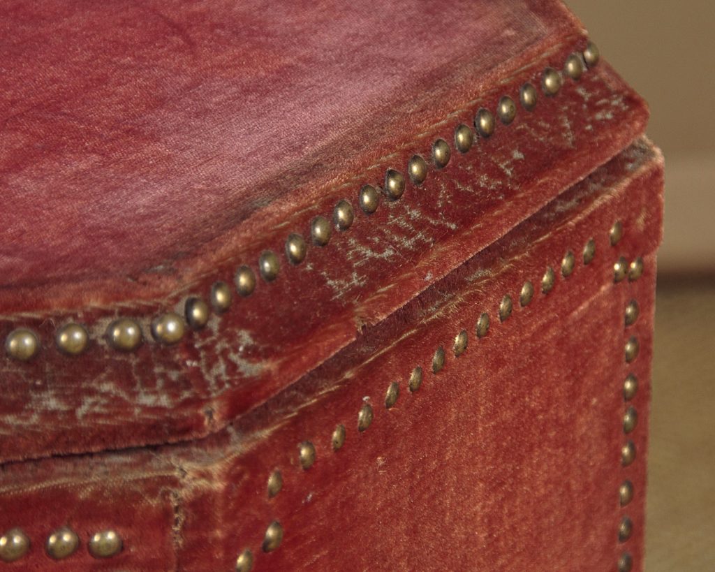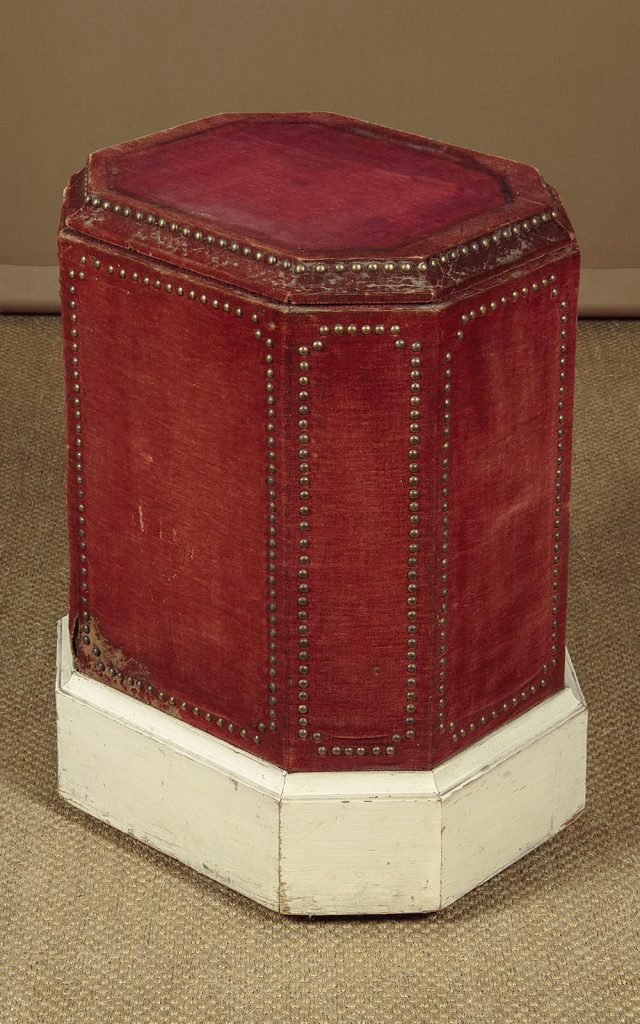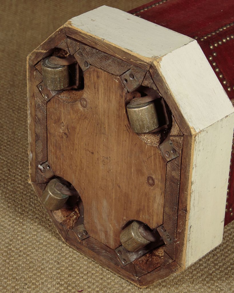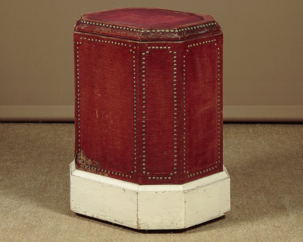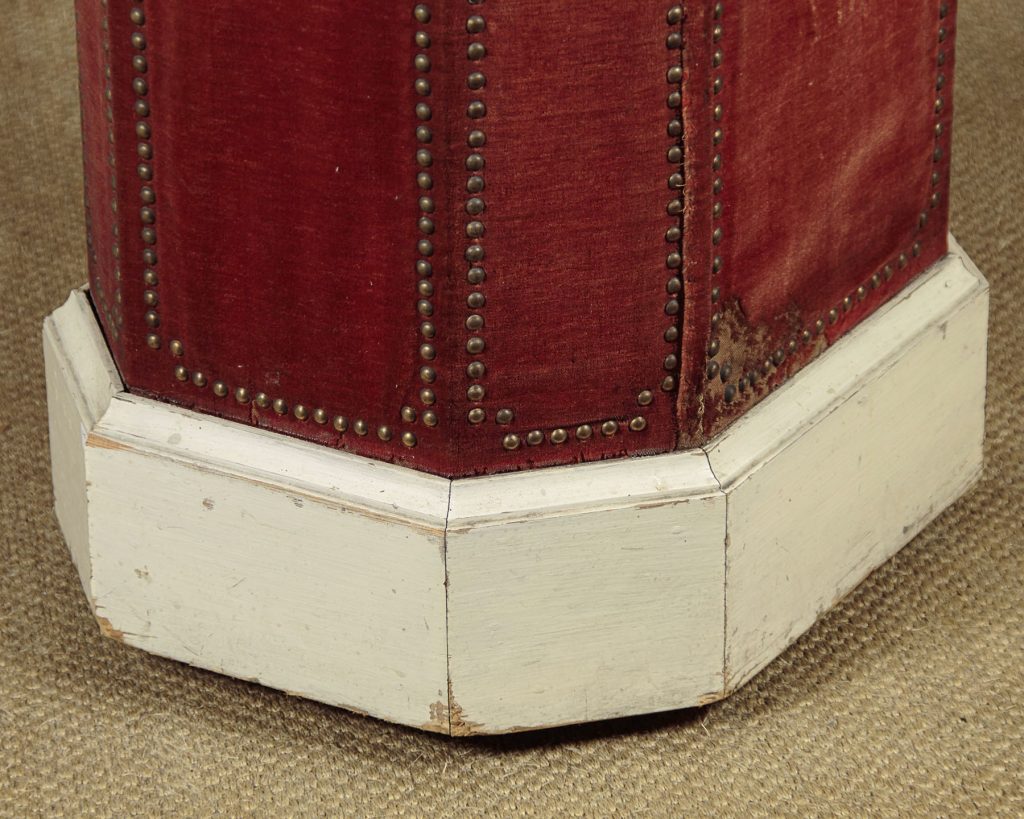 Very unusual plinth or pedestal designed to take a large piece of sculpture c.1900. Wooden pedestal retaining the original red velvet covering with brass studs and a white painted skirting around the base. 17" x 13½" top with a moulded edge revolving on heavy brass barrel castors on a metal frame. The plinth itself is also raised on a matching but even larger set of castors recessed into the base. Presented as found, solid and sturdy with obvious wear to the velvet.
