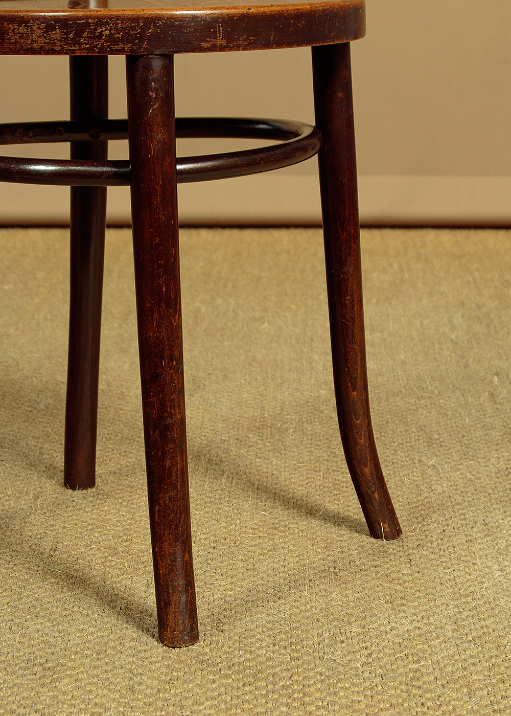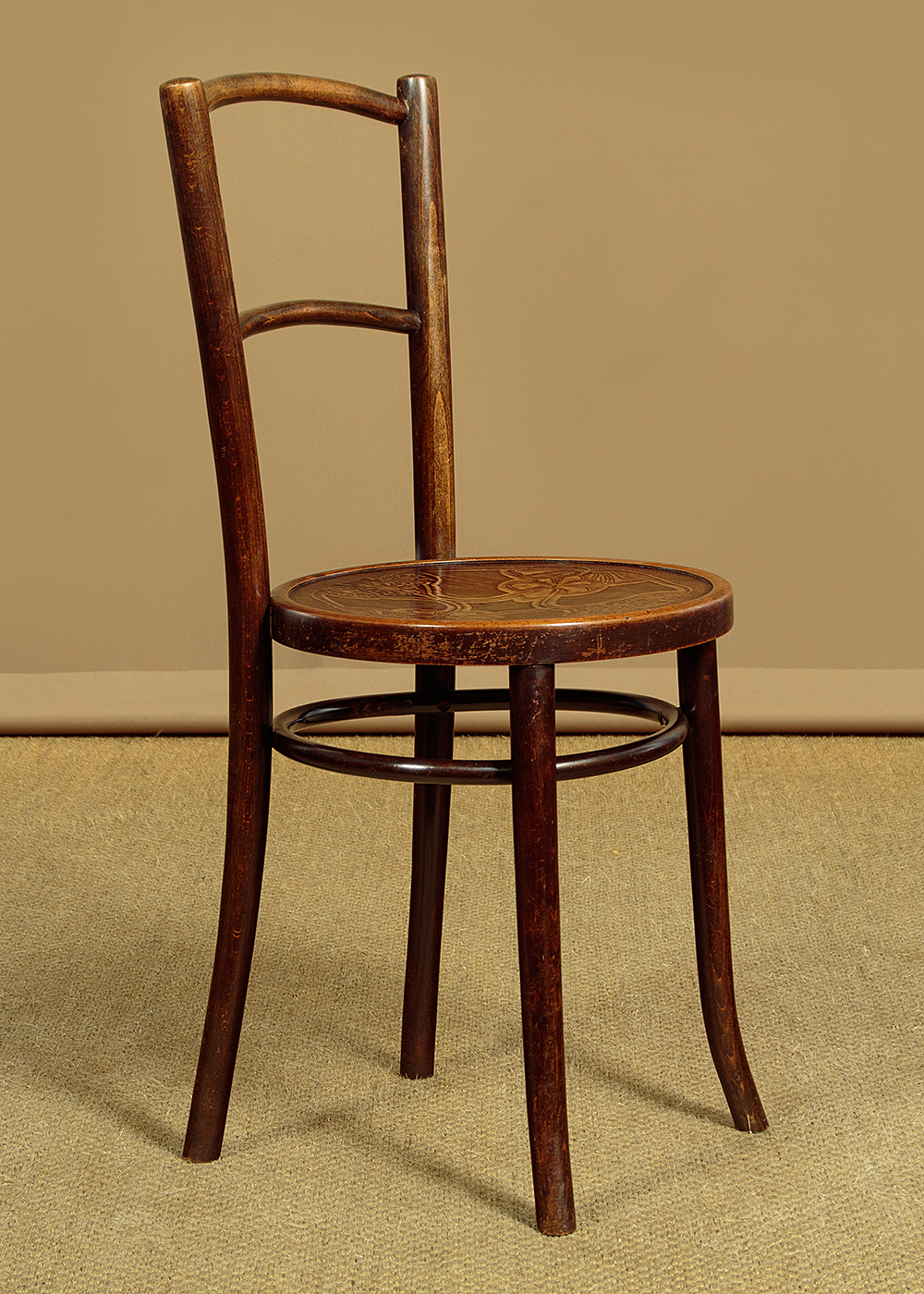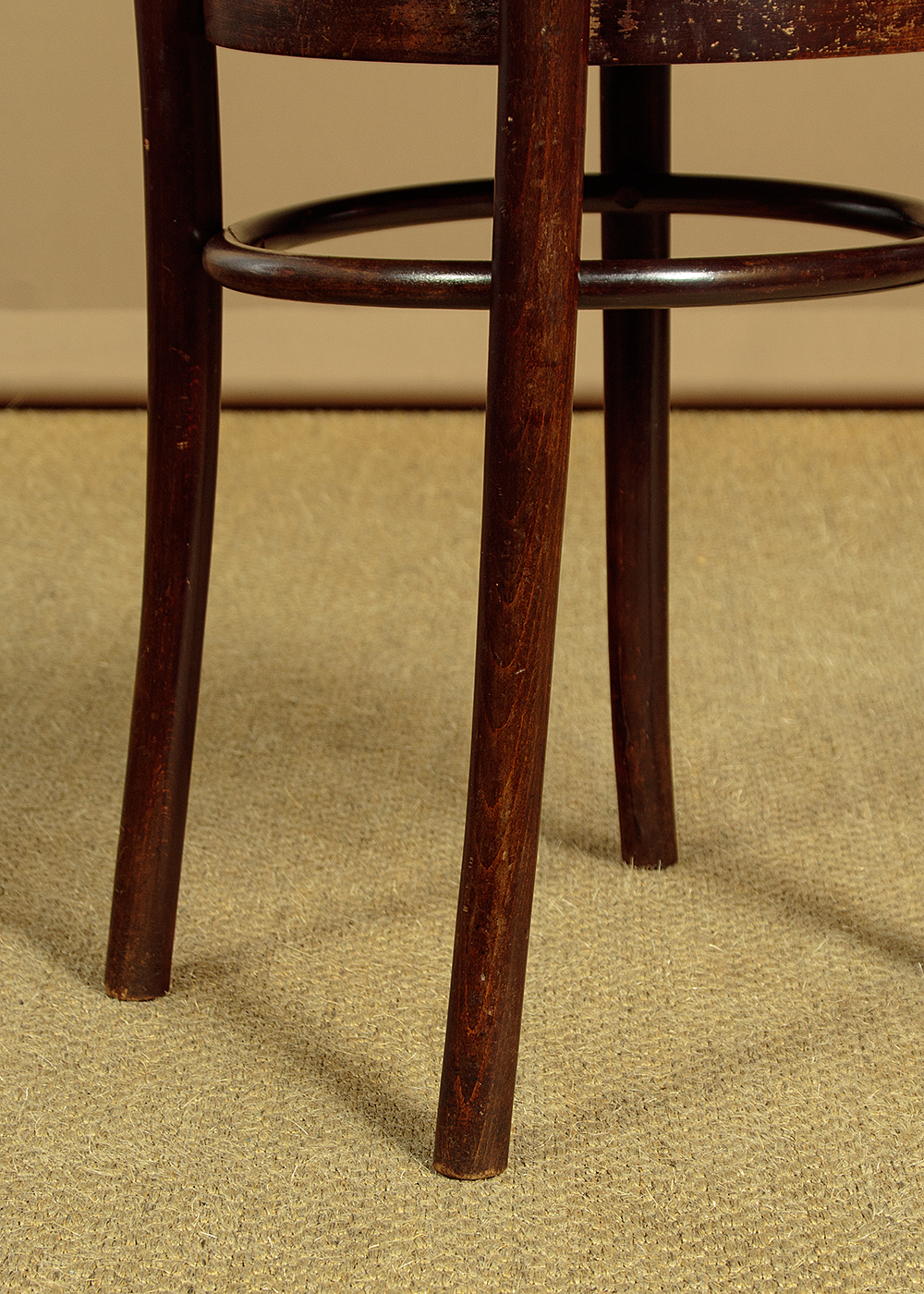Good set of four Thonet style bentwood bistro dining chairs c.1900. Bentwood frames with curved top rails and back stretchers between splayed rear stiles. Over 15" diameter seats with particularly attractive Art Nouveau style impressed decoration of flower heads. Legs slightly curved outwards at the foot for stability and joined with hoop stretchers. Very good original condition. Cleaned and waxed in our workshops.