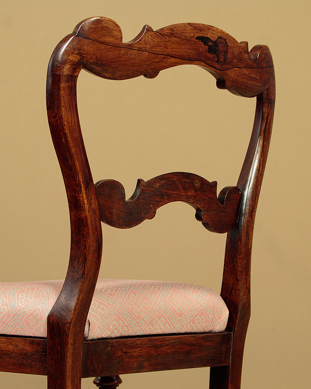 Set of four mid 19th.c. rosewood dining chairs c.1860. Shapely backrest in well figured solid rosewood with carved detail to the cresting rails and stretchers. Removable seat pads upholstered in a woven fabric. Seat height 17". Moulded rail to the front edge below the seat. Raised on good turned and segmented front legs. Very good colour and condition, cleaned and waxed in our workshops with serviceable upholstery.
